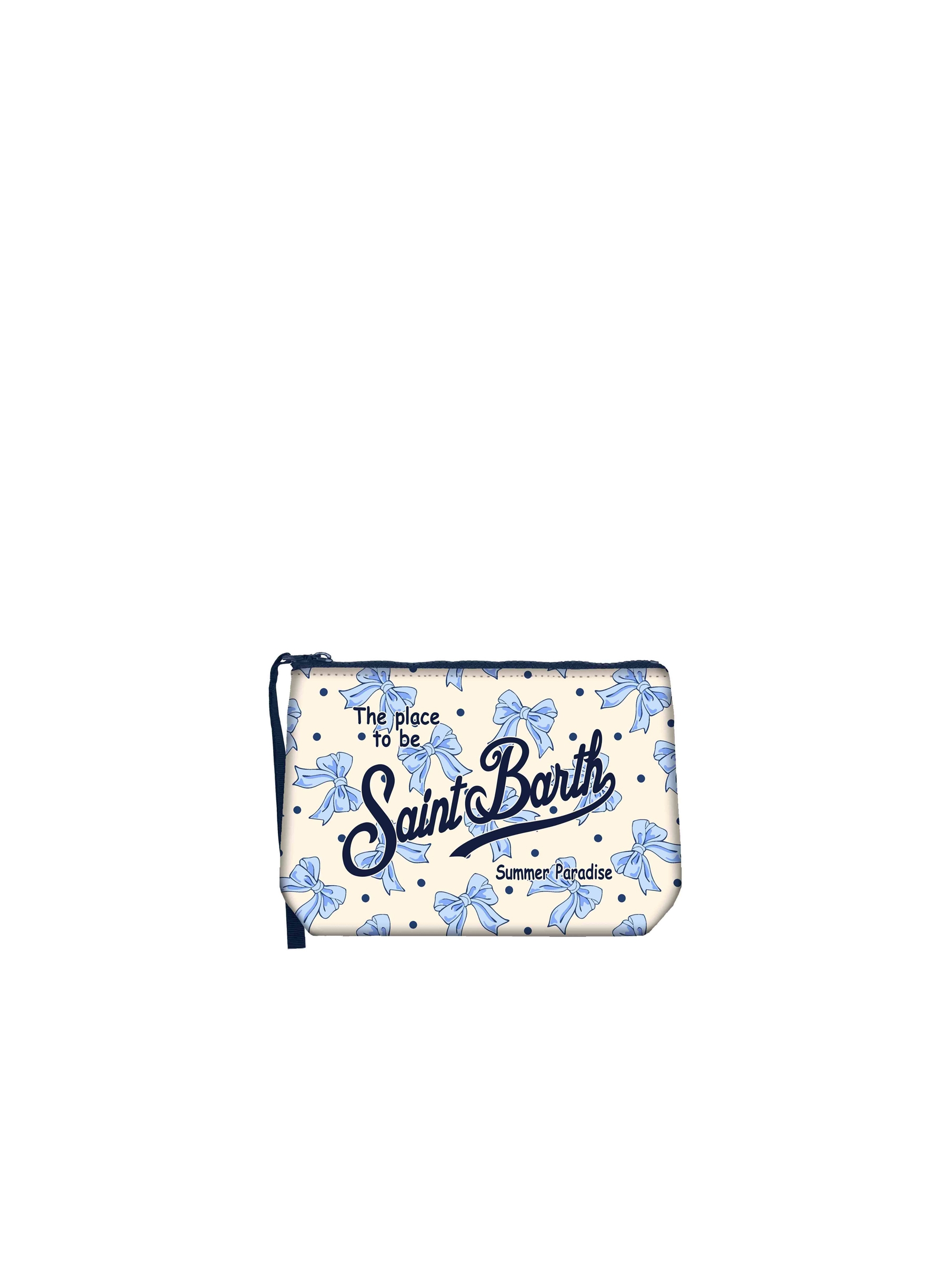 Pochette realizzata in tessuto Scuba, con una raffinata stampa di pois con fiocchi che dona un tocco di vivacità, con chiusura con zip, manicotto laterale in gros grain e maxi logo stampato a contrasto. Versatile e dal design contemporaneo MC2 SAINT BARTH