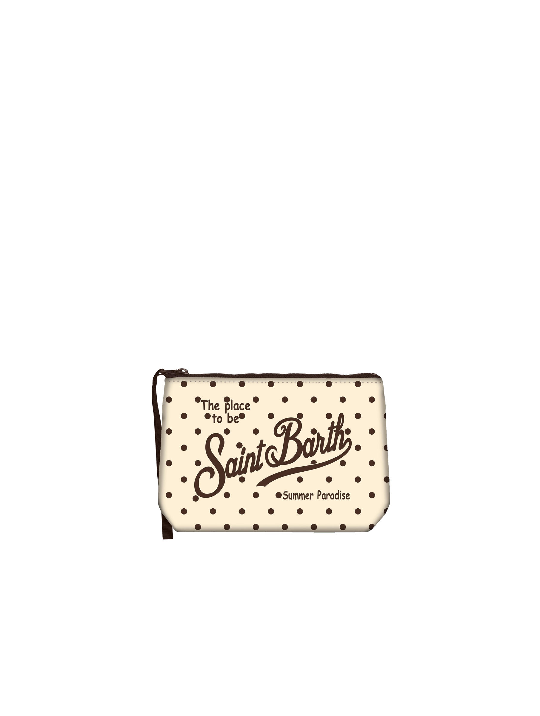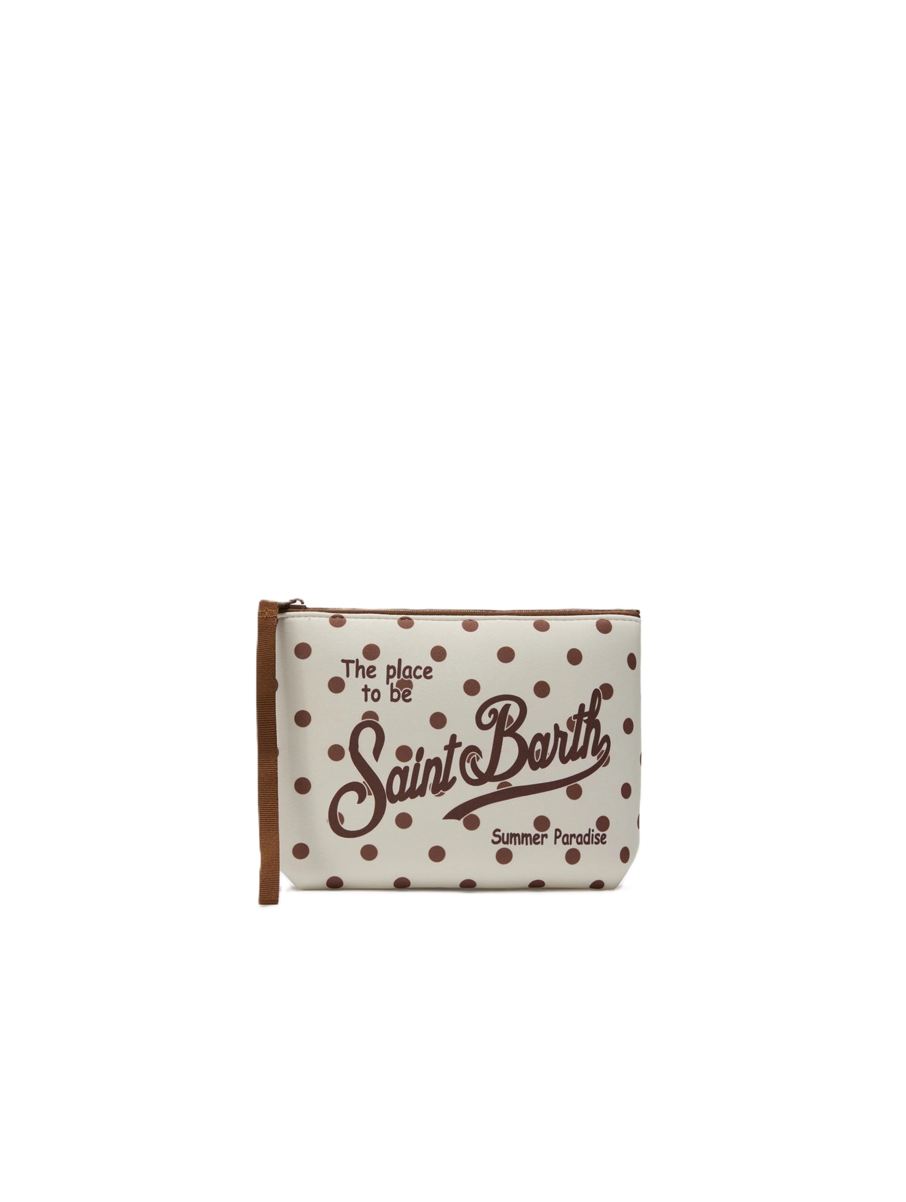 Pochette realizzata in tessuto Scuba, con una raffinata stampa a pois che dona un tocco di eleganza, con chiusura con zip, manicotto laterale in gros grain e maxi logo stampato a contrasto. Versatile e dal design contemporaneo MC2 SAINT BARTH