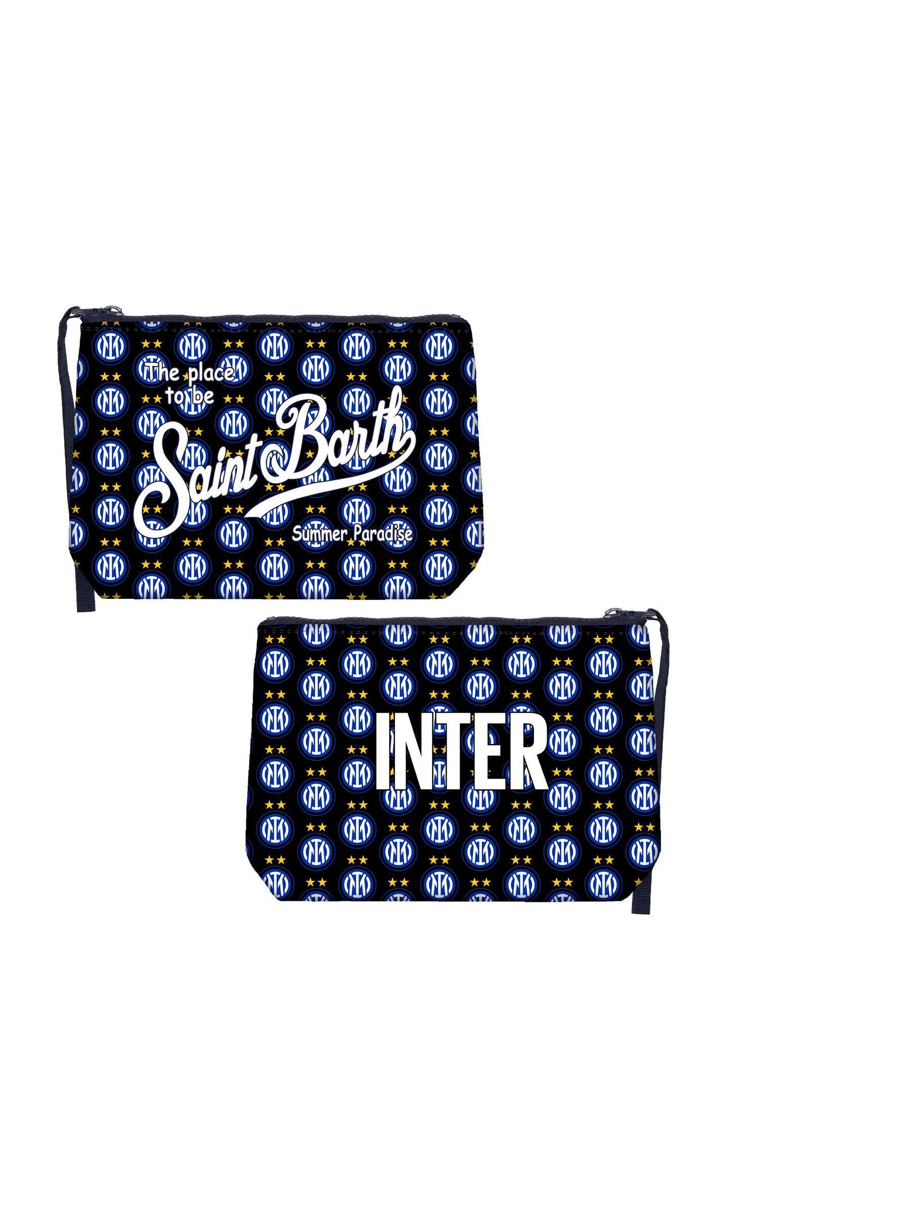 Pochette realizzata in tessuto Scuba, con una particolare stampa di Inter Club con stelline che dona un tocco di sportività, con chiusura con zip, manicotto laterale in gros grain e maxi logo stampato a contrasto. Versatile e dal design contemporaneo MC2 SAINT BARTH