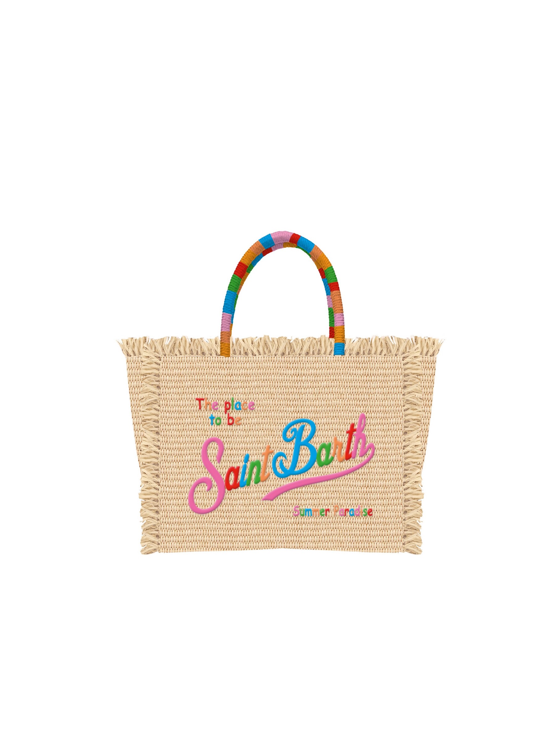 Borsa realizzata in tessuto effetto paglia, con silhouette semi strutturata, profilo sfrangiato, con doppi manici tubolari multicolor, tracolla regolabile e removibile, chiusura con zip, tasca interna e maxi logo ricamato a multicolor sul davanti. Un must-have estivo dal design allegro e vivace. MC2 SAINT BARTH