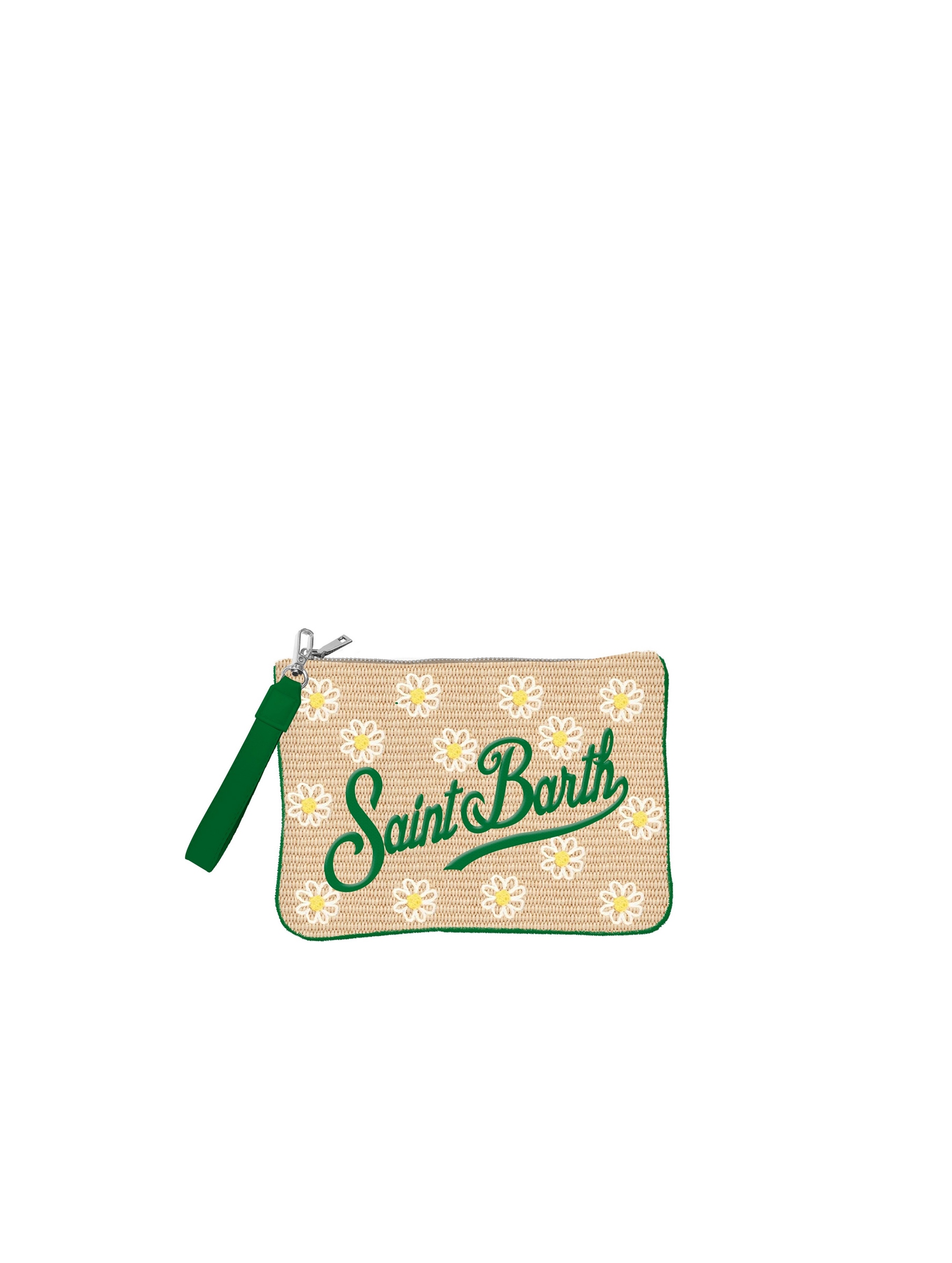 Borsa a marsupio realizzata in tessuto effetto paglia, con chiusura con zip, tasca interna, cinturino da polso removibile, particolare ricamo di margherite all over e maxi logo ricamato a contrasto sul davanti. Un must-have estivo dal design allegro e vivace. MC2 SAINT BARTH