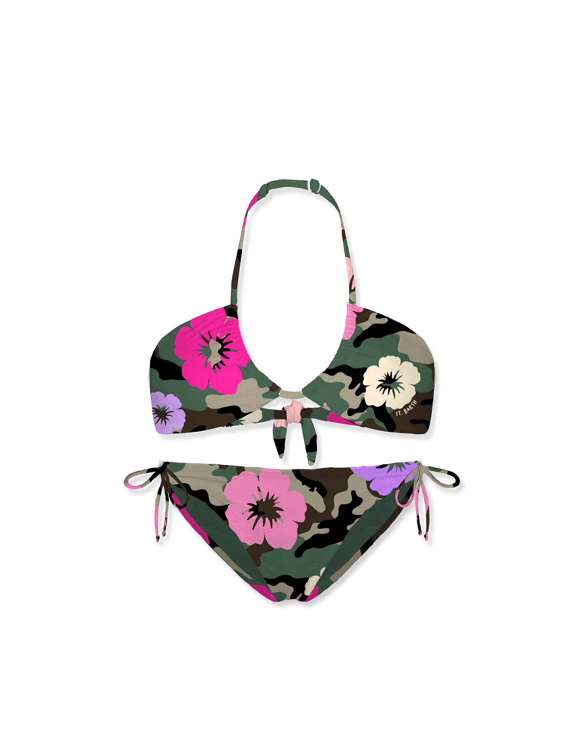 Costume bikini da bambina, realizzato in tessuto stretch morbido e confortevole, con fantasia floreale, top con spalline sottili annodate al collo e sulla schiena per un fit personalizzabile e slip con laccetti laterali. Per un look fashion e trendy. MC2 SAINT BARTH