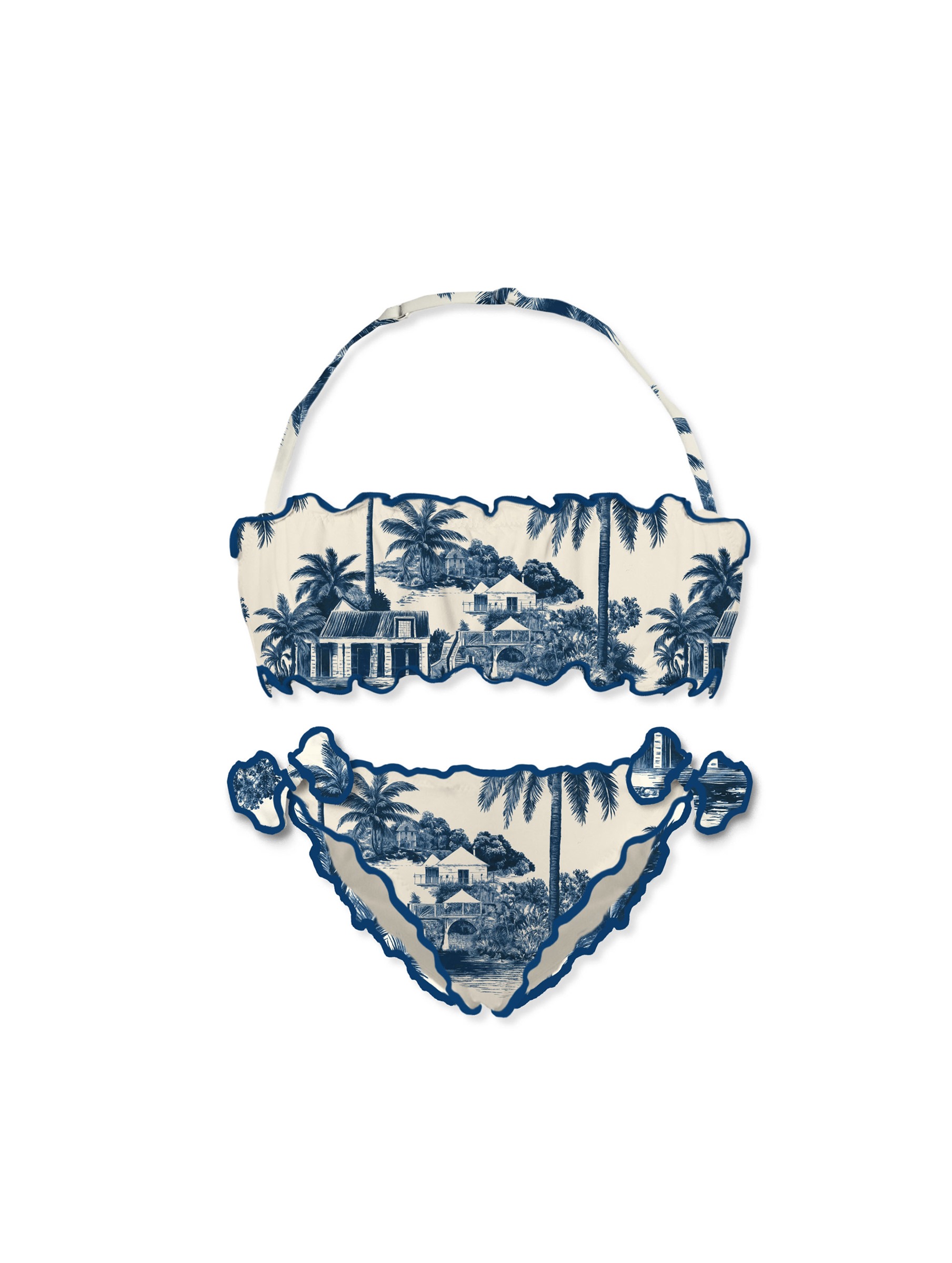 Costume bikini da bambina, realizzato in tessuto stretch morbido e confortevole, con stampa toile de jouy, top a fascia con laccetti regolabili per un fit personalizzabile, slip abbinati con fiocchetti laterali e dettaglio di bordi arricciati. Per un look fashion e chic. MC2 SAINT BARTH