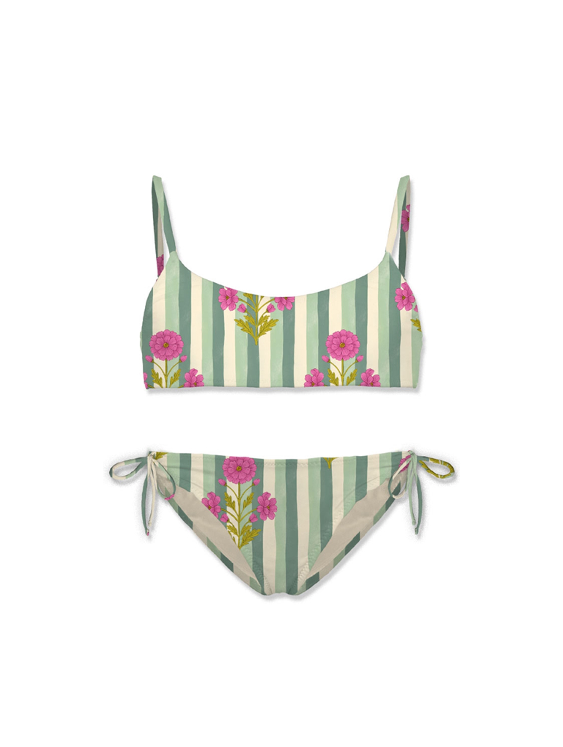 Costume bikini da bambina, realizzato in tessuto stretch morbido e confortevole, con una particolare stampa a righe colorate con fiori, top bralette con spalline regolabili per un fit personalizzabile e slip abbinati con laccetti laterali. Per un look fashion e chic. MC2 SAINT BARTH
