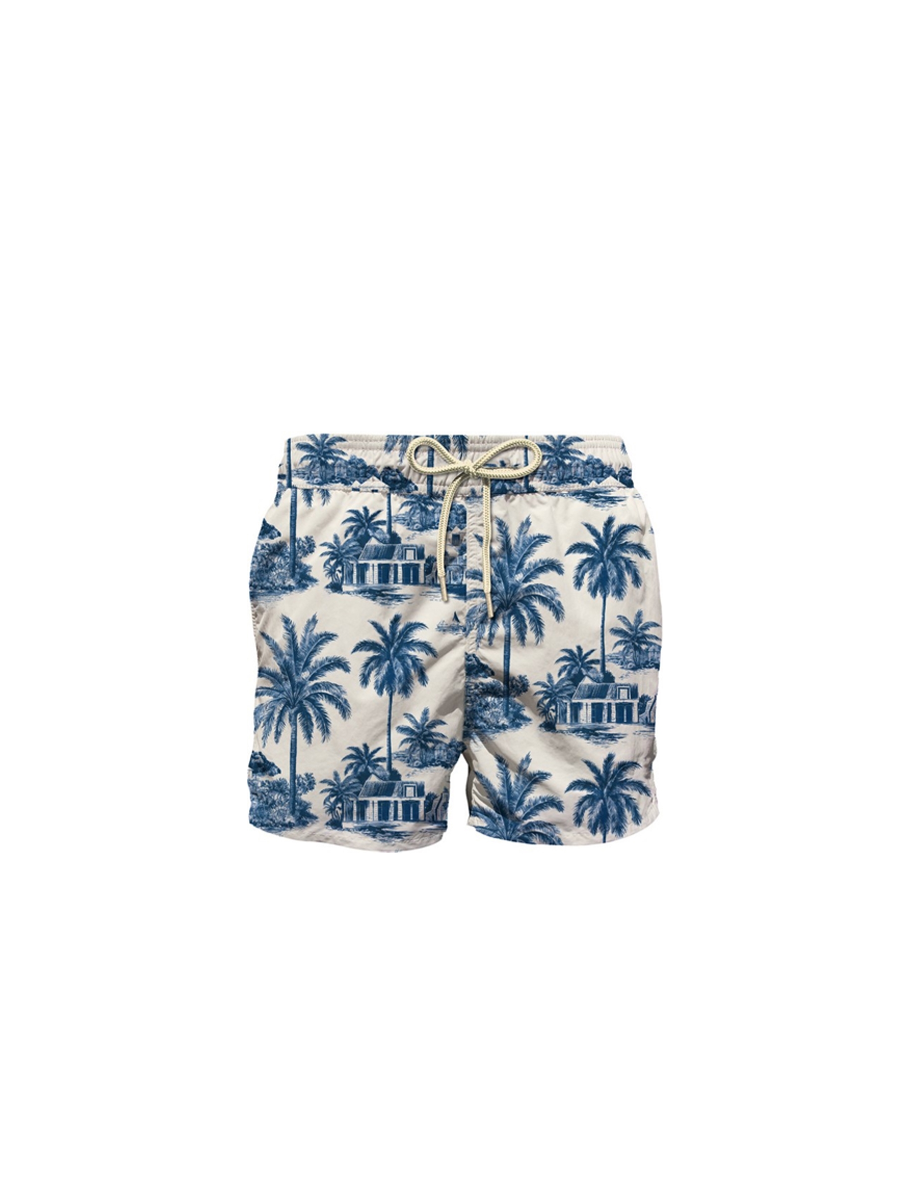 Costume da bambino modello shorts, realizzato in tessuto leggero e traspirante, con vita elasticizzata con coulisse regolabile che garantisce una vestibilità confortevole, tasche laterali e particolare stampa toile de jouy. Per un look trendy e fashion. MC2 SAINT BARTH