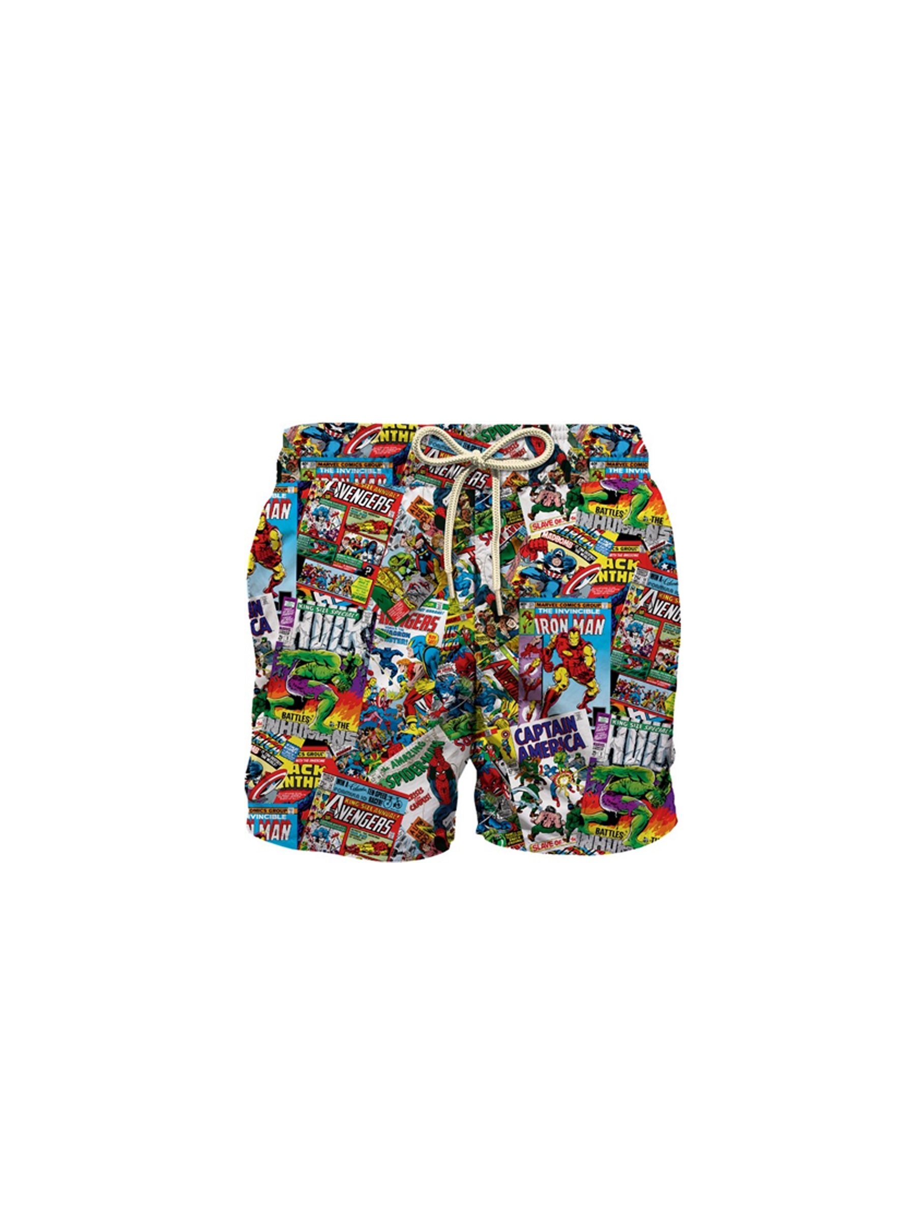 Costume da bambino modello shorts, realizzato in tessuto leggero e traspirante, con vita elasticizzata con coulisse regolabile che garantisce una vestibilità confortevole, tasche laterali e particolare stampa delle copertine dei fumetti dei supereroi Marvel. Per un look trendy e fashion. MC2 SAINT BARTH