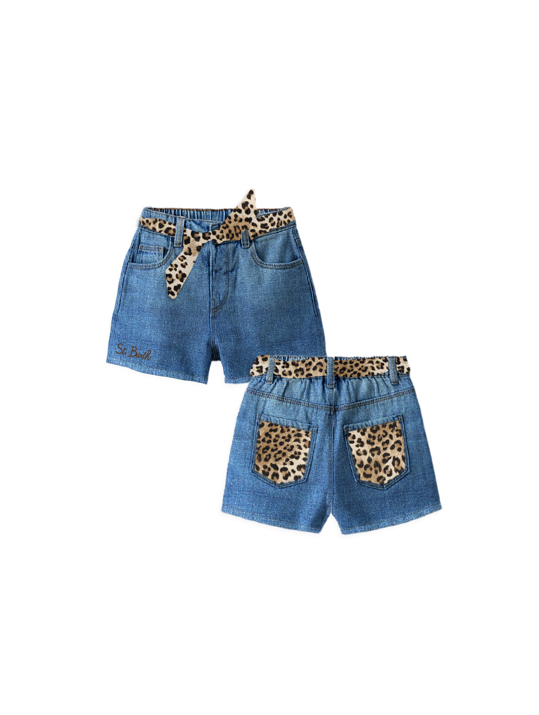 Shorts in denim dal lavaggio chiaro, con vita elasticizzata, passanti in vita, chiusura con zip nascosta e bottone centrale, modello 5 tasche, con cintura a nastro leopardata, applicazione di toppe leopardate sulle tasche posteriori e logo lettering sul fondo davanti. Per un look trendy e chic. MC2 SAINT BARTH