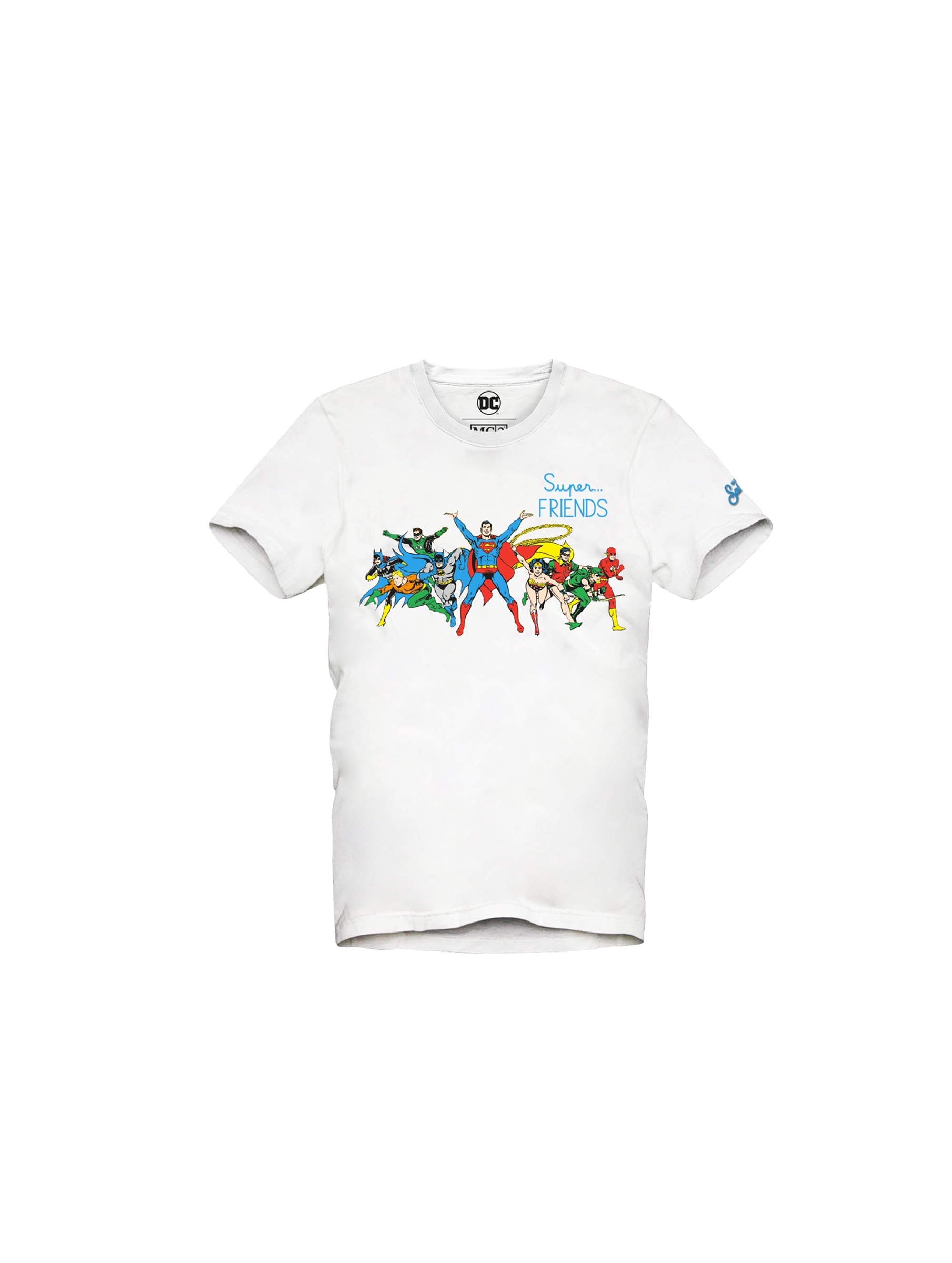 T-shirt in cotone a maniche corte, dalla vestibilità regular, con scollo rotondo, a tinta unita, con piccolo logo lettering a contrasto sulla manica sinistra e maxi stampa grafica di personaggi Marvel Super Friends sul davanti. Per un look casual e trendy. MC2 SAINT BARTH