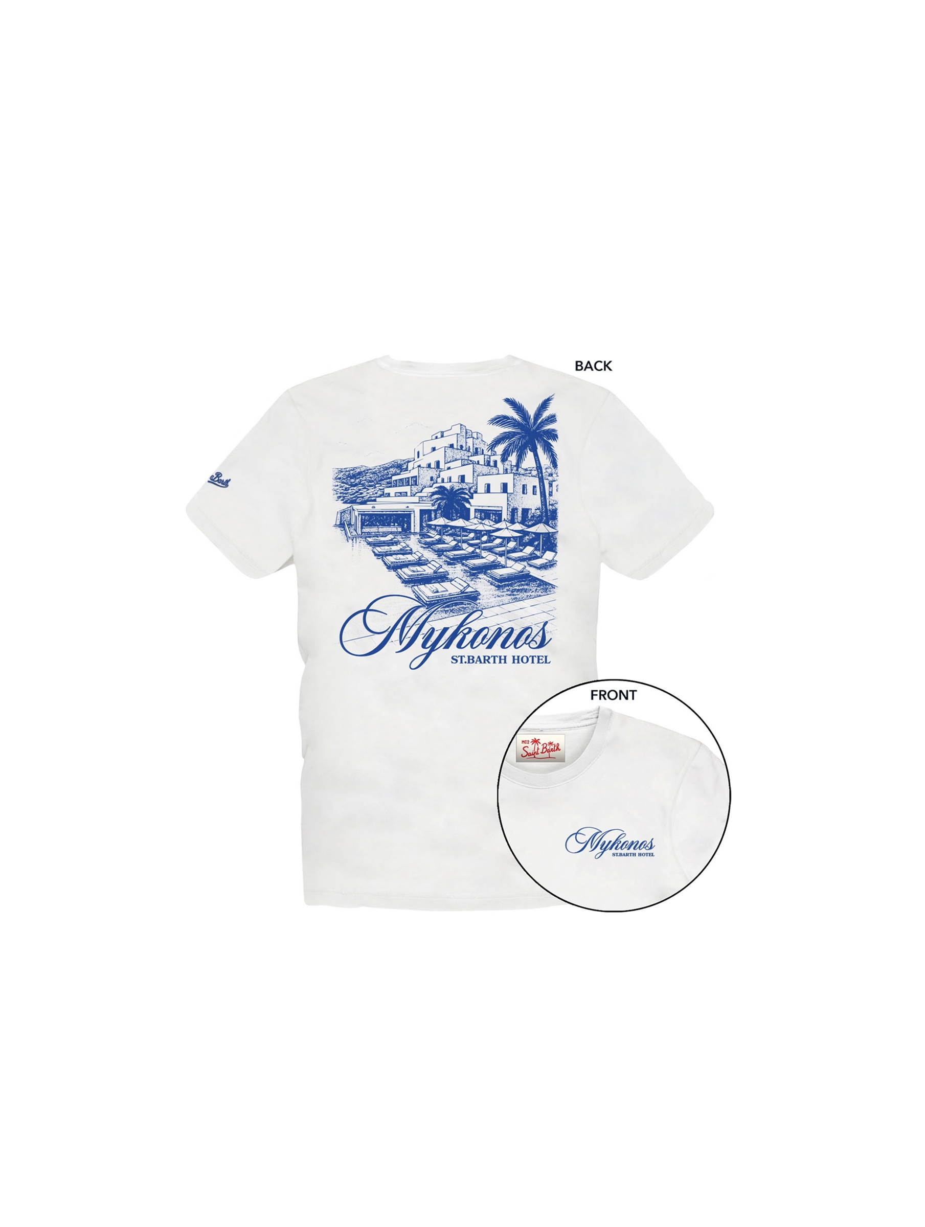 T-shirt in cotone a maniche corte, dalla vestibilità regular, con scollo rotondo, a tinta unita, logo lettering a contrasto sulla manica sinistra, piccola decorazione lettering sul petto e maxi stampa grafica di Mykonos Hotel postcard sul retro. Per un look casual e trendy. MC2 SAINT BARTH