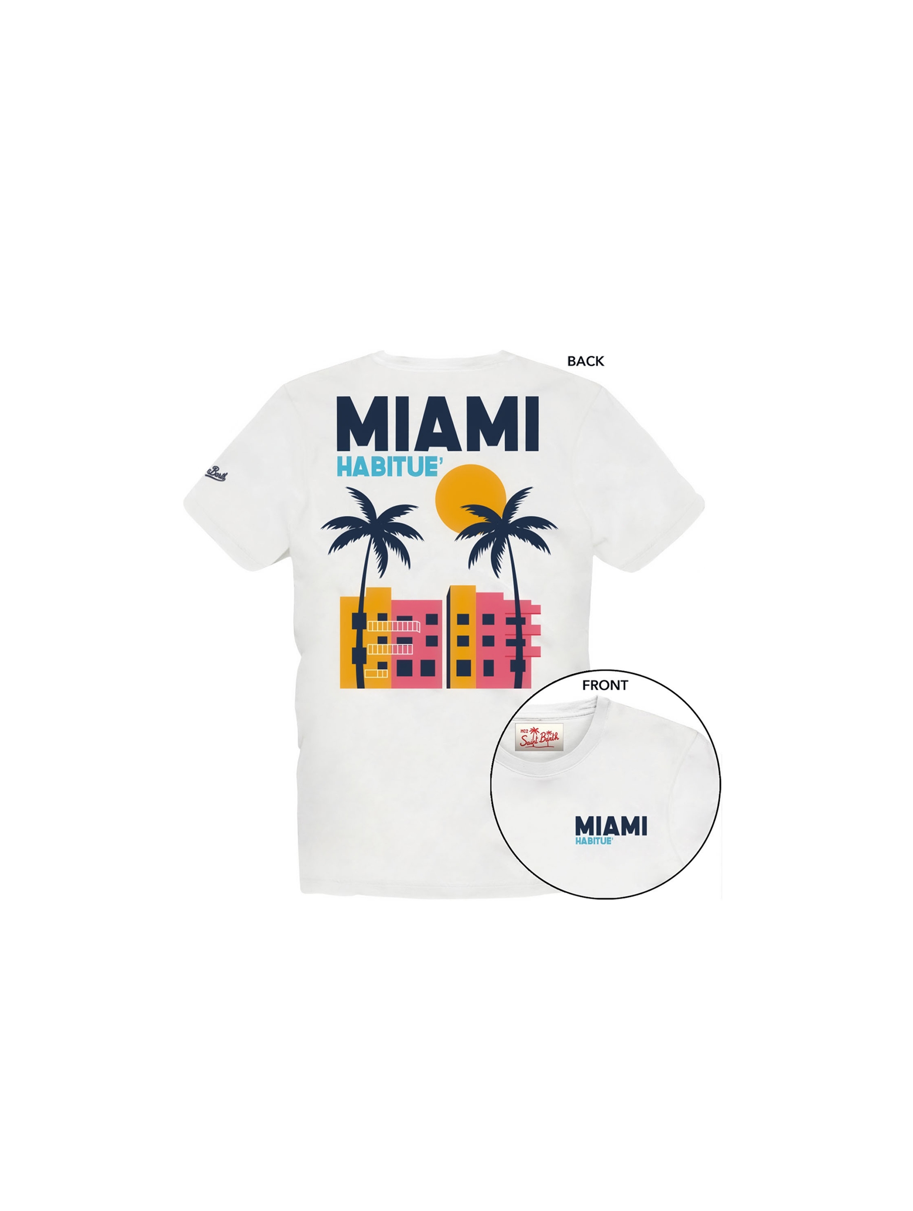 T-shirt in cotone a maniche corte, dalla vestibilità regular, con scollo rotondo, a tinta unita, logo lettering a contrasto sulla manica sinistra, piccola decorazione lettering sul petto e maxi stampa grafica di Miami summer postcard sul retro. Per un look casual e trendy. MC2 SAINT BARTH