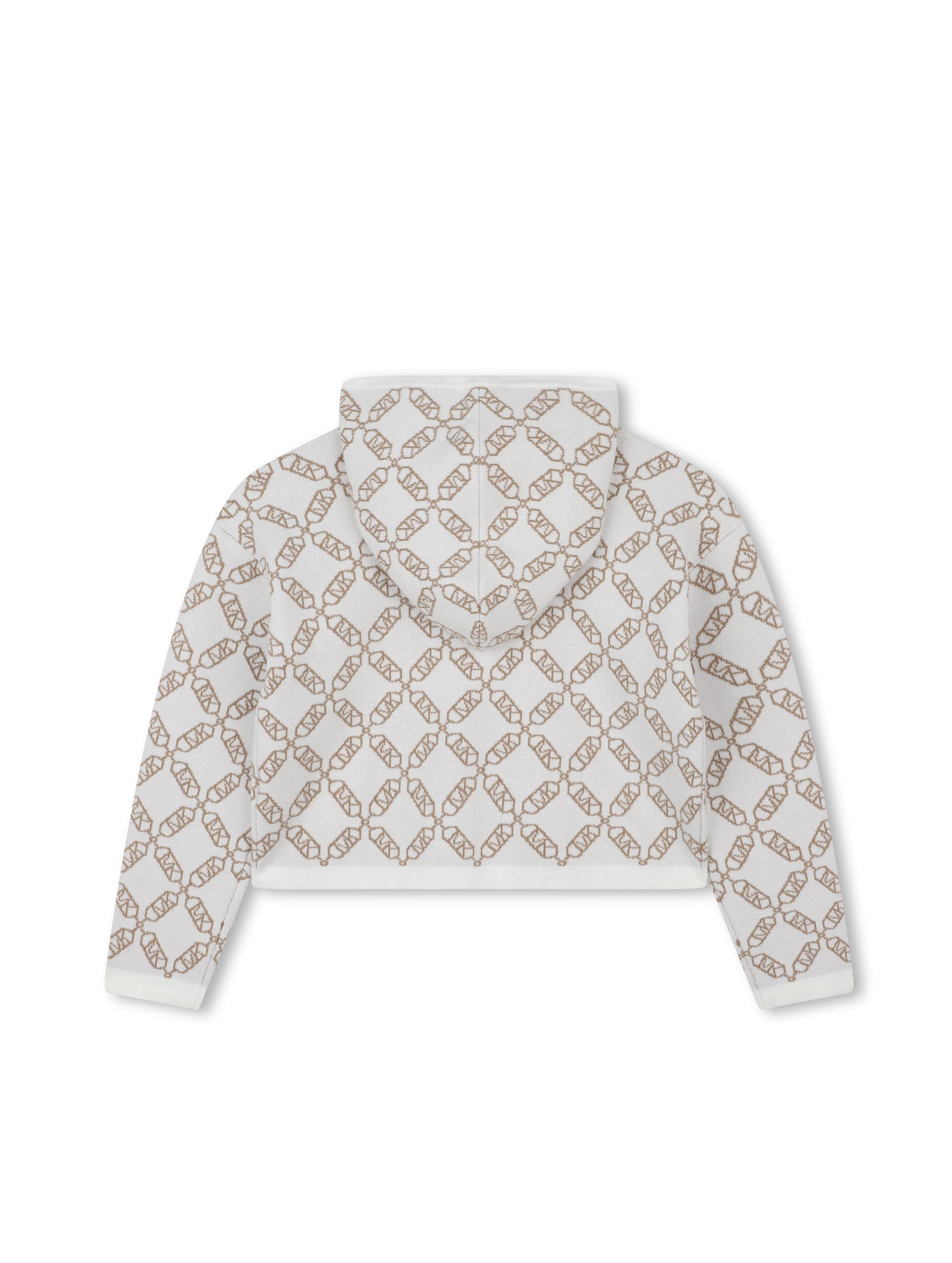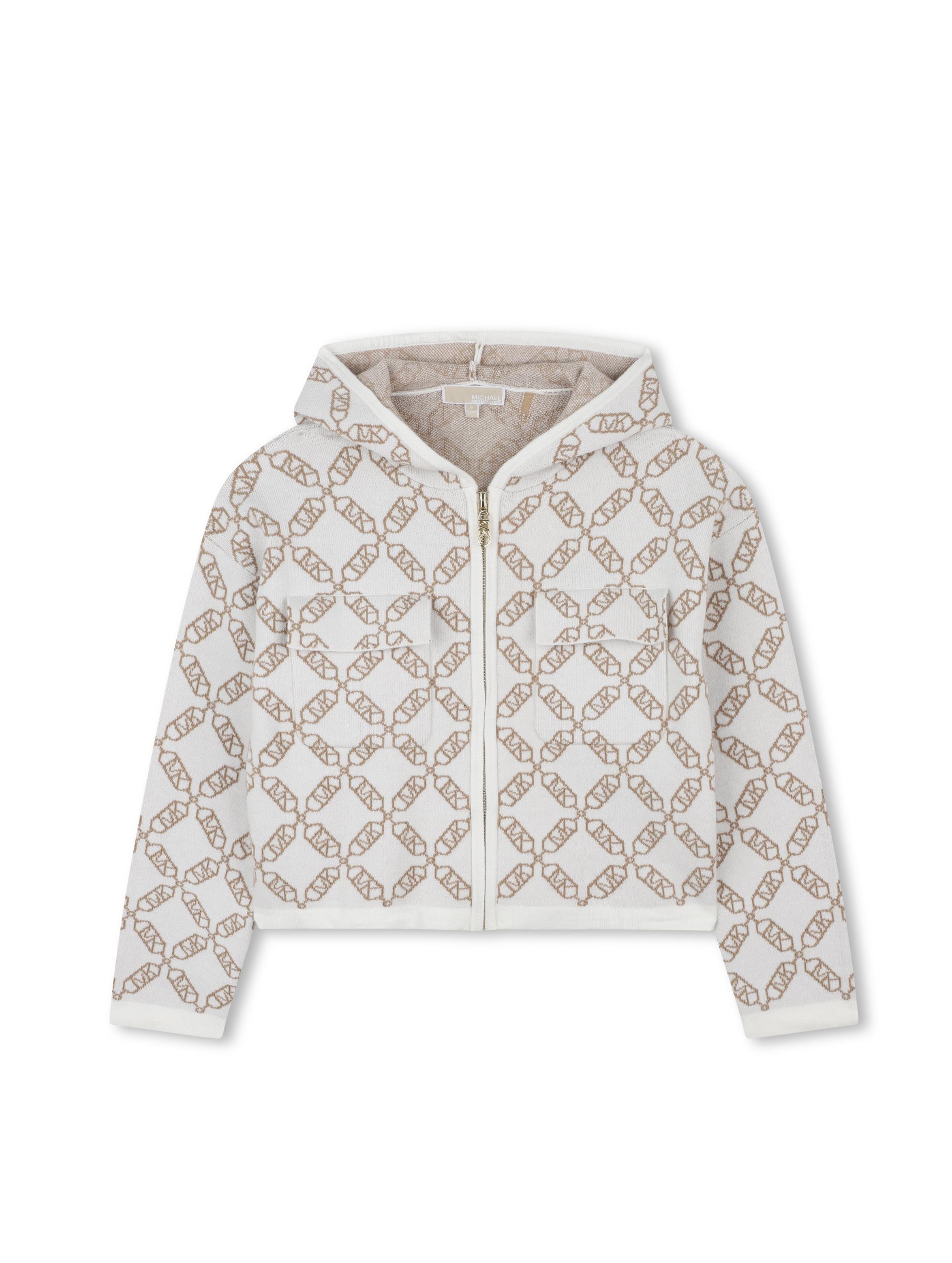 Cardigan con cappuccio a maniche lunghe, in tricot, con bordo e polsini a costine, apertura con zip metallica centrale, tirazip logato, tasche a toppa con patta applicate sul petto e logo MK jacquard all over. Per un look trendy e fashion. MICHAEL KORS