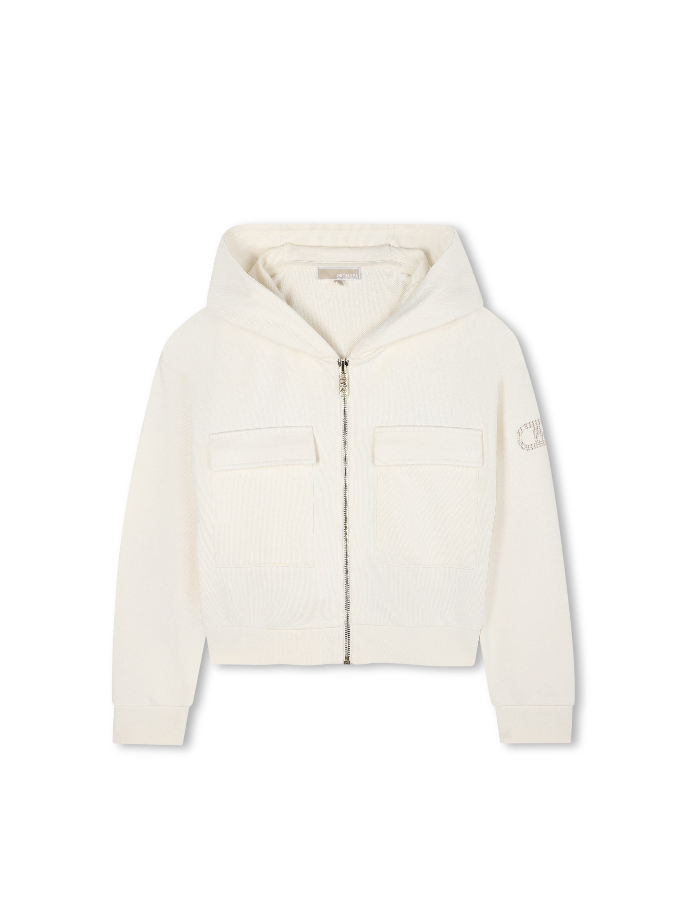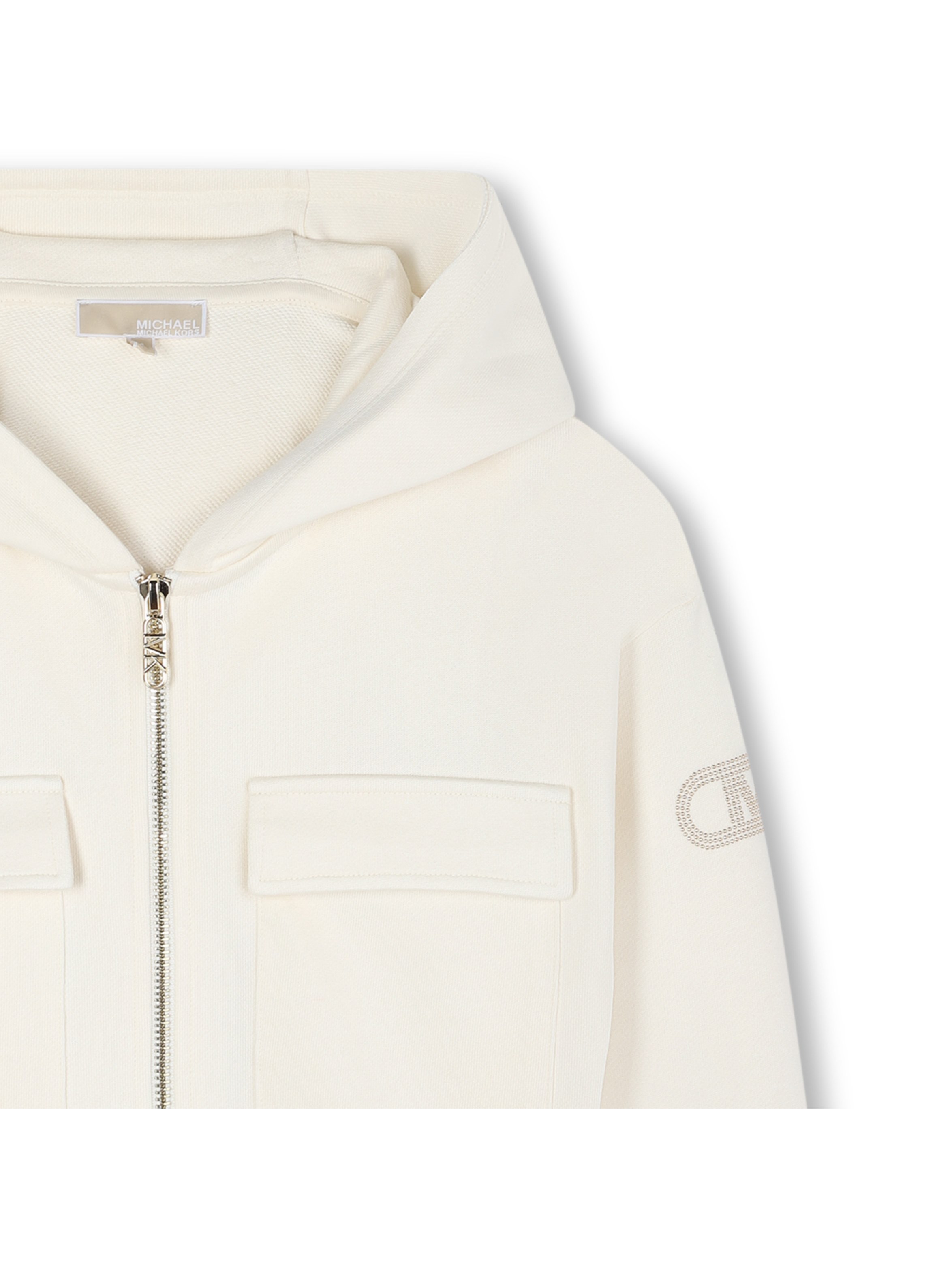 Felpa con cappuccio a maniche lunghe, a tinta unita, con bordo e polsini a costine, apertura con zip metallica centrale, tirazip logato, tasche a toppa con patta applicate sul petto e logo MK in strass sulla manica. Per un look trendy e fashion. MICHAEL KORS