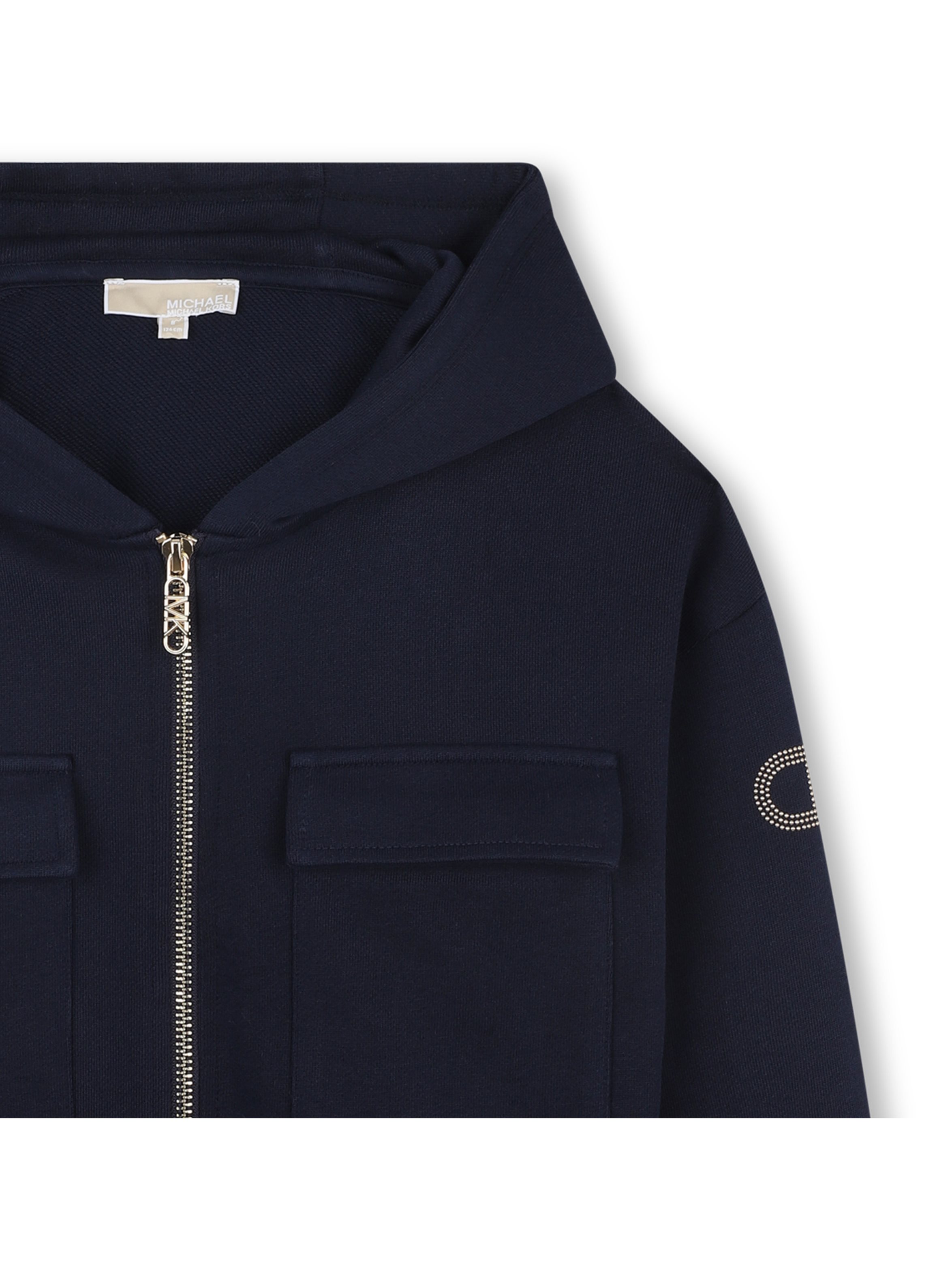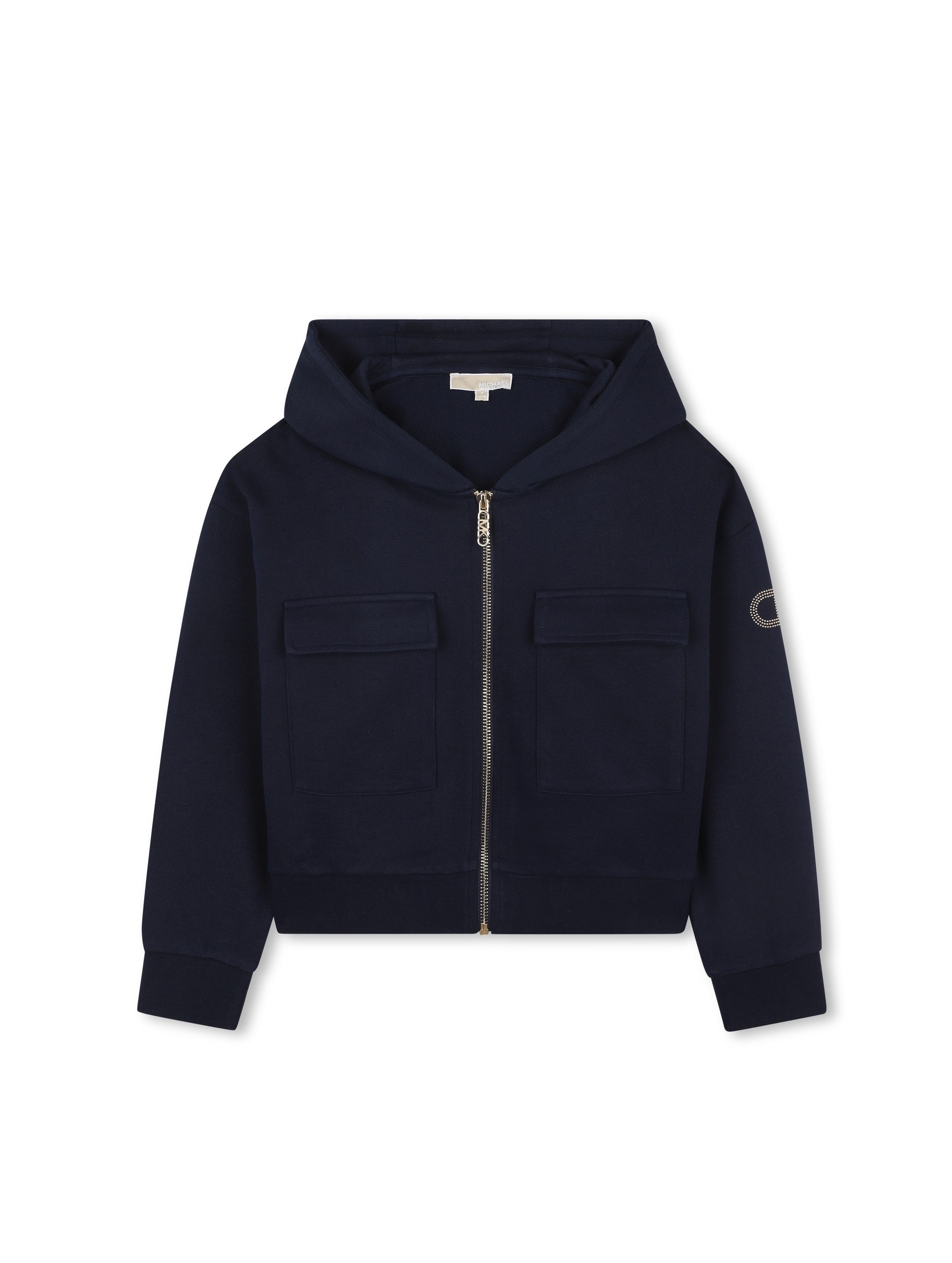 Felpa con cappuccio a maniche lunghe, a tinta unita, con bordo e polsini a costine, apertura con zip metallica centrale, tirazip logato, tasche a toppa con patta applicate sul petto e logo MK in strass sulla manica. Per un look trendy e fashion. MICHAEL KORS