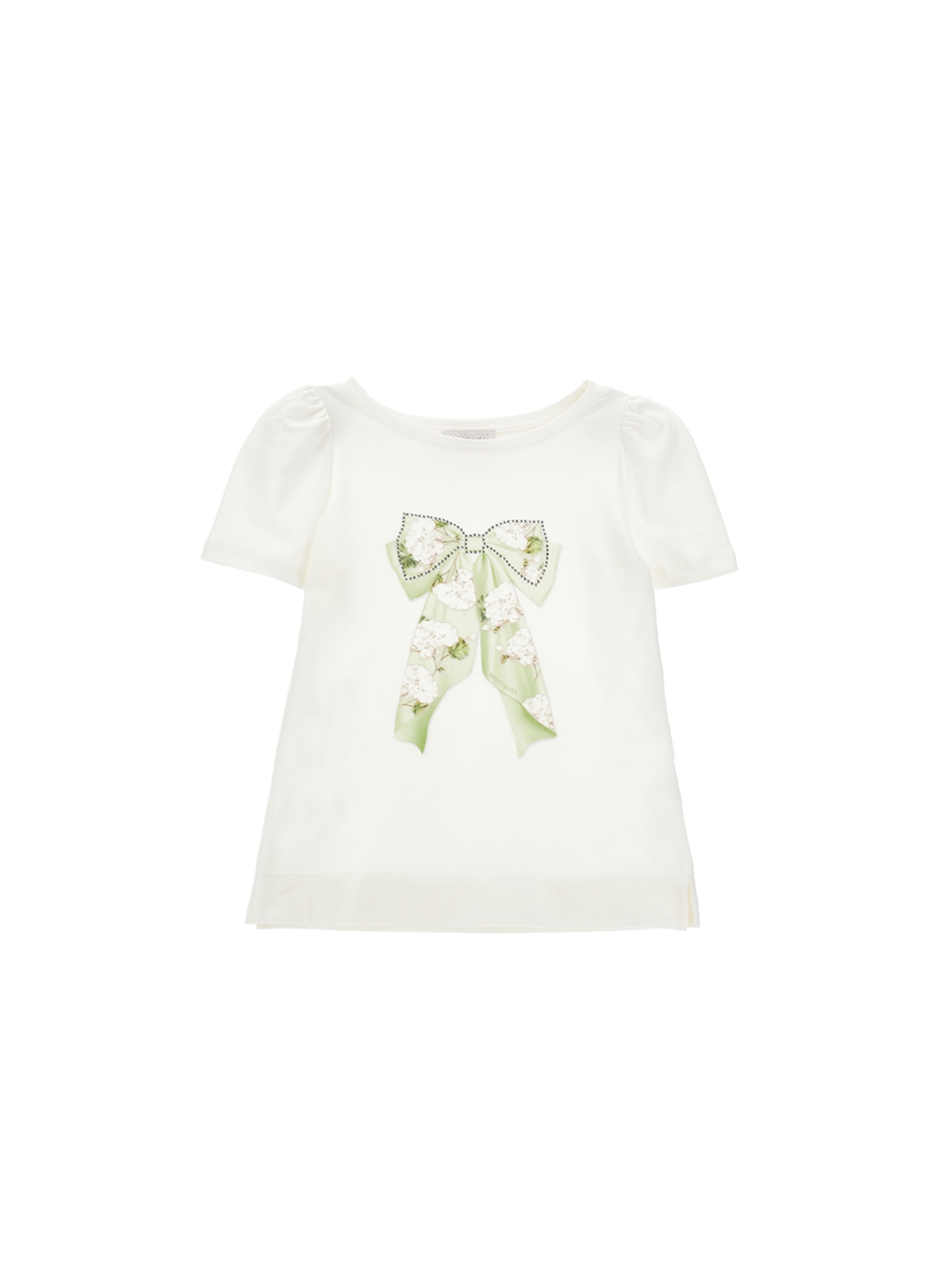 T-shirt a maniche corte in jersey di cotone, morbido e confortevole, a tinta unita, scollo rotondo, con stampa fiocco nel centro davanti, maniche dal taglio elegante e dettagli in strass. Perfetta per look casual chic. MONNALISA