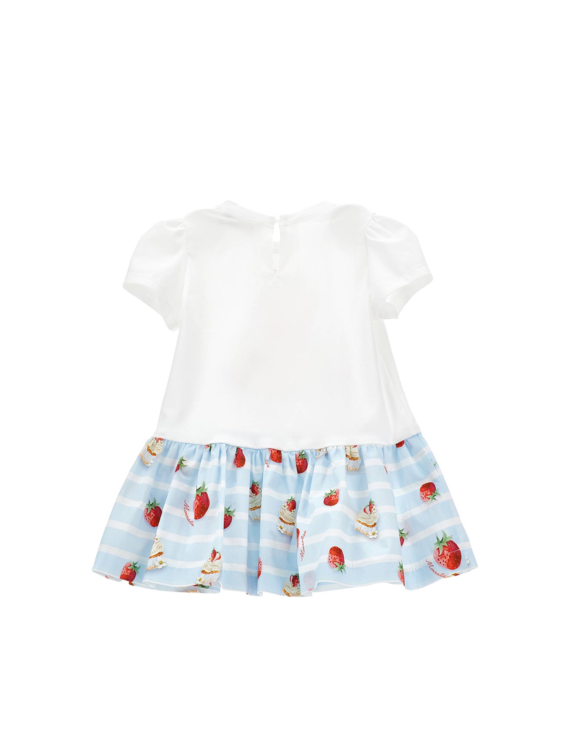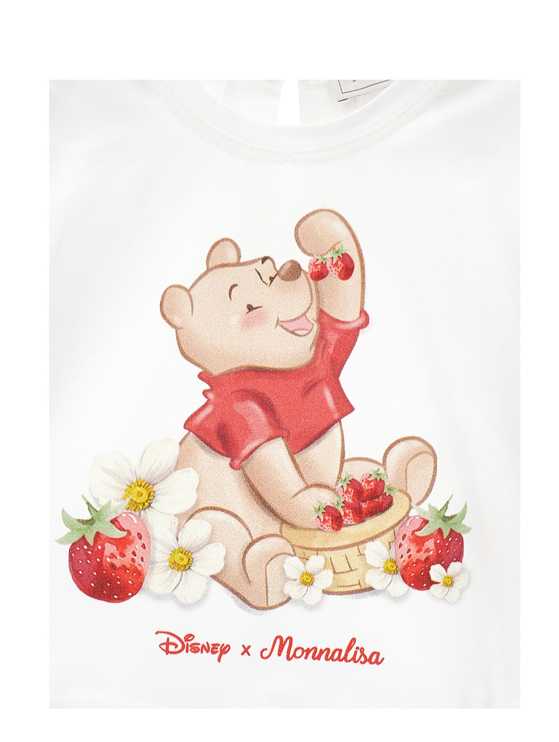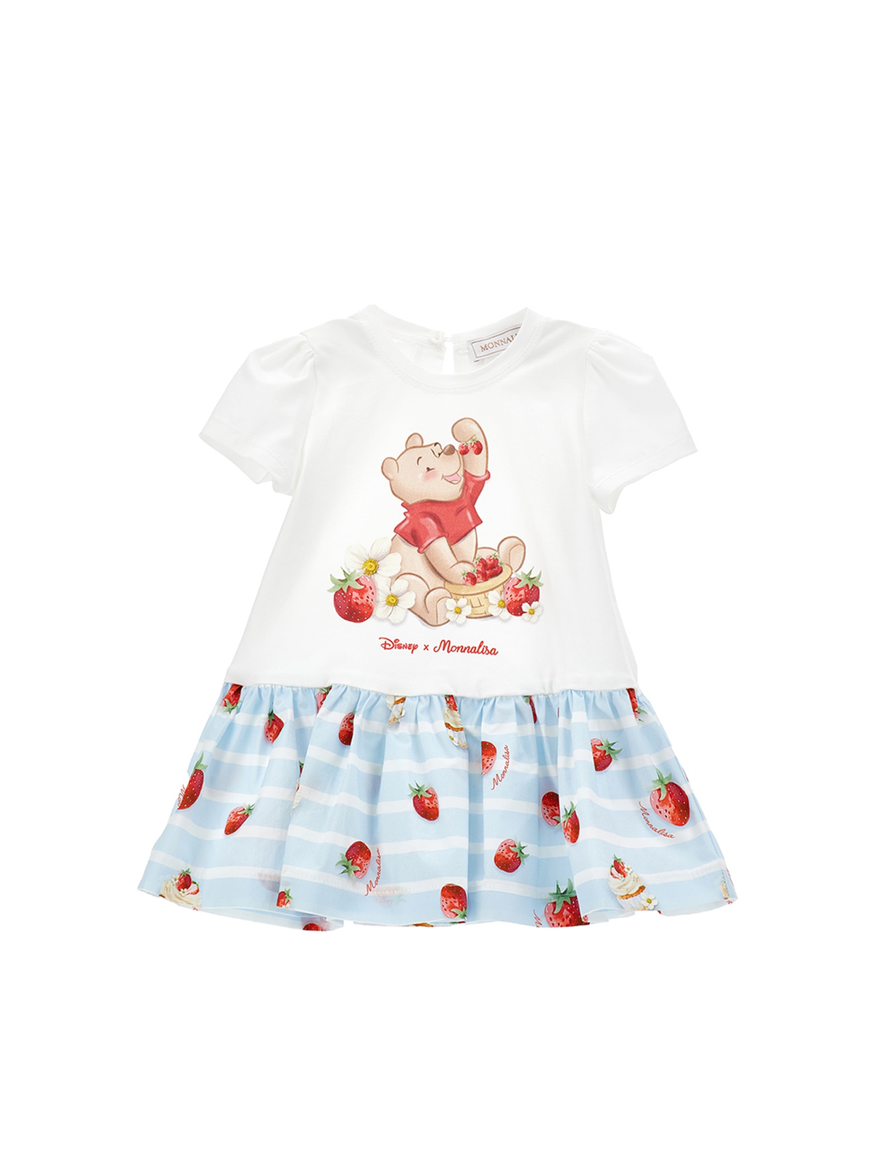 Abito in morbido e confortevole jersey di cotone, con deliziosa stampa di Winnie The Pooh che gioca con le fragole, gonna a righe decorata con stampa di fragole e dolci all over, con maniche corte e chiusura posteriore con bottone per un facile accesso. Ideale per look dolci e sbarazzini. MONNALISA