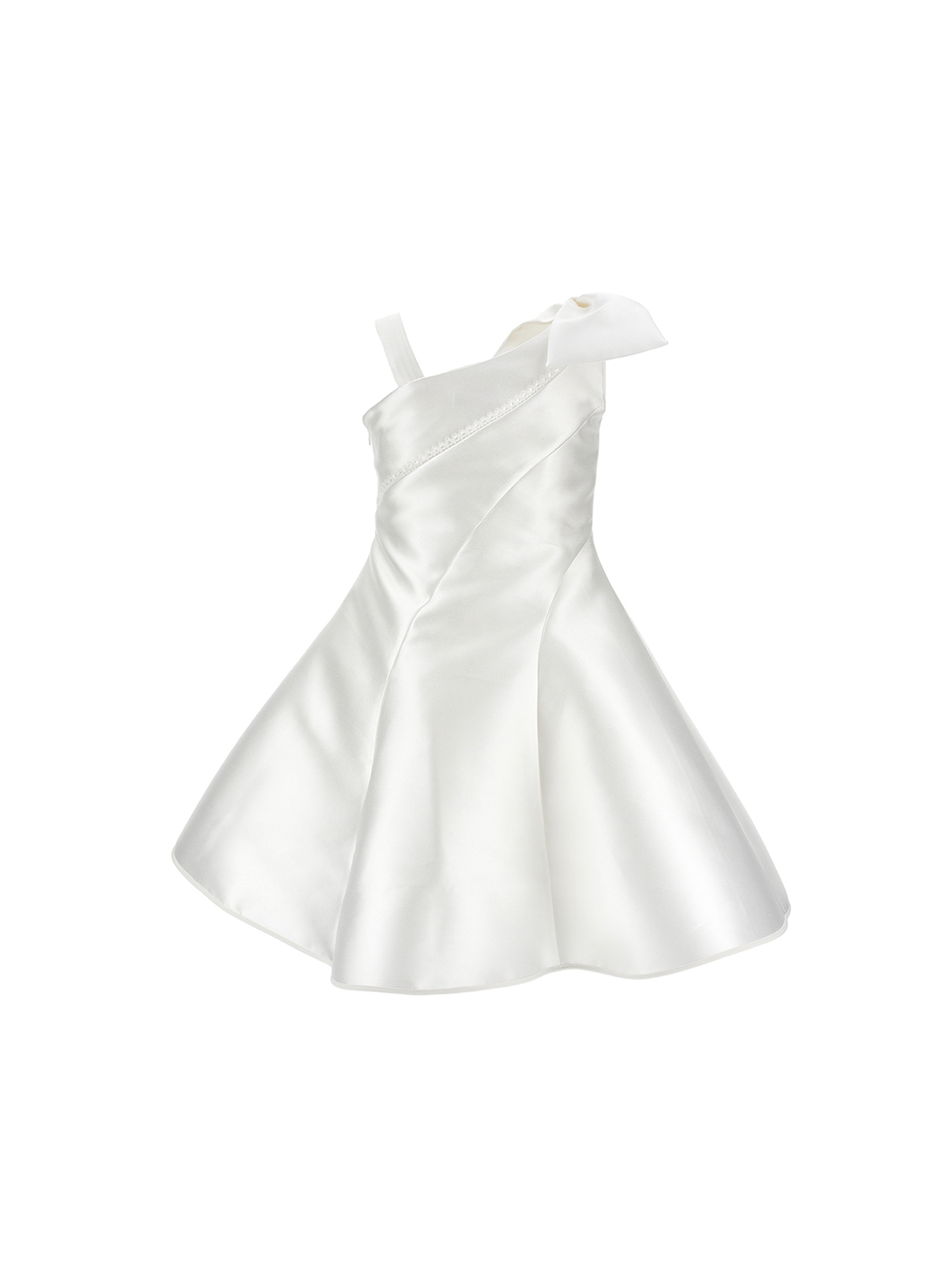 Abito monospalla dal design elegante, realizzato in tessuto lucido e liscio, con fiocco decorativo applicato su una spalla, con gonna ampia per movimenti liberi e chiusura laterale con zip nascosta. Ideale per cerimonie o eventi speciali per un look sofisticato. MONNALISA