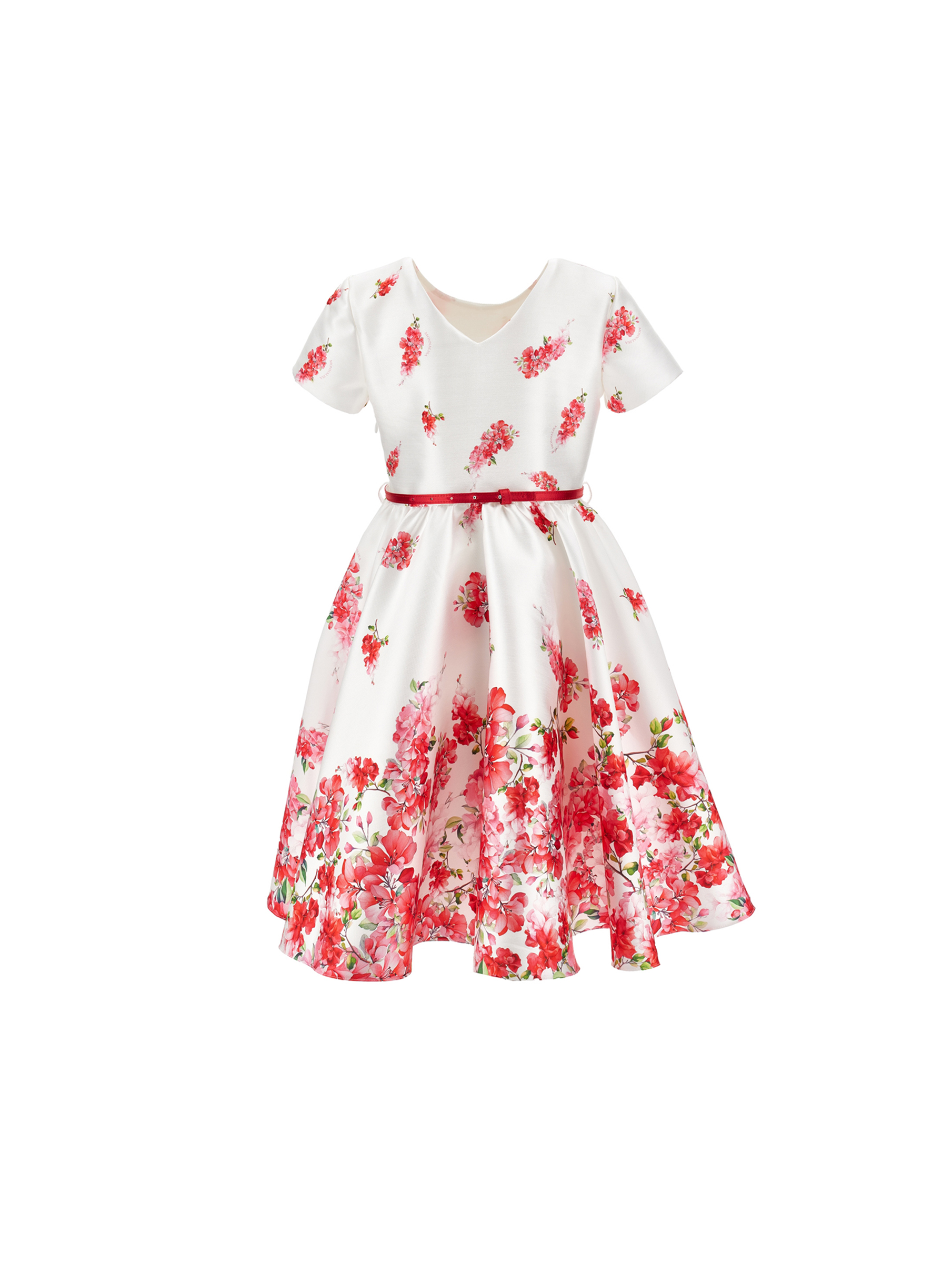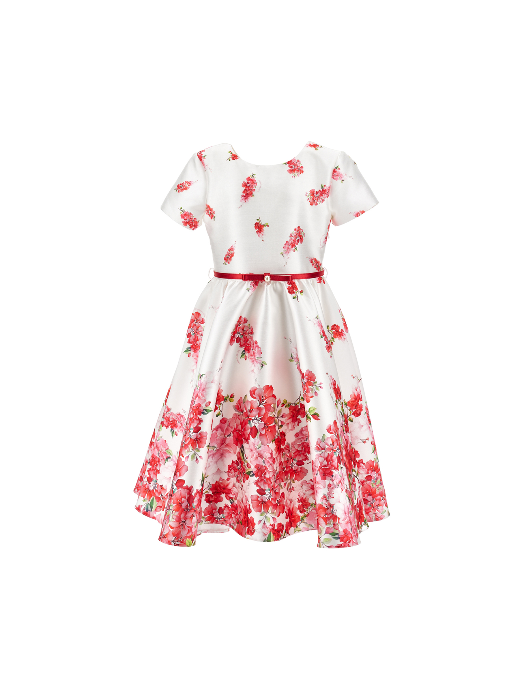 Abito in tessuto mikado di alta qualità, per comfort e durata, dal design a ruota, con elegante stampa floreale all over, maniche corte e cintura in vita per vestibilità regolabile. Perfetto per cerimonie e occasioni speciali per look eleganti e chic. MONNALISA