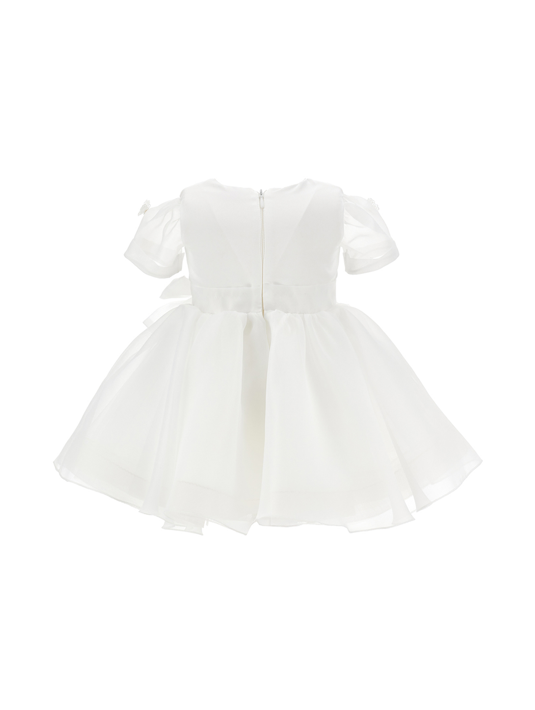 Elegante abito in doppia organza, con dettagli in pizzo sul corpetto per un tocco raffinato, maniche corte decorate con applicazione a forma di farfalla in pizzo, gonna a ruota in organza leggera e vaporosa, cintura decorativa con elegante fiocco in vita e chiusura posteriore con zip, pratica e comoda da indossare. Per look da principessa. MONNALISA