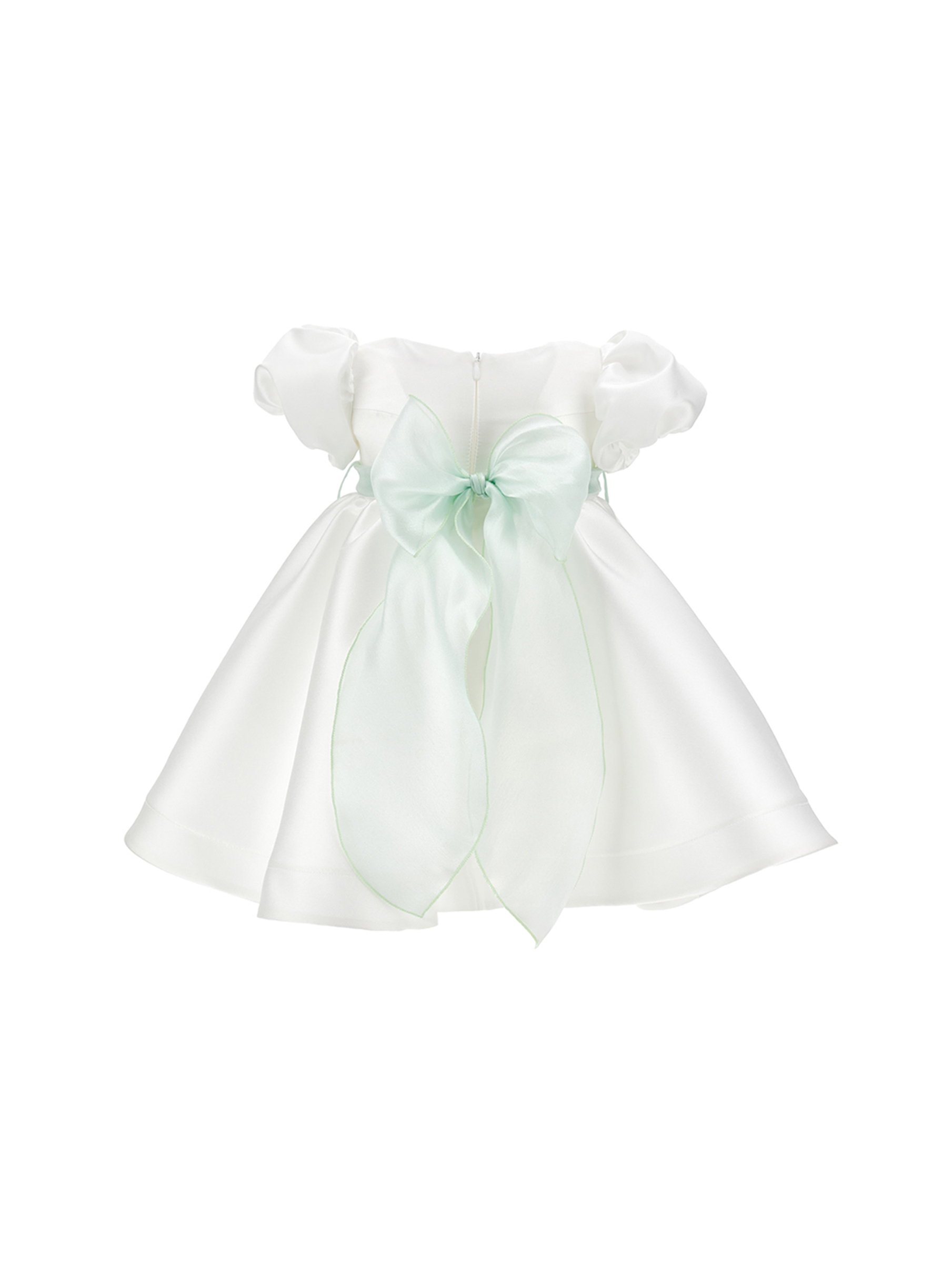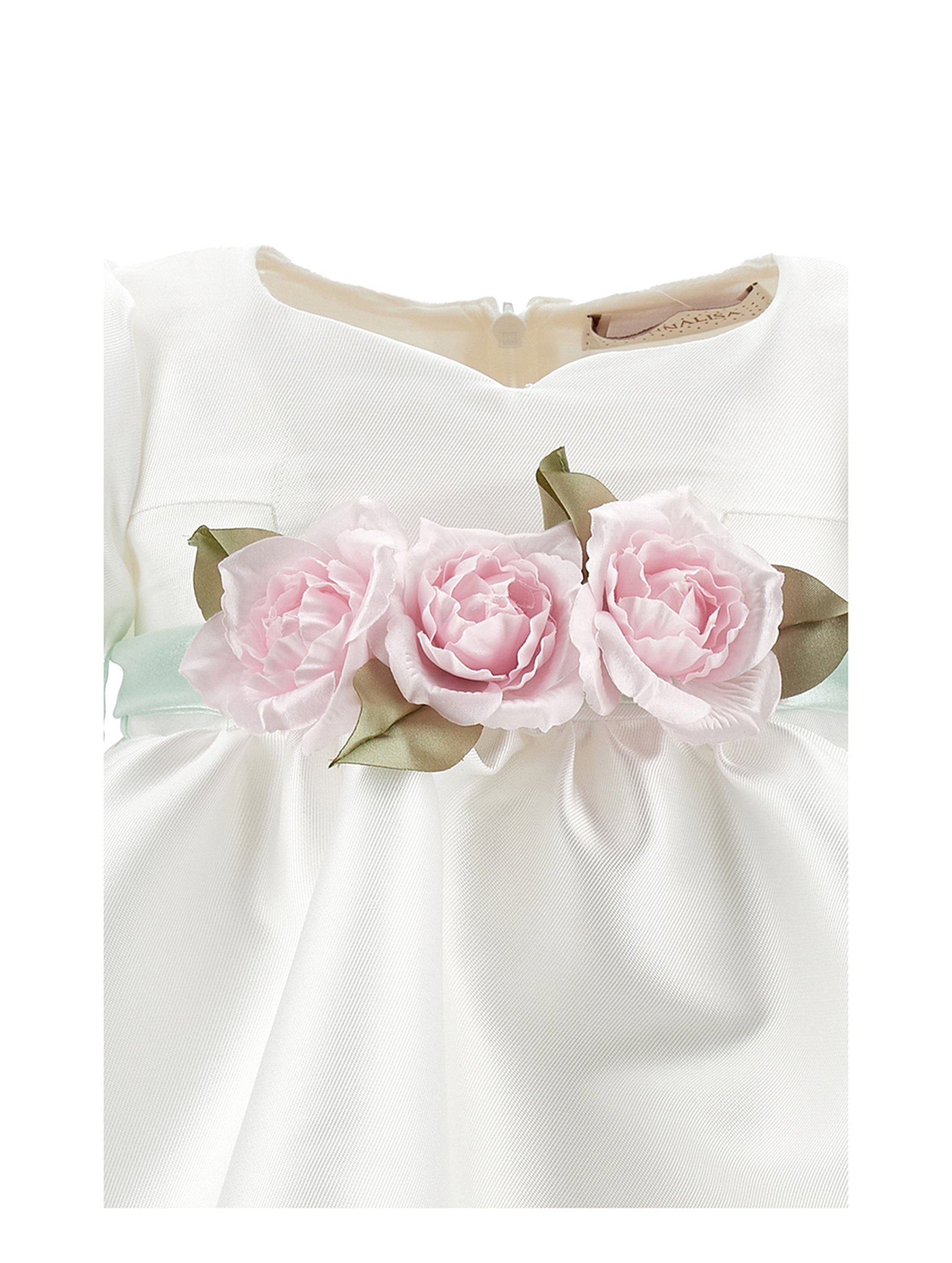 Abito elegante a maniche corte, realizzato in morbido e confortevole tessuto mikado, con maniche a palloncino che aggiungono un tocco chic e raffinato, cintura in vita decorata con applicazione floreale sul davanti e grande fiocco posteriore, per un effetto da vera principessa e chiusura posteriore con zip invisibile, per una vestibilità comoda e pratica. Perfetto per cerimonie e occasioni speciali. MONNALISA