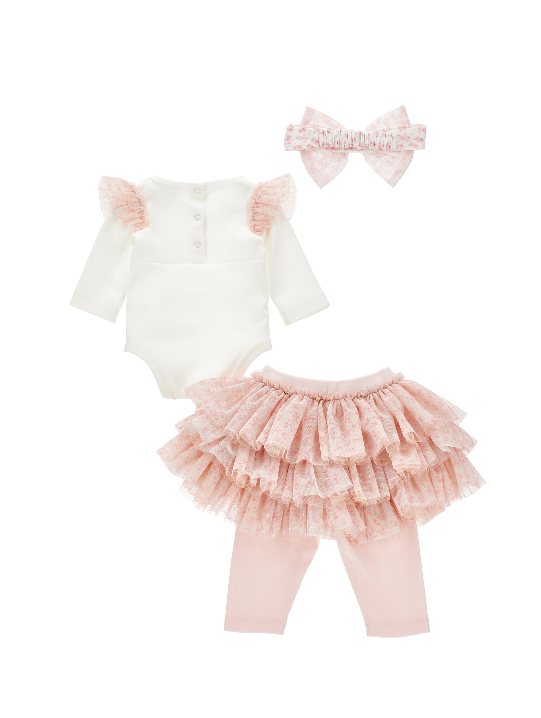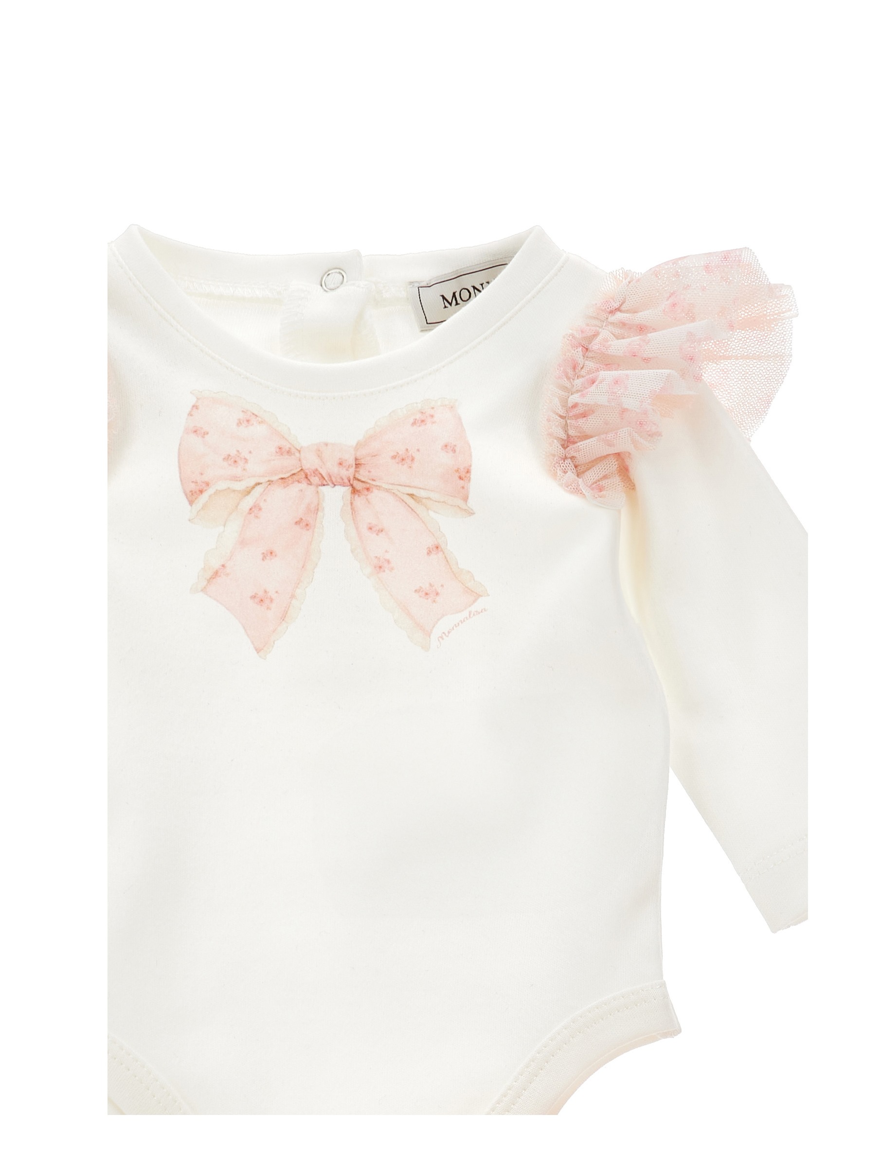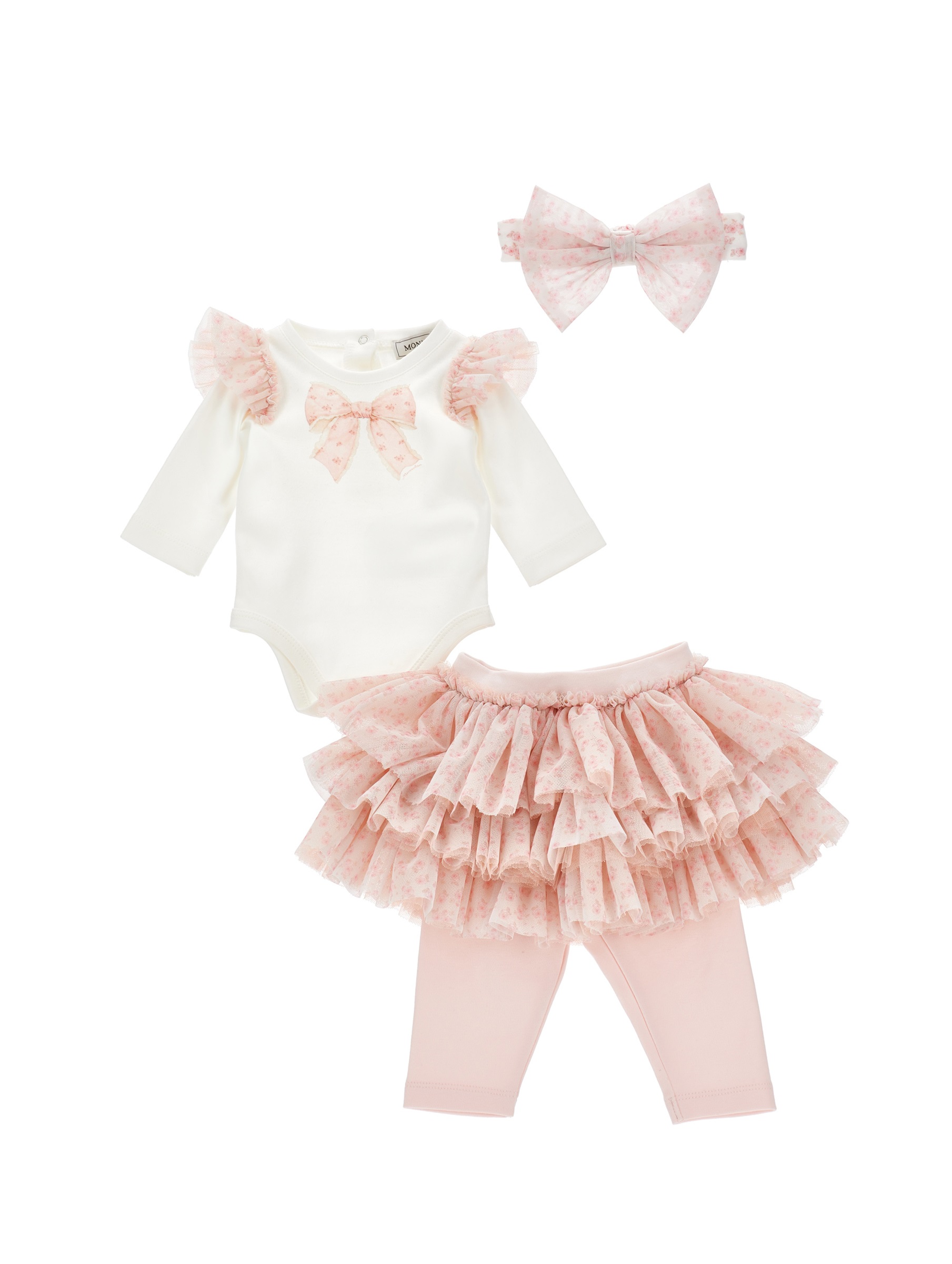 Il set tutù perfetto per la tua piccola, ideale per cerimonie o feste. Facile da indossare grazie alla chiusura frontale, è un capo elegante con dettagli in fiocco e ruches. Body con fiocco centrale, gonna tutù a strati in tulle e fascia con grande fiocco. MONNALISA