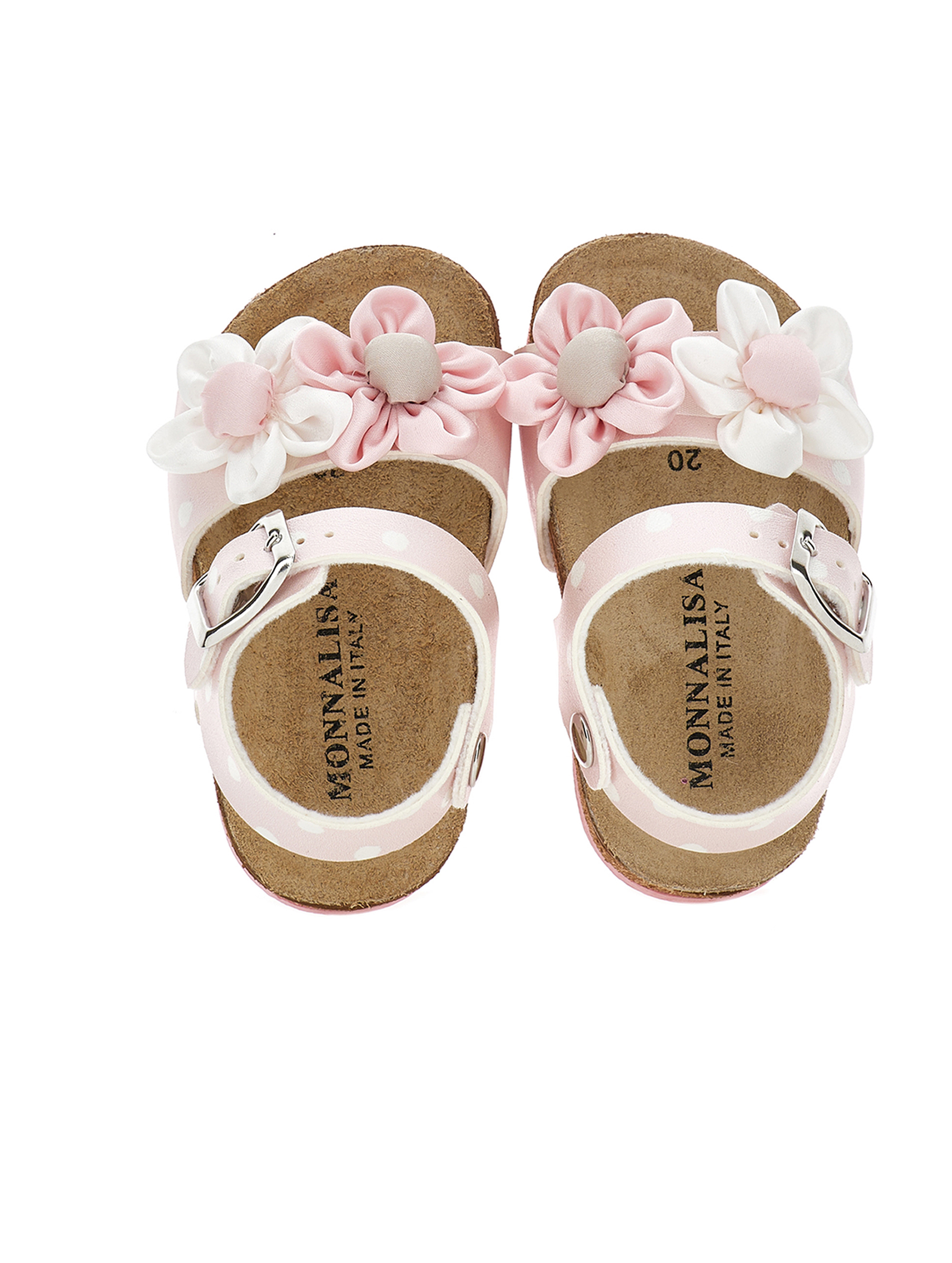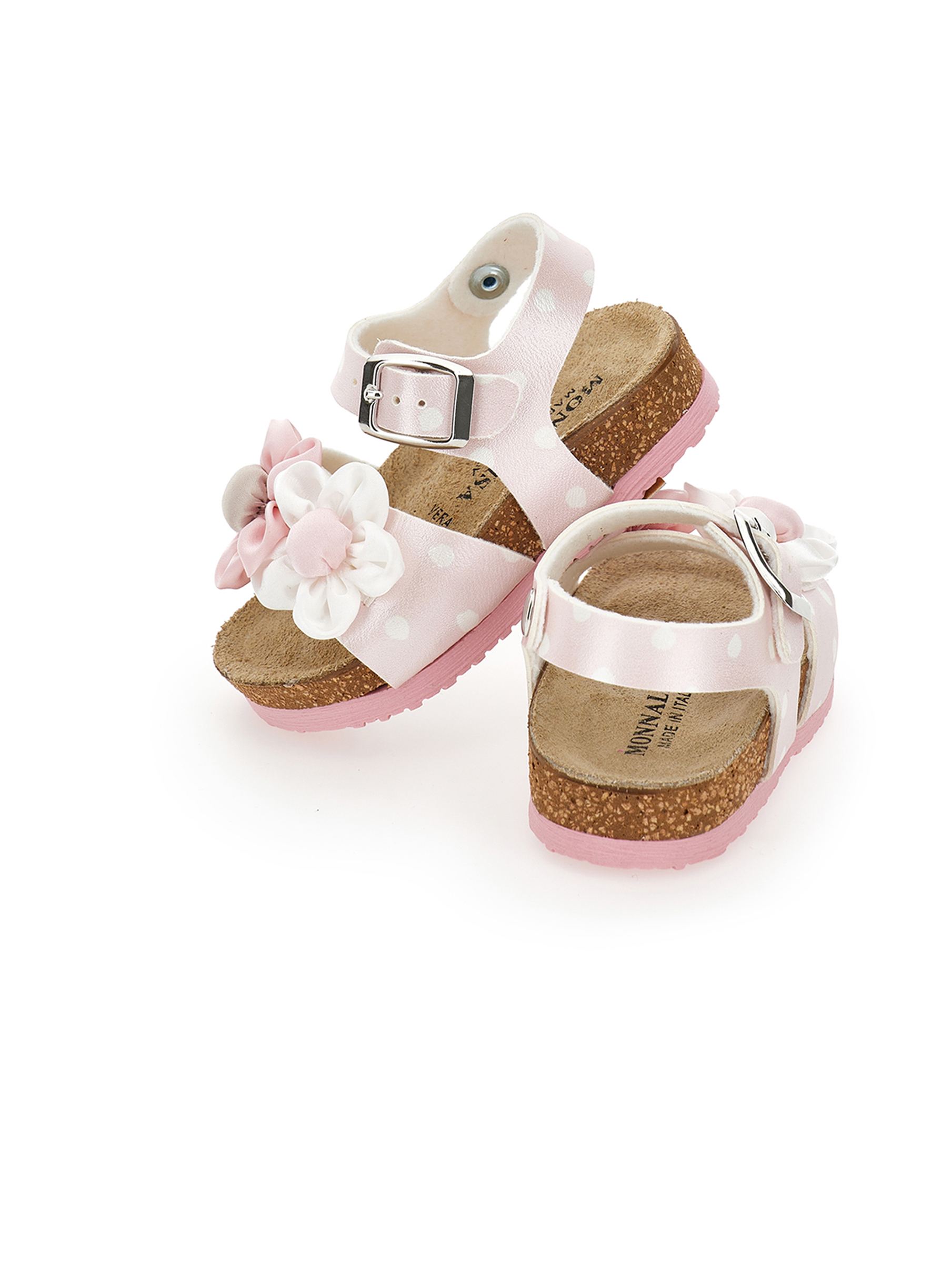 Sandali con stampa a pois, con applicazioni floreali a forma di margherita sulla fascia, con fibbia regolabile per una vestibilità sicura, plantare ergonomico per il massimo comfort e suola antiscivolo per la massima sicurezza. Realizzati con materiali di alta qualità sono adatti a occasioni speciali per look romantici e chic. MONNALISA