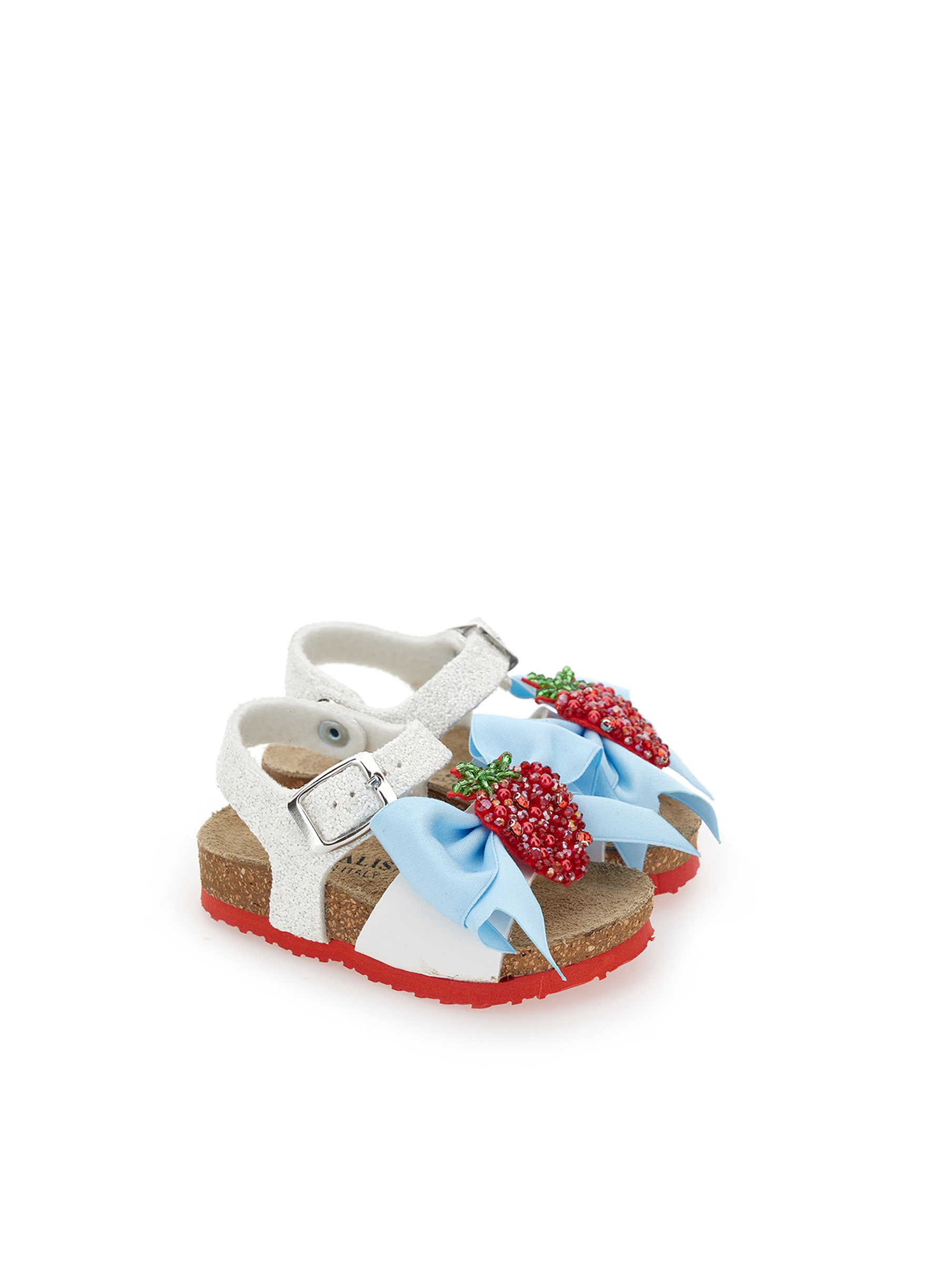 Sandali decorati con fiocchi e fragole in strass, con cinturini con glitter per un effetto brillante, chiusura regolabile con fibbia per indossarli facilmente, interno confortevole ideale per lunghe passeggiate e suola antiscivolo per maggiore sicurezza durante i giochi. Perfetti per dare un tocco luminoso e giocoso a qualsiasi outfit. MONNALISA