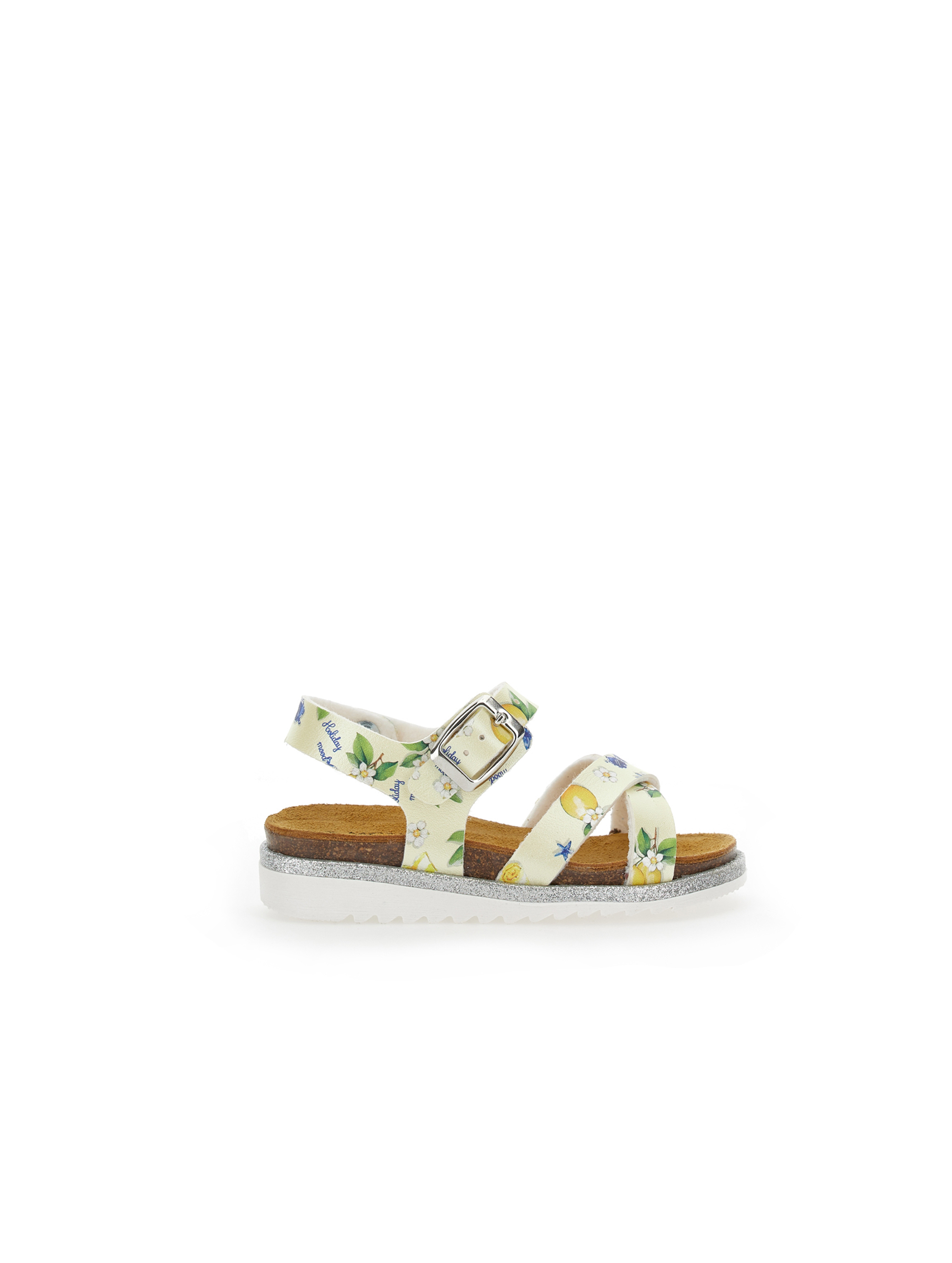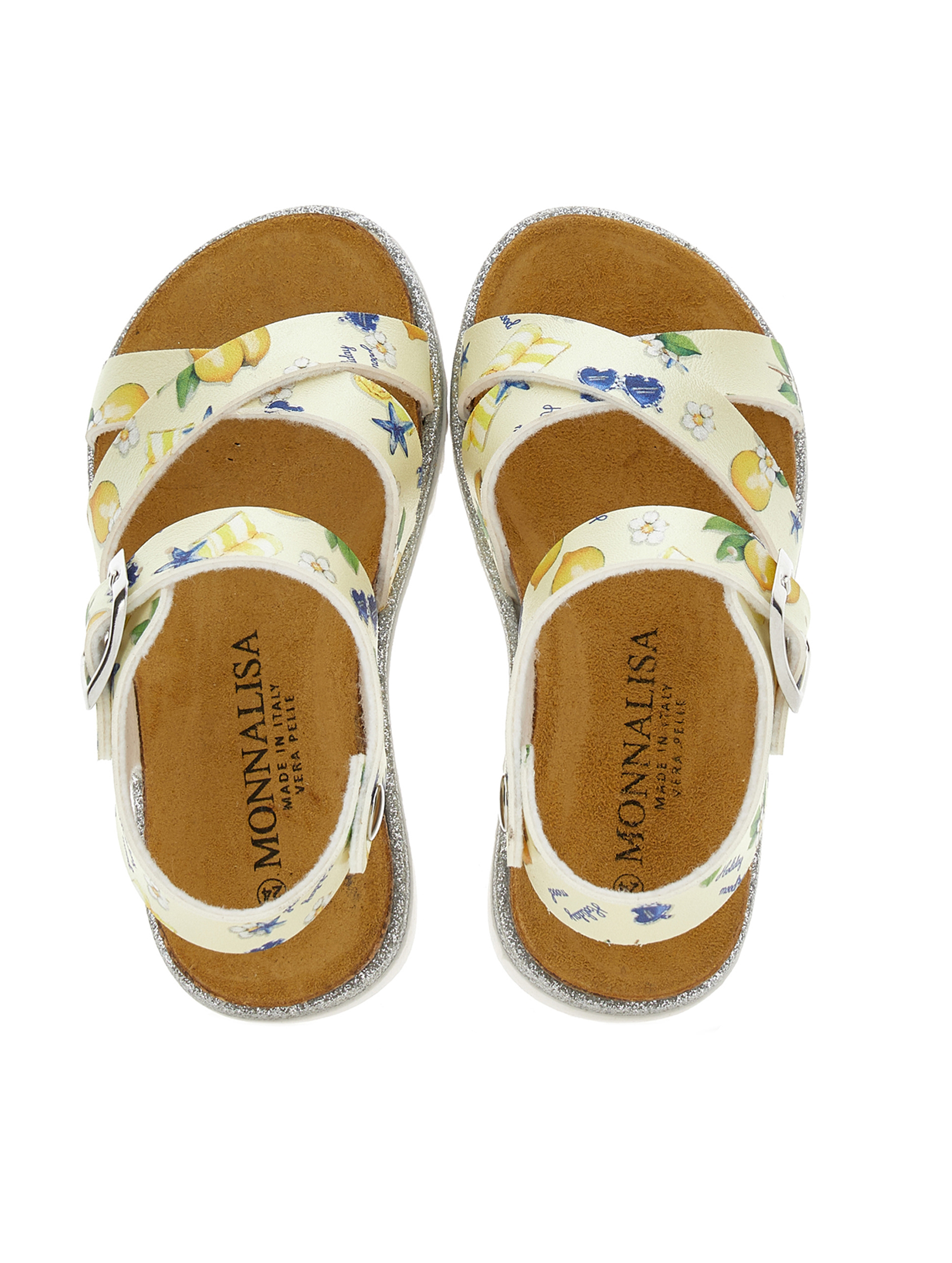 Sandali decorati con stampa di limoni e accessori estivi all over, cnon chiusura con fibbia regolabile, suola decorata con glitter per un tocco scintillante, suola interna confortevole e sottopiede in vera pelle. Adatti a look freschi e trendy. MONNALISA