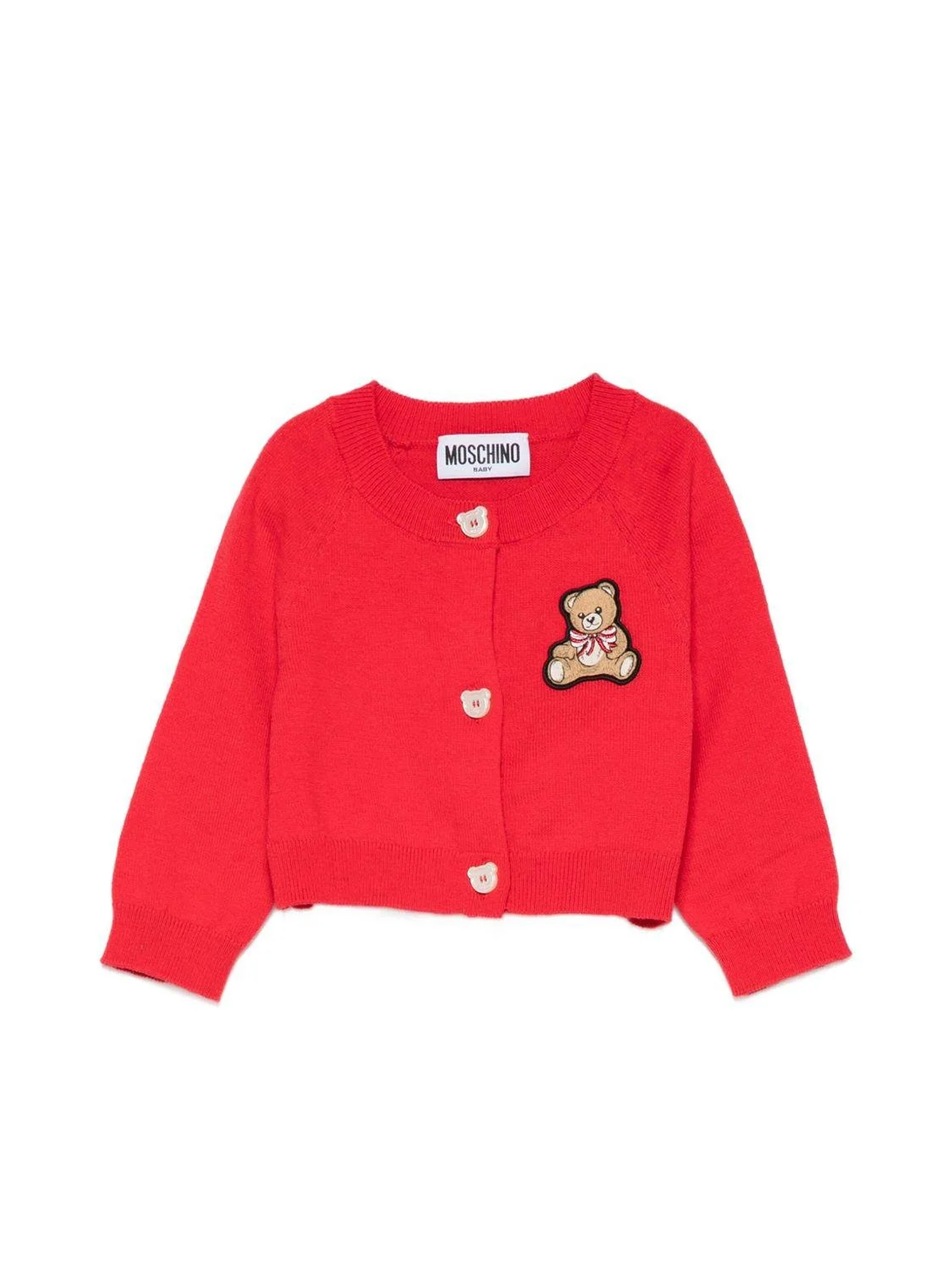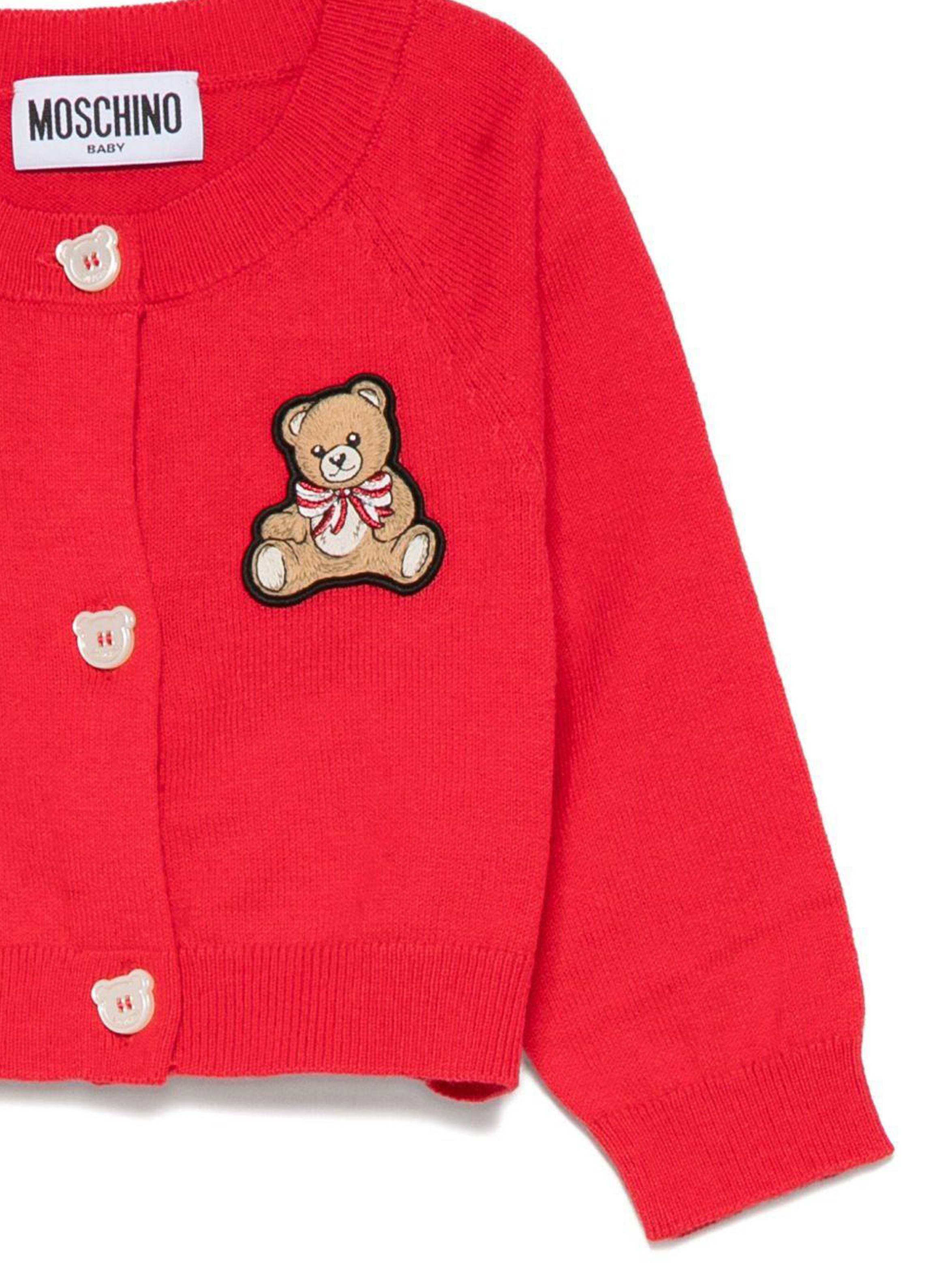 Cardigan in maglia a maniche lunghe, con scollo rotondo, a tinta unita, con prolifi a costine, chiusura centrale con bottoni Bear, flag con logo sul lato e patch dell'iconico Teddy sul petto. Per un look raffinato e fashion. MOSCHINO