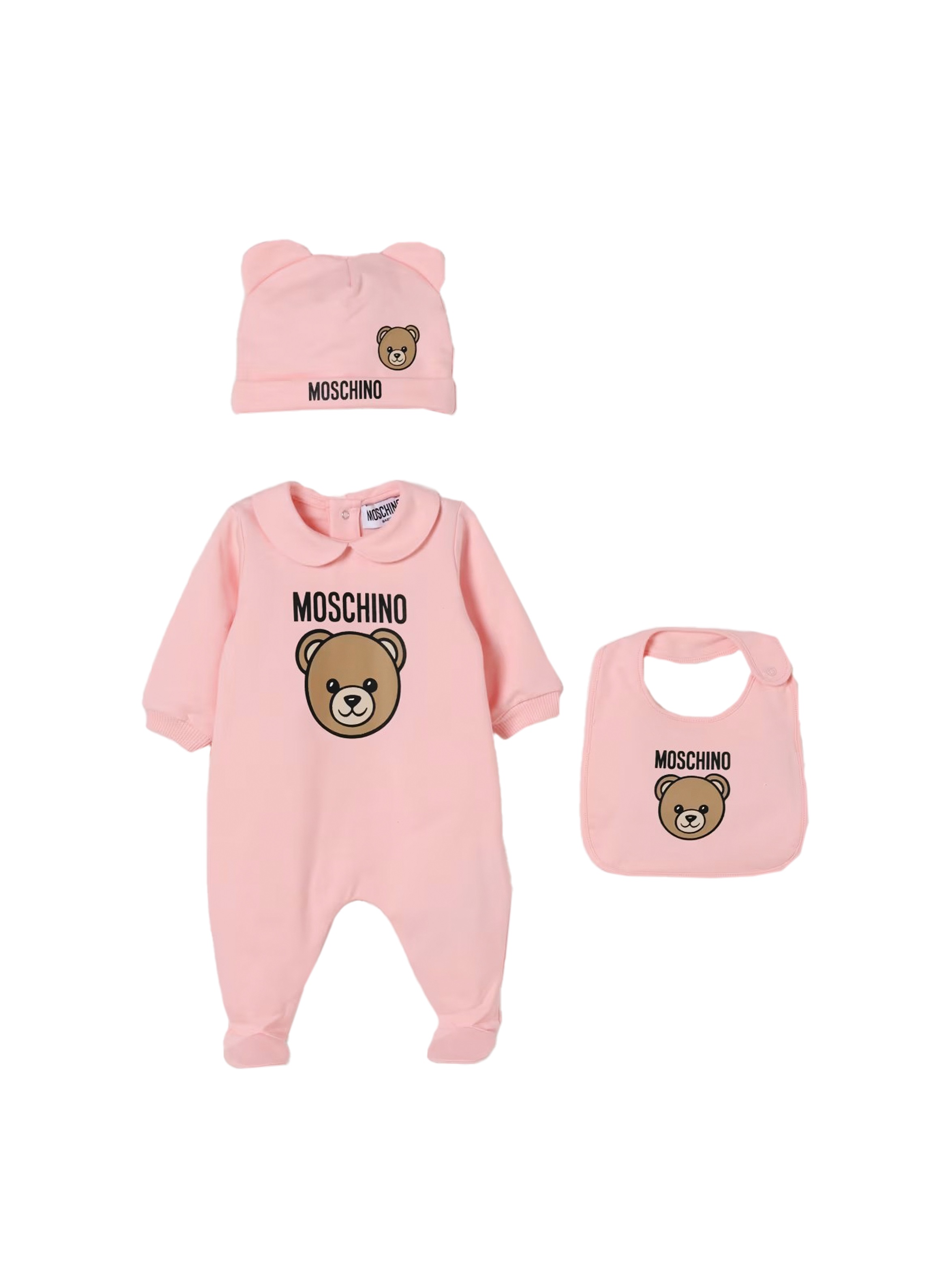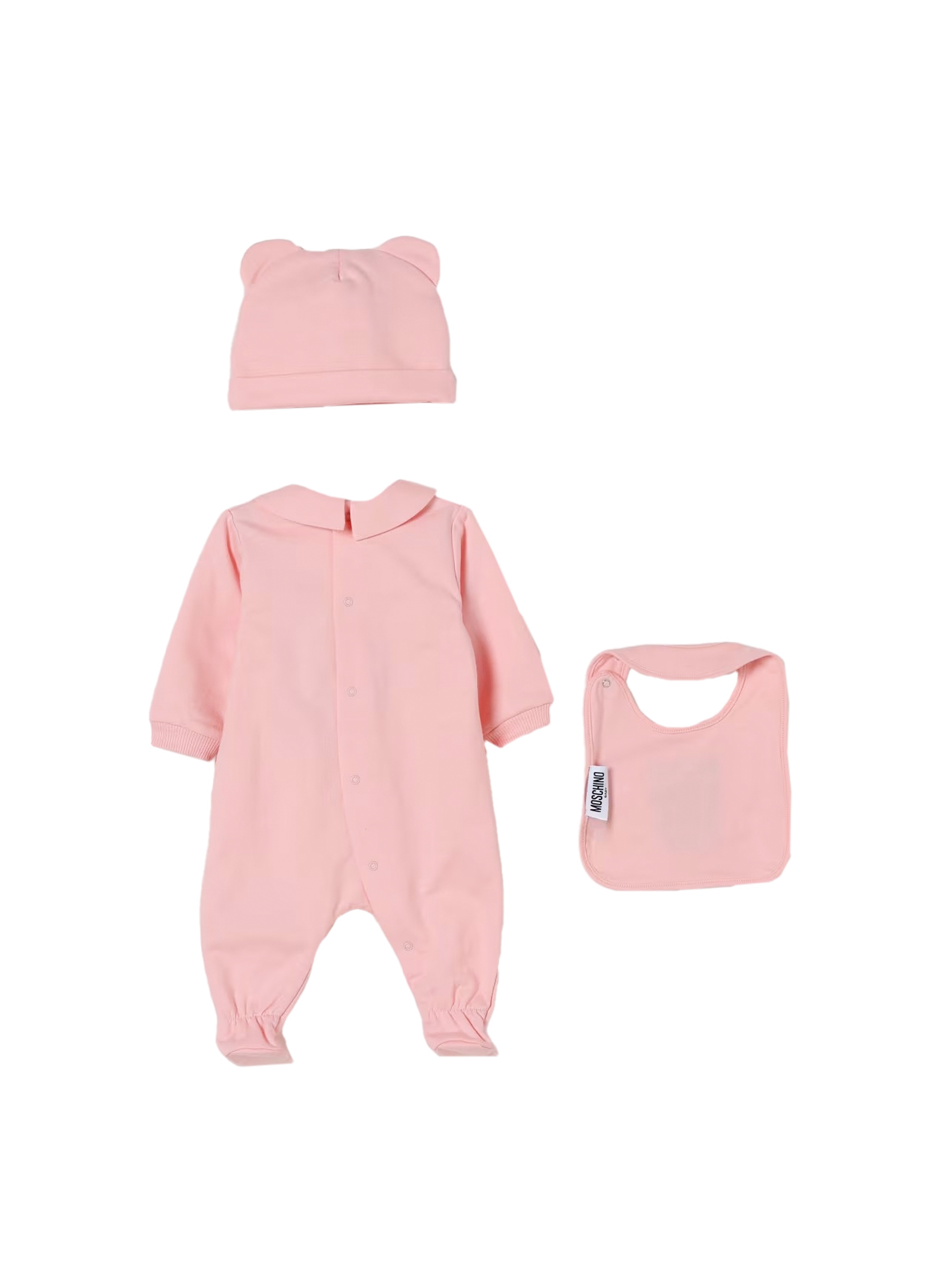 Completo 3 pezzi, formato da tutina a maniche lunghe, a tinta unita, con colletto rotondo, con piedini, chiusura con bottoncini sul retro, polsini e maxi Teddy con logo a contrasto sul davanti; e bavetta e cappellino con orecchie abbinati. Per un look dolce e trendy. MOSCHINO