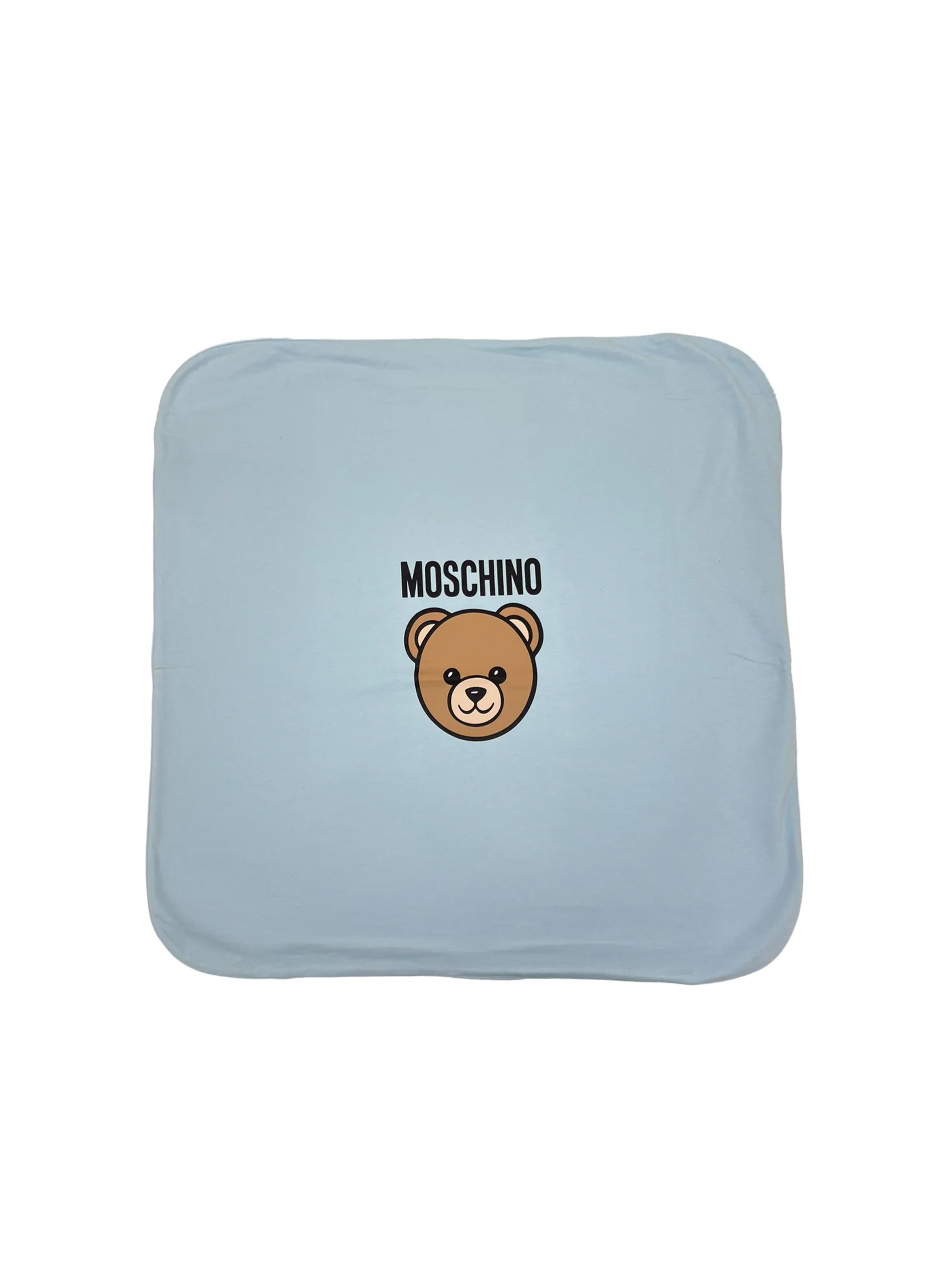 Coperta in morbido tessuto, con angoli stondati, a tinta unita, con maxi Teddy e logo a contrasto al centro. Fashion e trendy. MOSCHINO