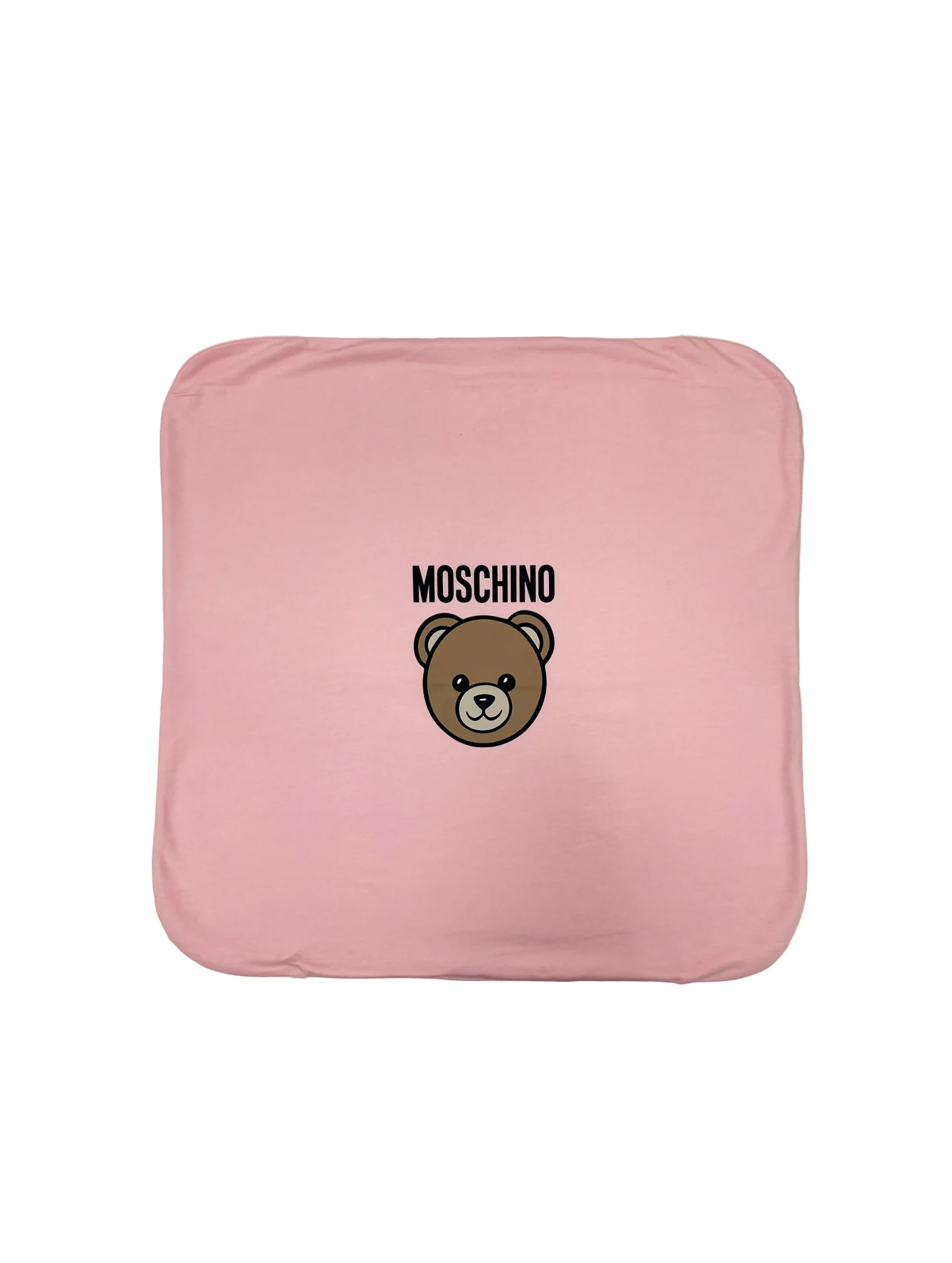 Coperta in morbido tessuto, con angoli stondati, a tinta unita, con maxi Teddy e logo a contrasto al centro. Fashion e trendy. MOSCHINO