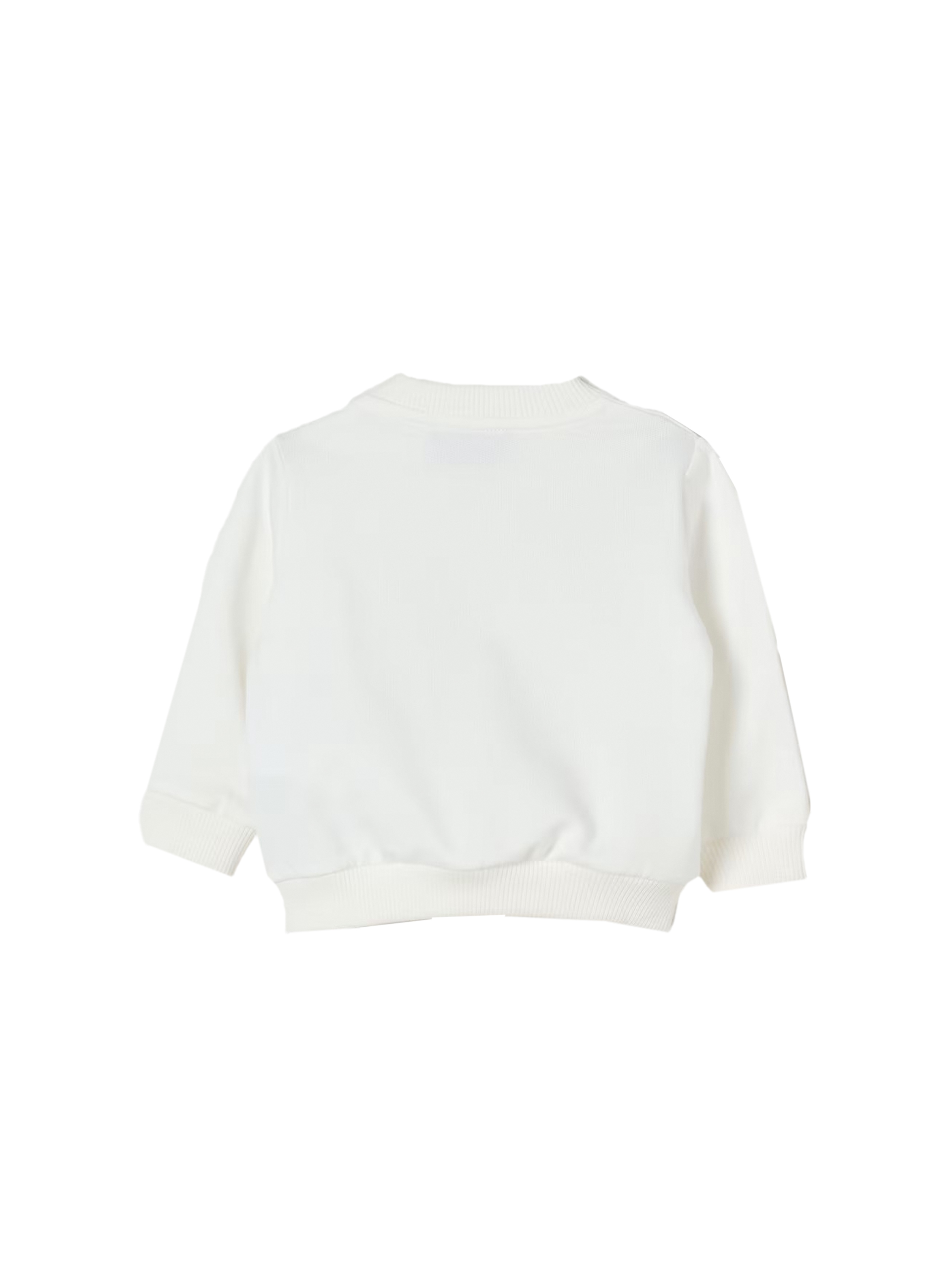 Felpa a maniche lunghe, a tinta unita, con scollo rotondo, profili a costine, apertura con bottoncini sulla spalla, con maxi stampa dell'iconico Teddy e logo a contrasto sul davanti. Per un look trendy e cool. MOSCHINO