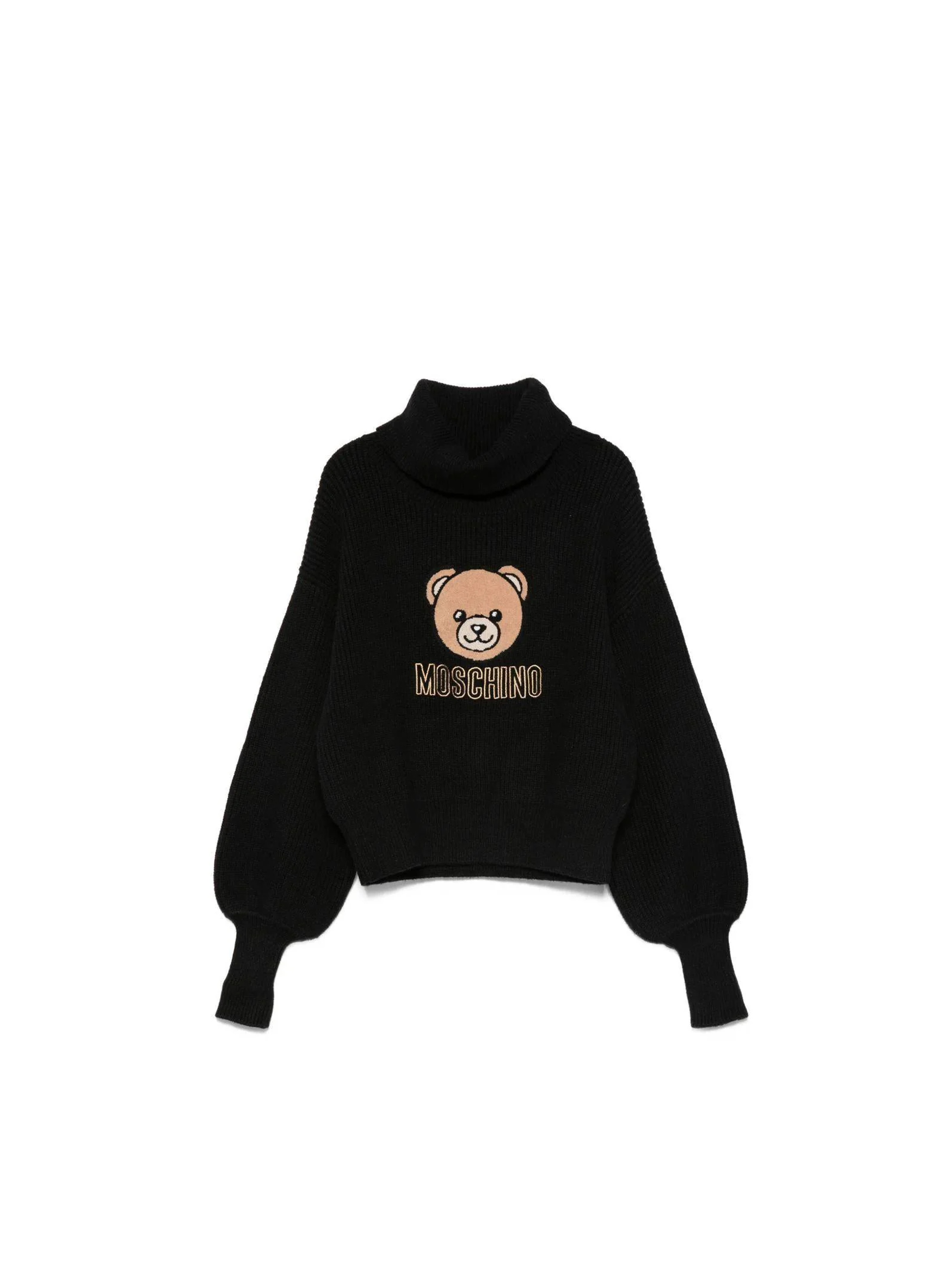 Maglia a maniche lunghe a costine, a tinta unita, con collo alto, polsini, maniche ampie al fondo e iconico Teddy con logo ricamati sul davanti. Per un look trendy e casual. MOSCHINO