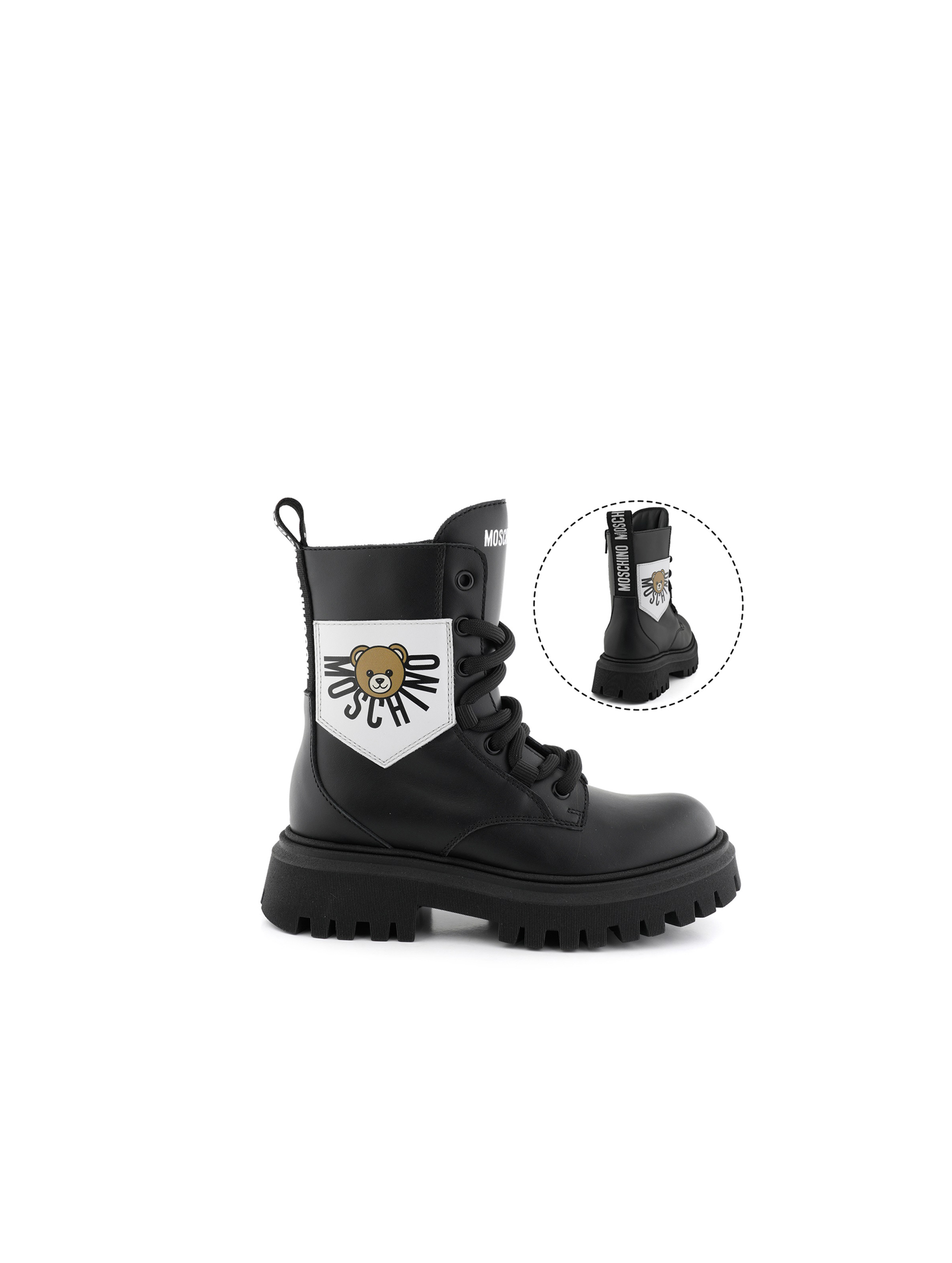 Stivaletto modello combat in vitello, con patch con iconico Teddy bear e logo sul lato esterno, stampa logo sulla linguetta, chiusura con lacci, chiusura laterale con zip, loop logato sul dietro per agevolare la calzata e suola carrarmato in gomma. Per un look fashion e cool. MOSCHINO