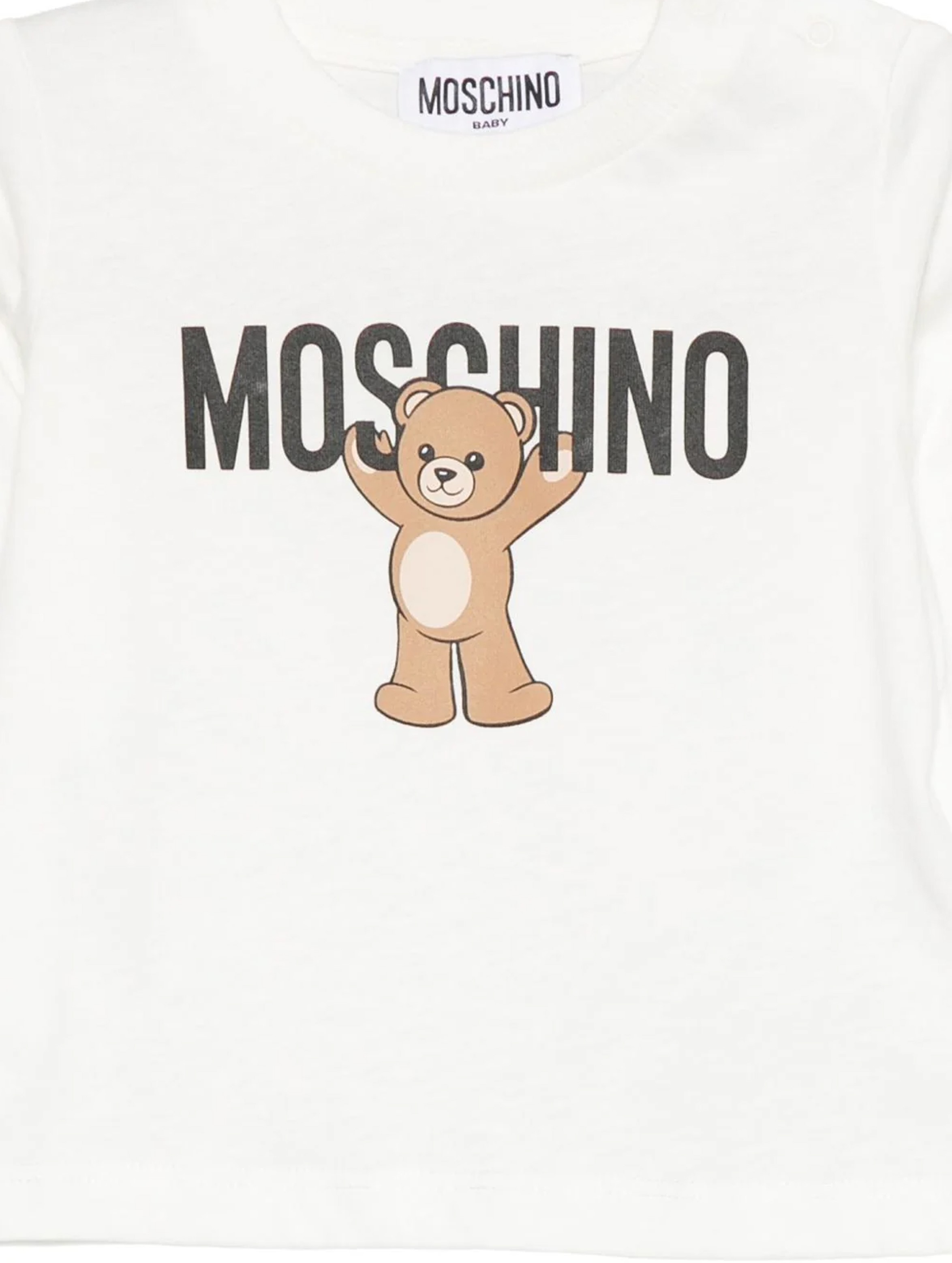 T-shirt a maniche lunghe, con scollo rotondo, a tinta unita, con apertura con bottoni sulla spalla e maxi logo con iconico Teddy bear stampati sul davanti. Per un look trendy e fashion. MOSCHINO