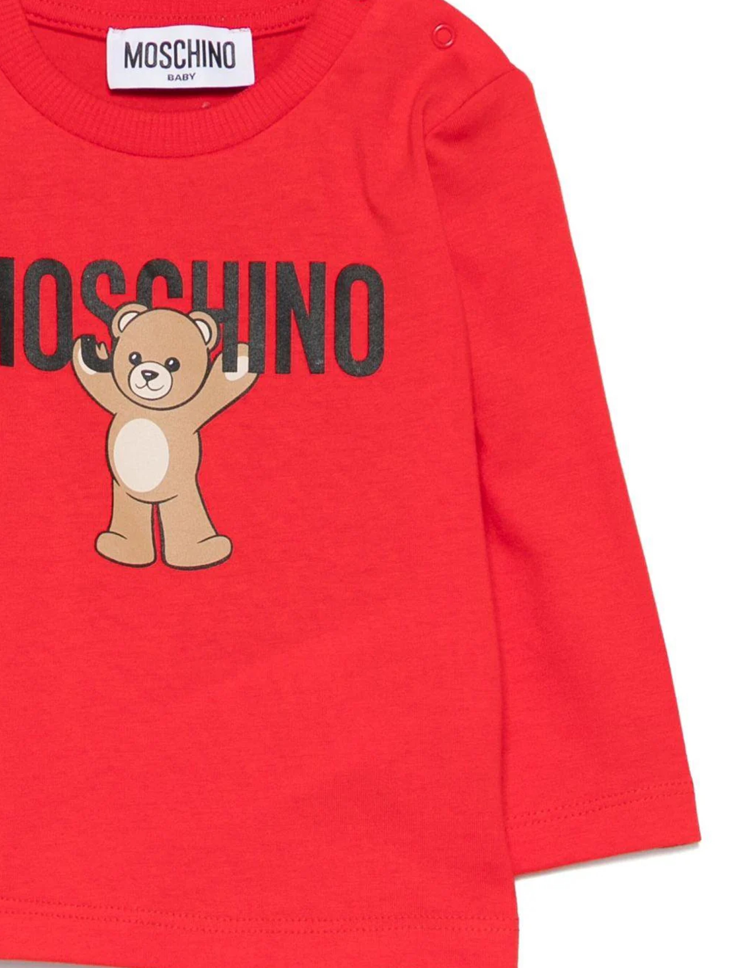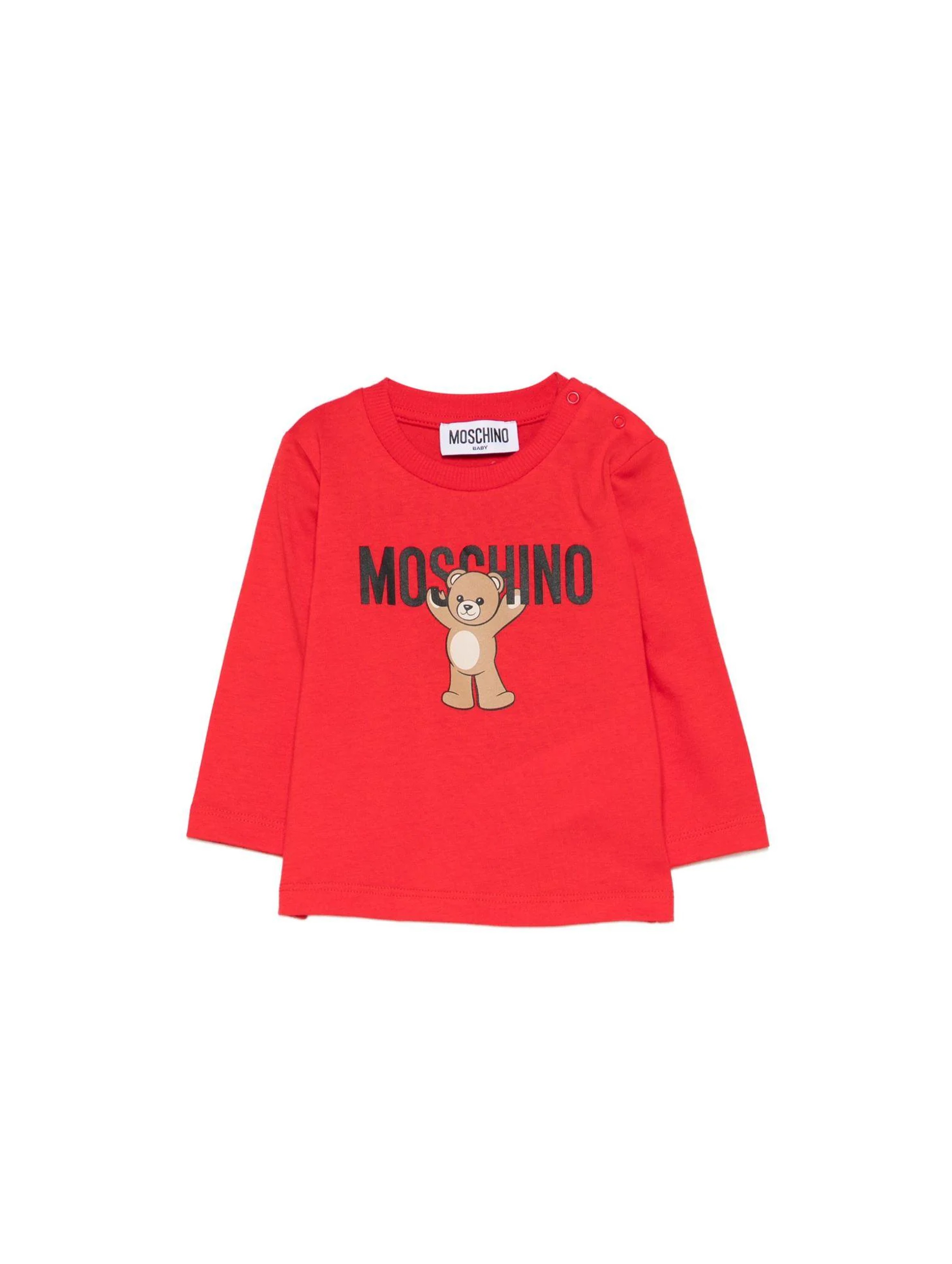 T-shirt a maniche lunghe, con scollo rotondo, a tinta unita, con apertura con bottoni sulla spalla e maxi logo con iconico Teddy bear stampati sul davanti. Per un look trendy e fashion. MOSCHINO