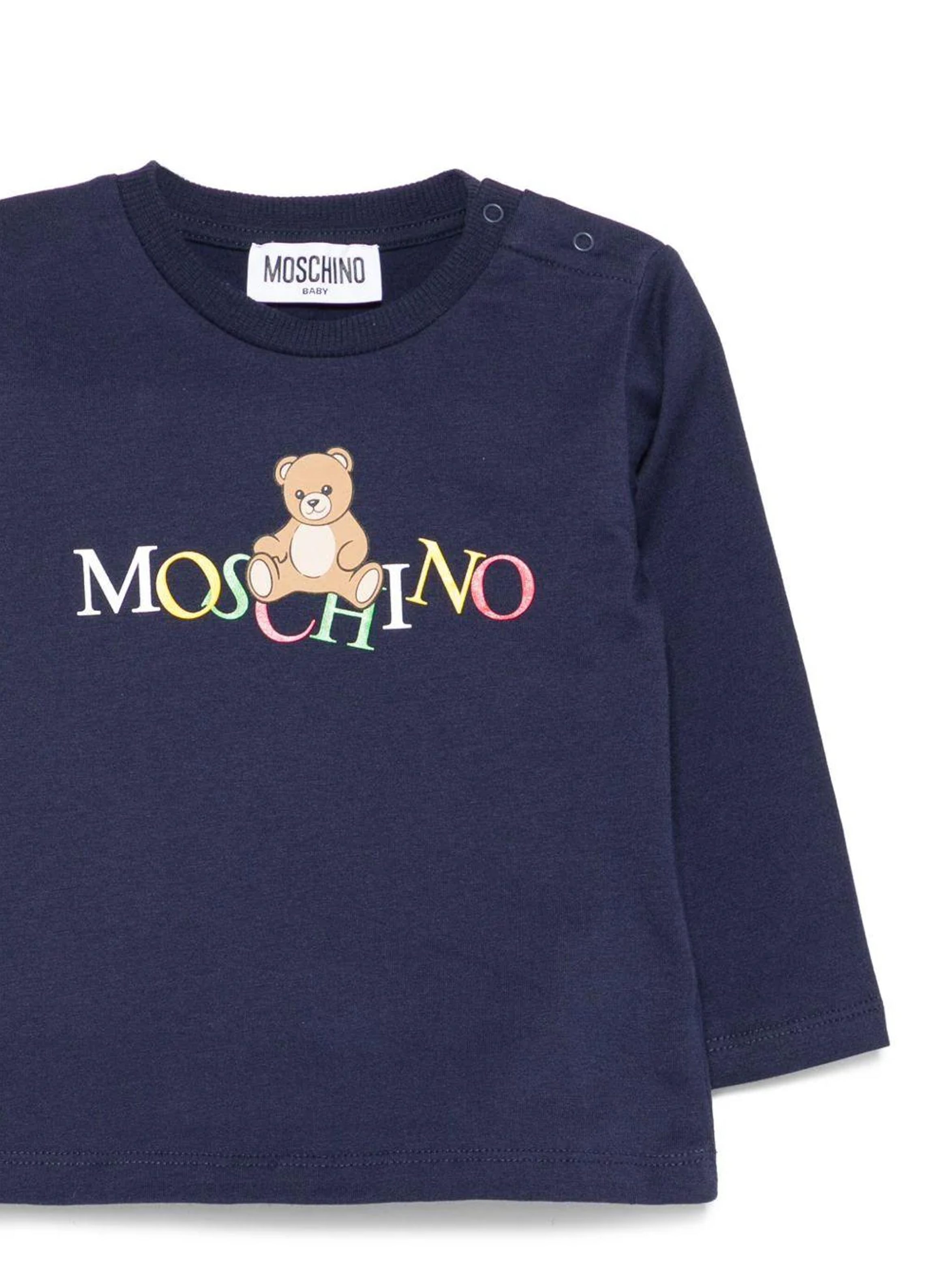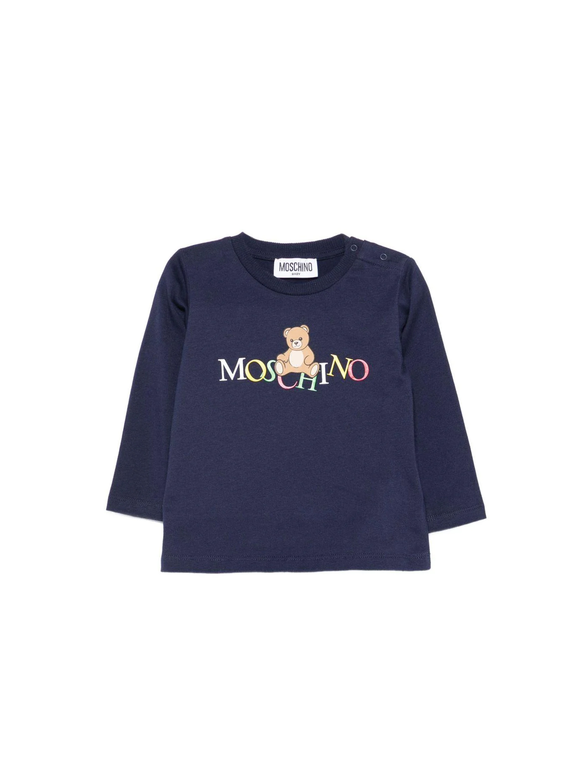 T-shirt a maniche lunghe, con scollo rotondo, a tinta unita, con apertura con bottoni sulla spalla e maxi logo multicolor con iconico Teddy bear stampati sul davanti. Per un look trendy e fashion. MOSCHINO