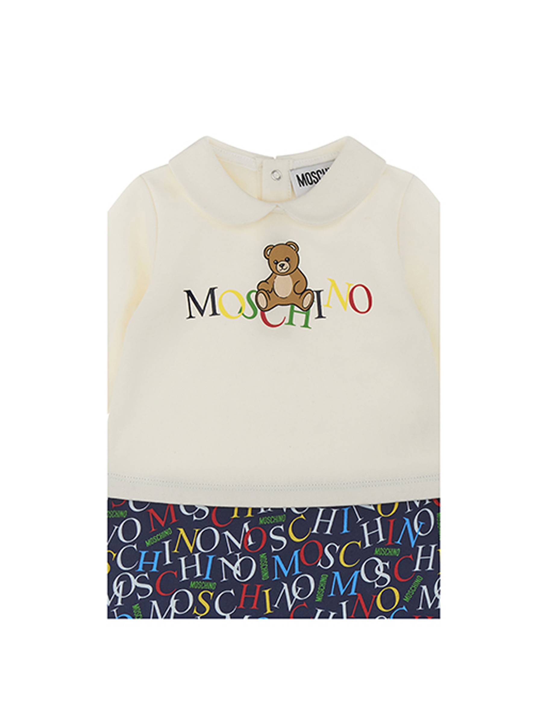 Tutina con maniche lunghe, con colletto rotondo, con maglia a tinta unita e pantaloni a contrasto con logo multicolor all over, con piedini, chiusura con bottoncini sul retro e iconico Teddy con logo multicolor sul davanti. Per un look dolce e trendy. MOSCHINO