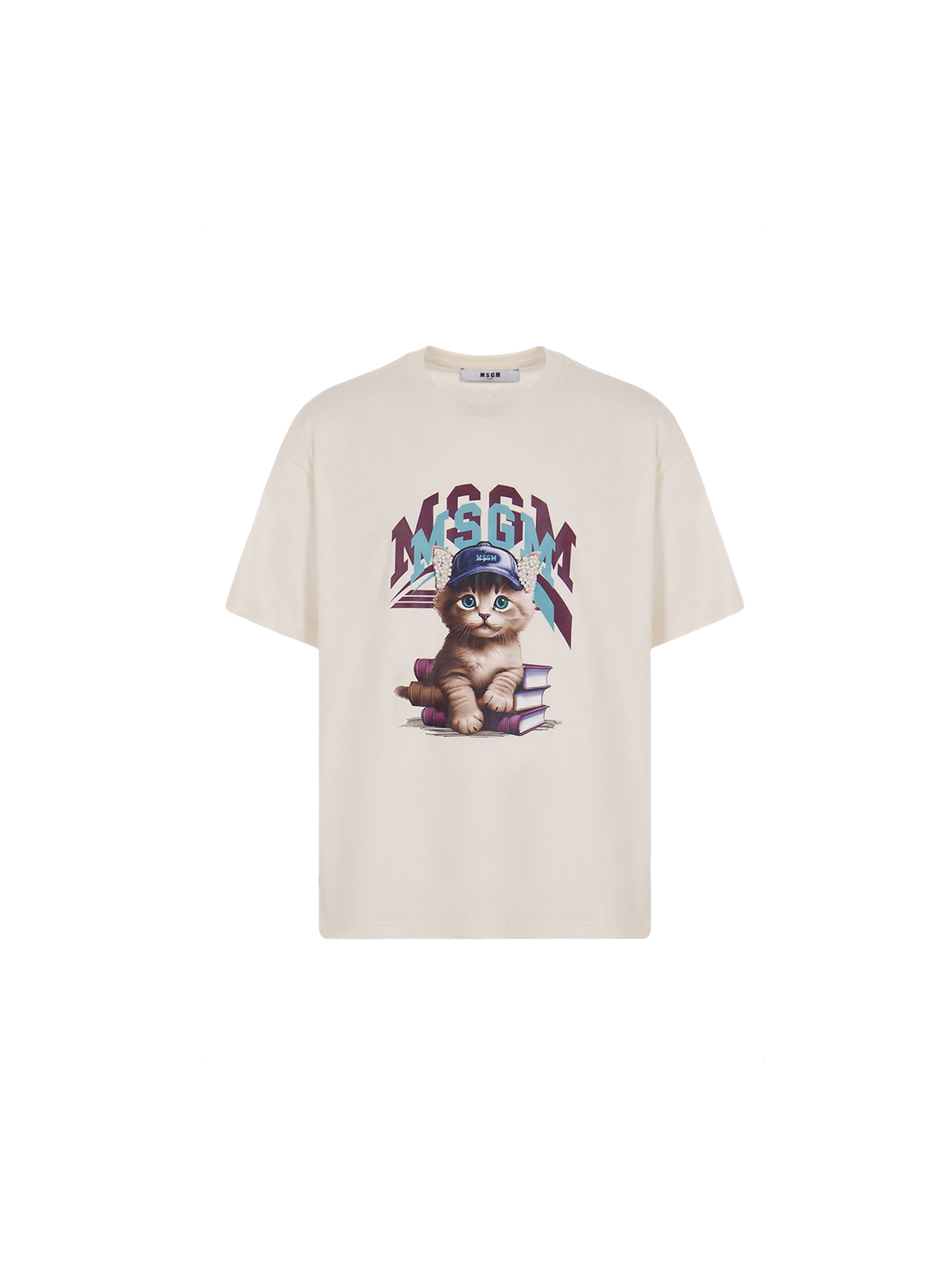 T-shirt in jersey, girocollo, a manica corta, tinta unita, con simpatica stampa centrale e scritta logo. MSGM