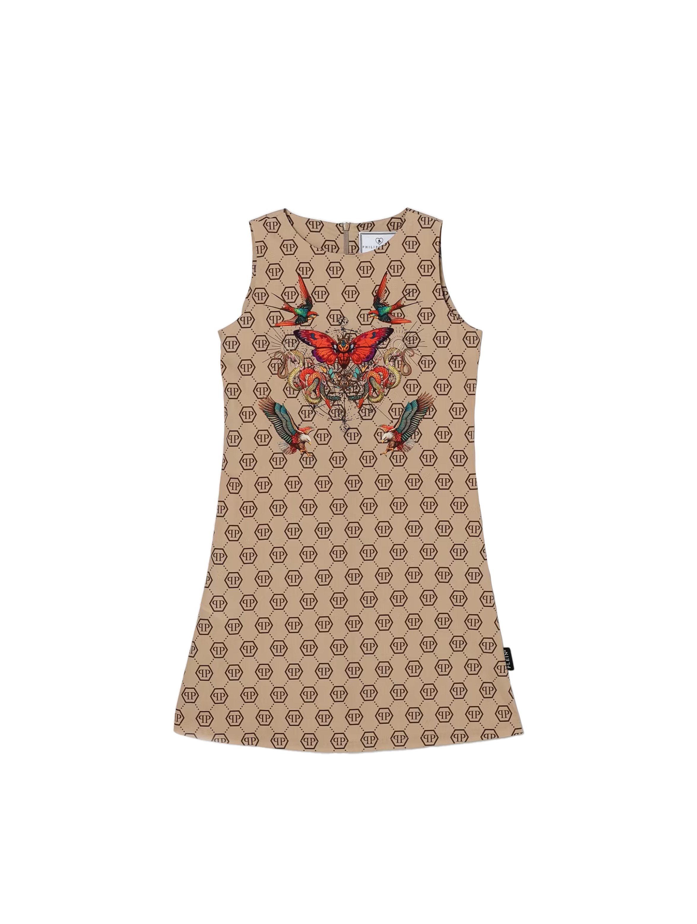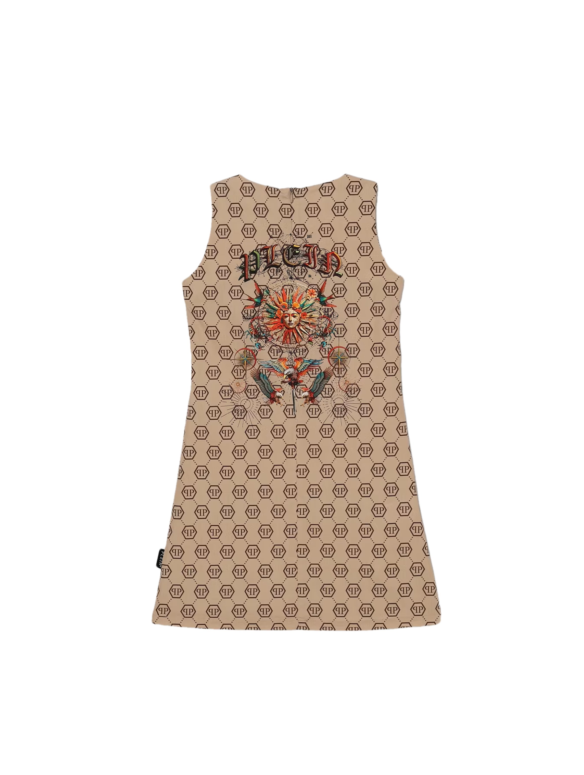 Abito smanicato realizzato in confortevole popeline, con scollo rotondo, chiusura con zip invisibile sul retro, dal design "A-line", con flag logato sul lato, a tinta unita con mini logo PP esagonale all over e maxi stampa grafica multicolor sul davanti e sul retro. Per un look trendy e cool. PHILIPP PLEIN
