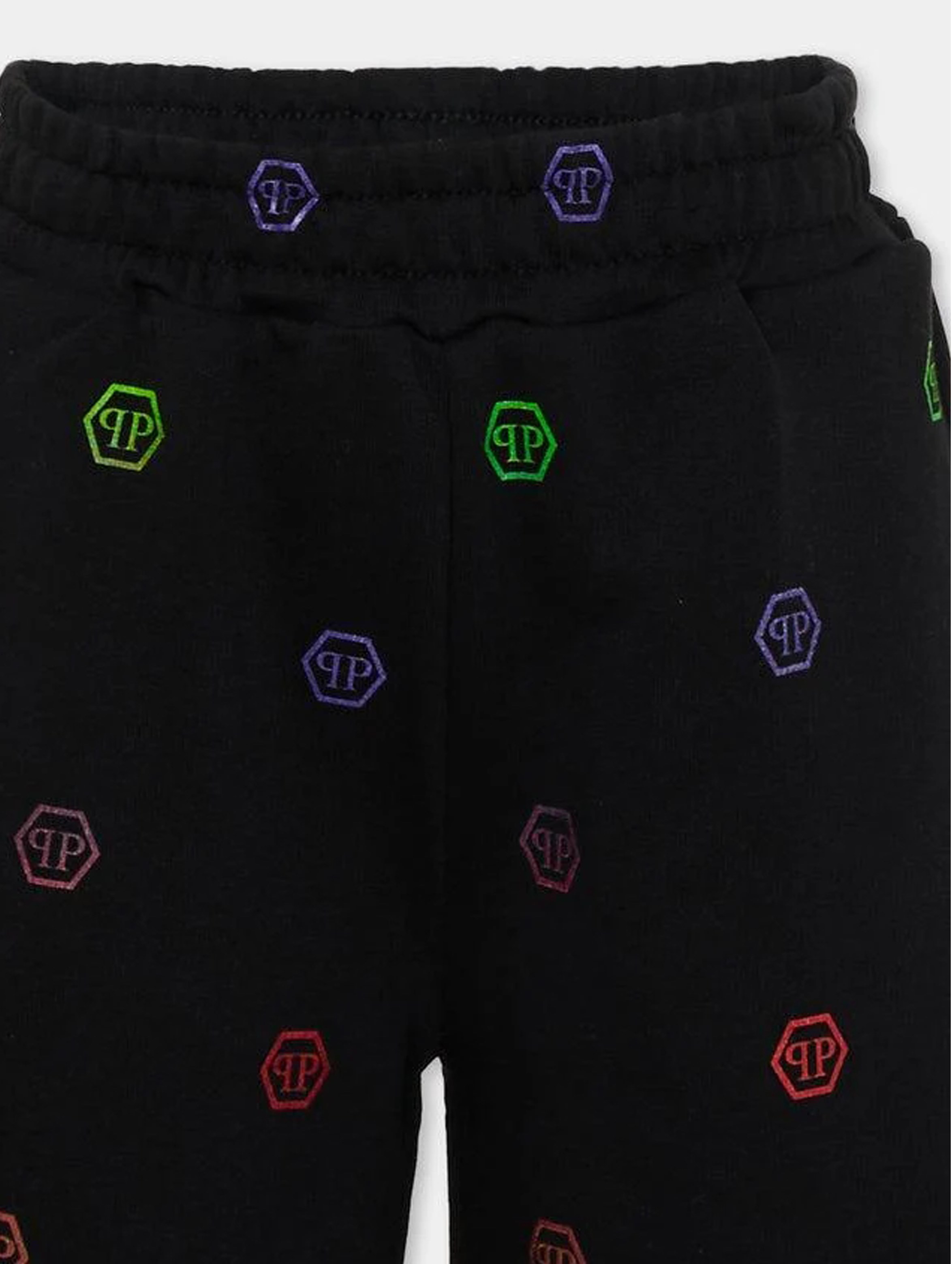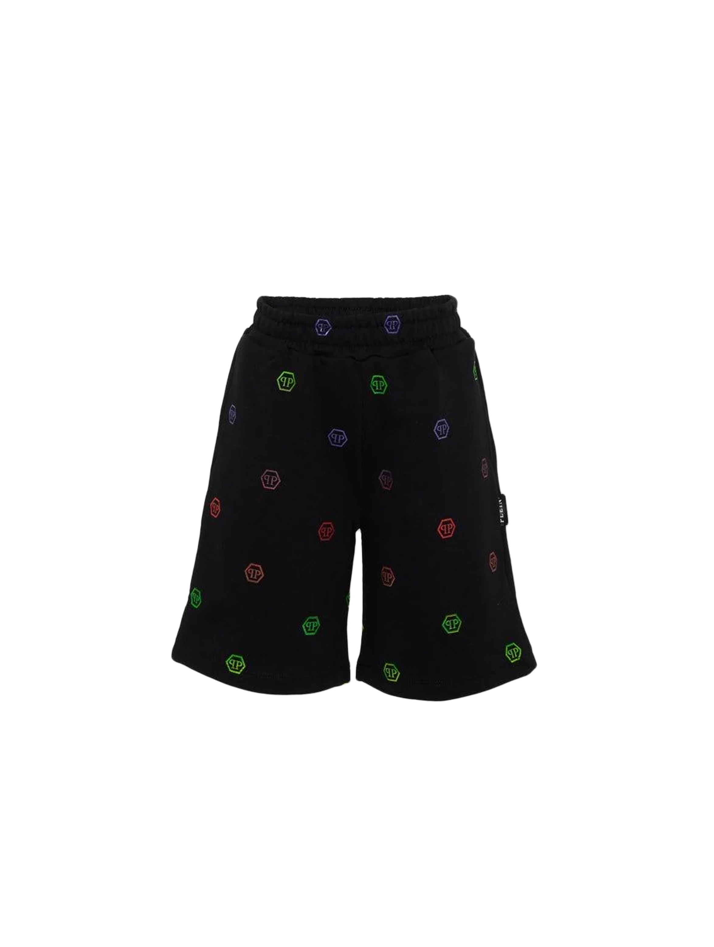 Bermuda in confortevole tessuto, con vita elasticizzata, a tinta unita, con piccolo logo PP esagonale ricamato multicolor all over, flag logata sul lato e logo lettering a contrasto sul retro. Per un look casual e trendy. PHILIPP PLEIN