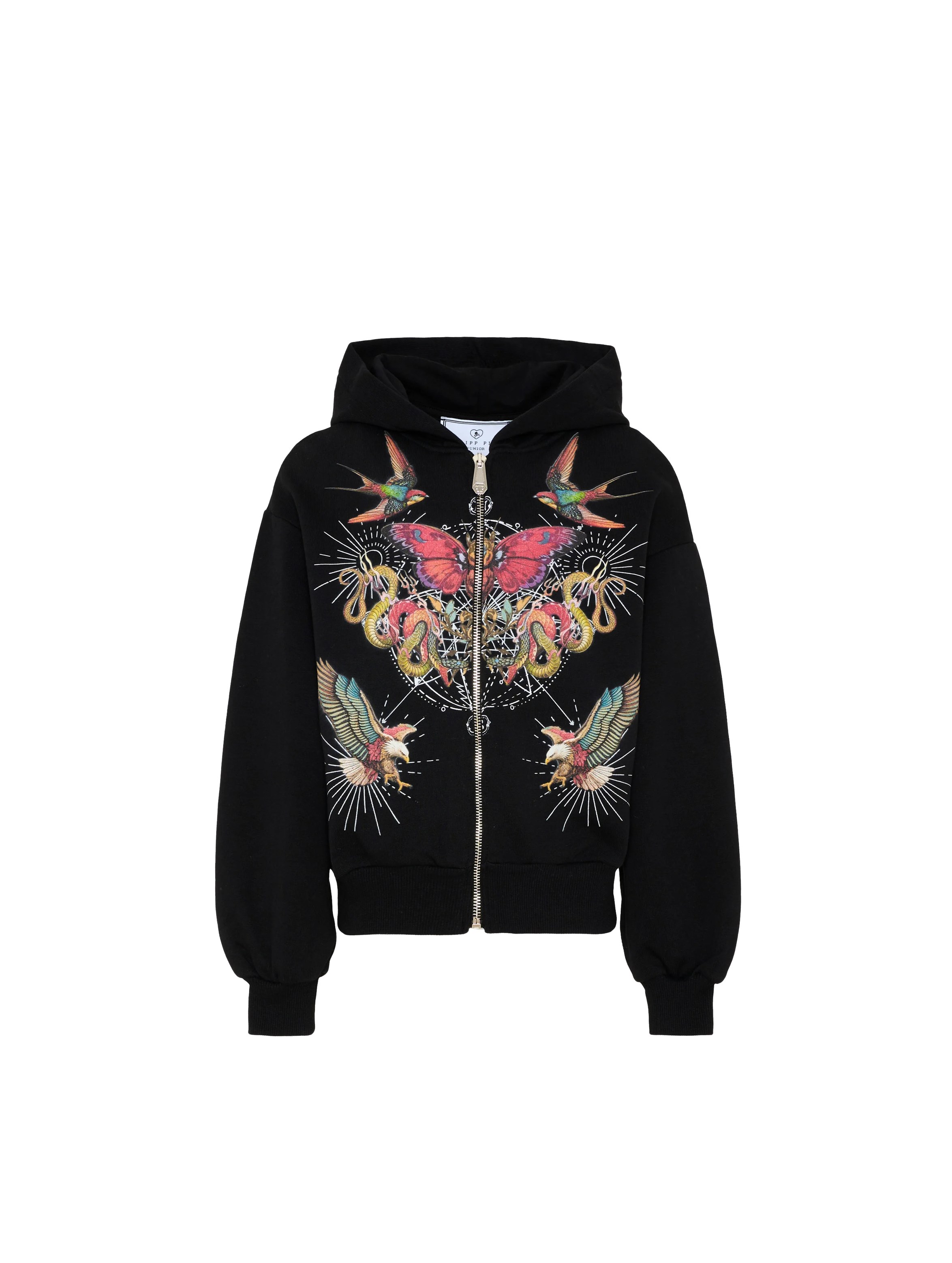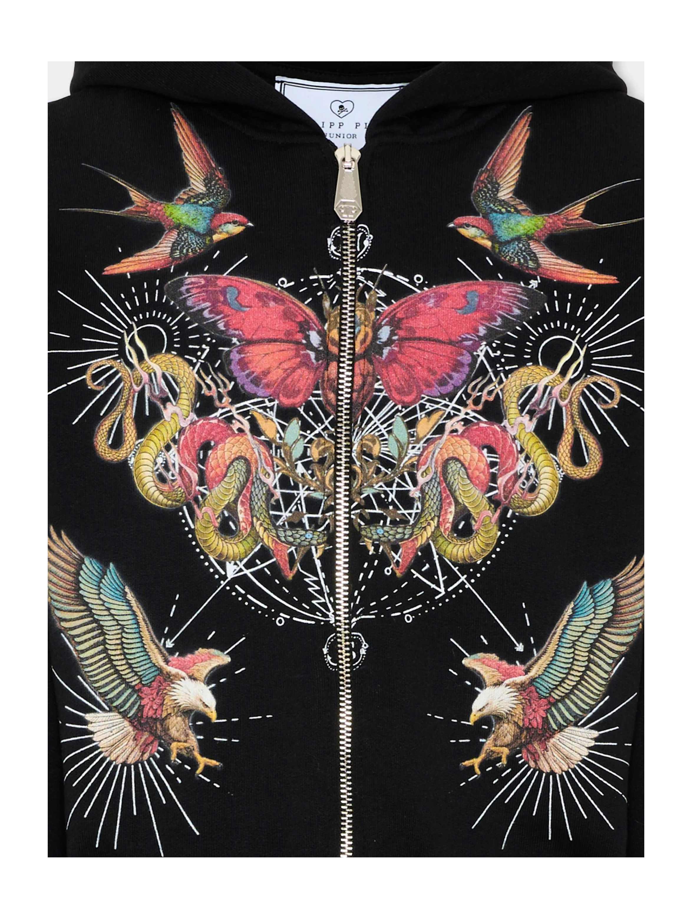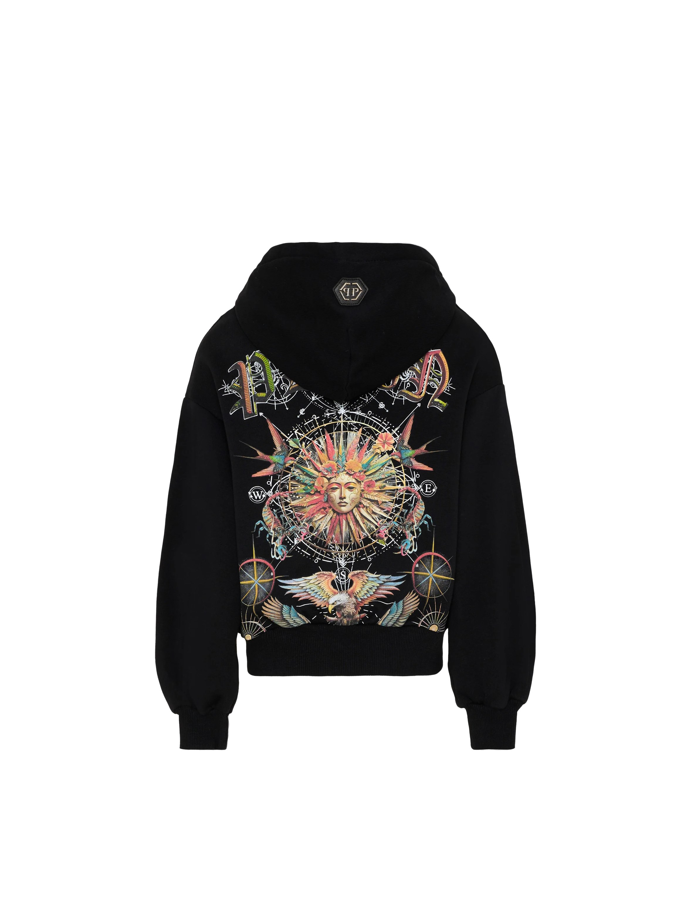 Felpa con cappuccio a maniche lunghe, con bordo e polsini a costine, apertura centrale con zip metallica, con logo PP esagonale sul cappuccio e maxi stampe grafiche multicolor sul davanti e sul retro e maxi logo lettering multicolor sulle spalle. Per un look urban e cool. PHILIPP PLEIN