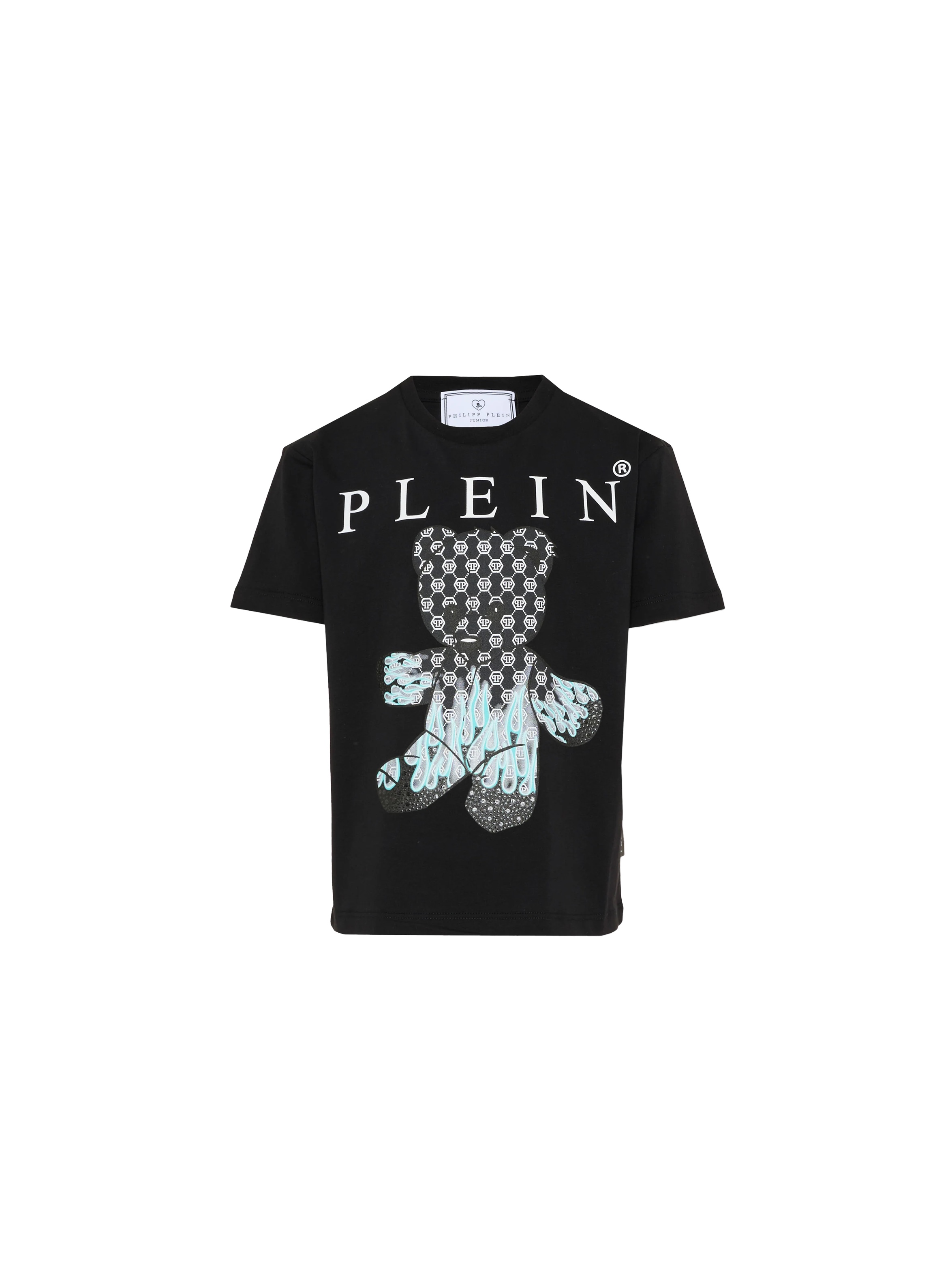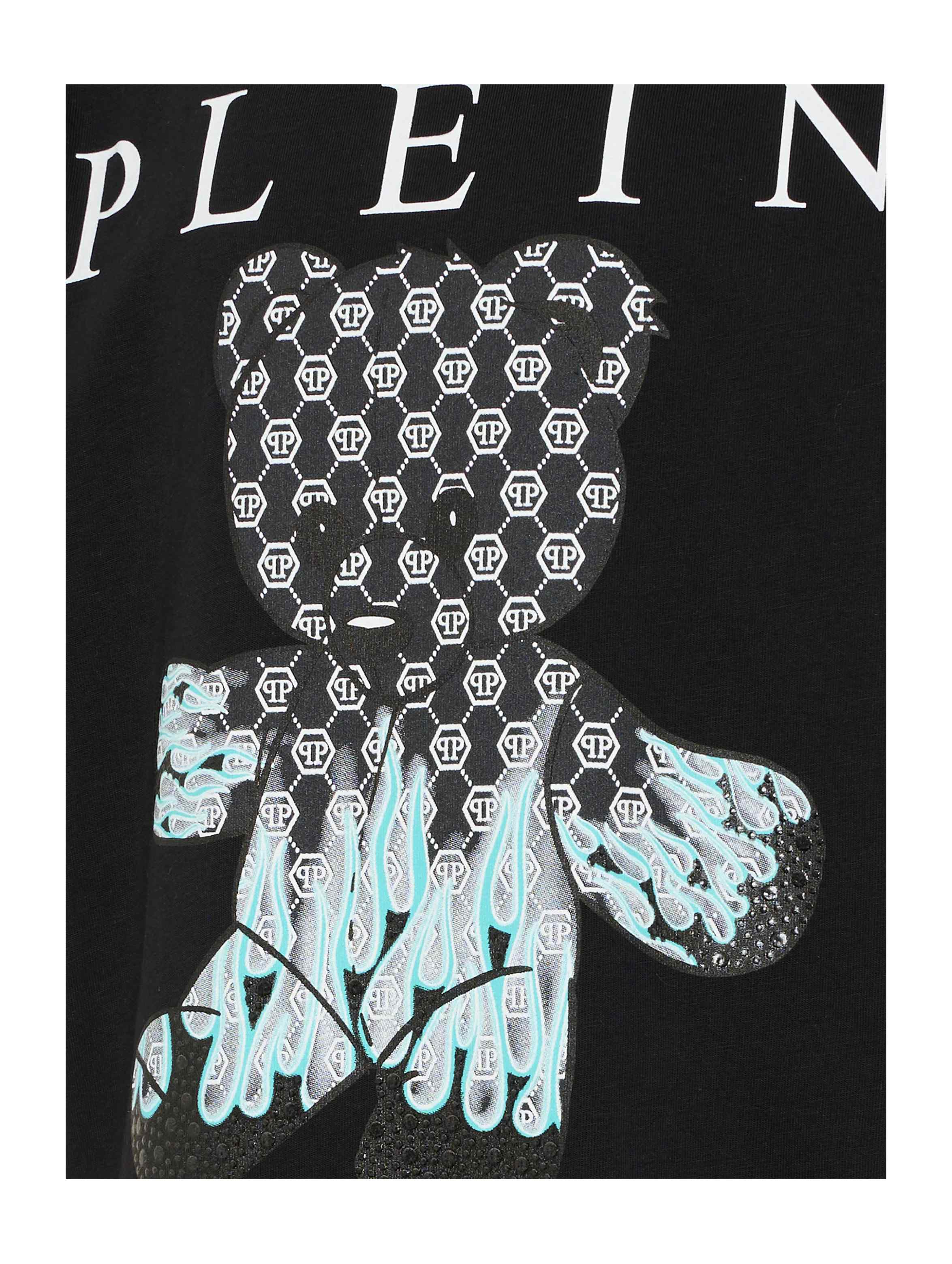 T-shirt a maniche corte in confortevole jersey, con scollo rotondo, a tinta unita, con flag logata sul fianco, maxi logo lettering a contrasto sul fronte e maxi stampa grafica di iconico orsetto logato con fiamme e dettagli in strass sul davanti. Per un look trendy e cool. PHILIPP PLEIN