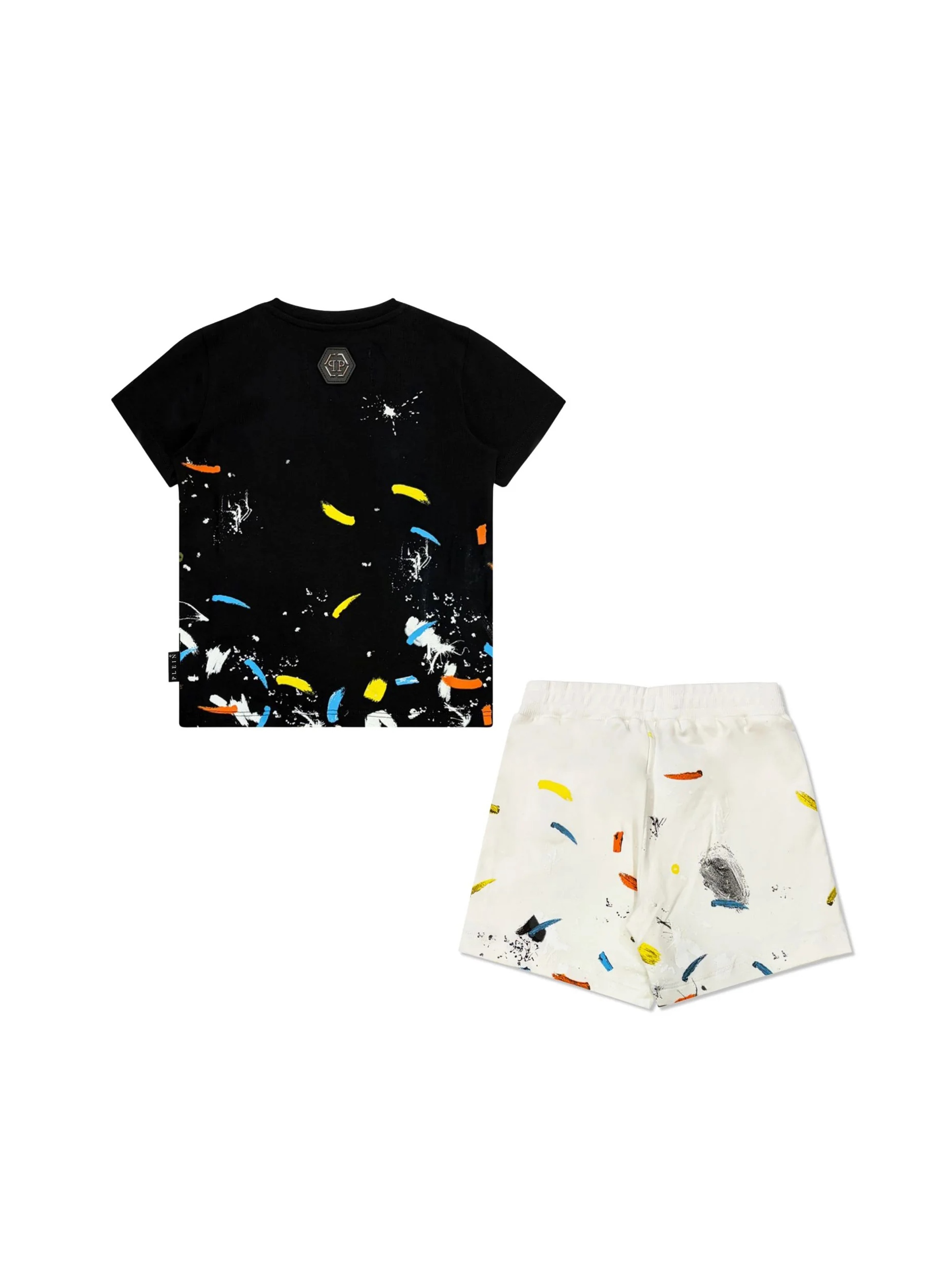 Completo realizzato in confortevole jersey di cotone, con t-shirt a maniche corte, con scollo rotondo, a tinta unita, con flag logata sul lato, maxi logo lettering sul davanti, apertura con bottoni sulla spalla e short abbinati con vita elasticizzata per il massimo comfort, con logo PP esagonale e design di pennellate e schizzi di pittura colorati all over. Per un look casual e cool. PHILIPP PLEIN