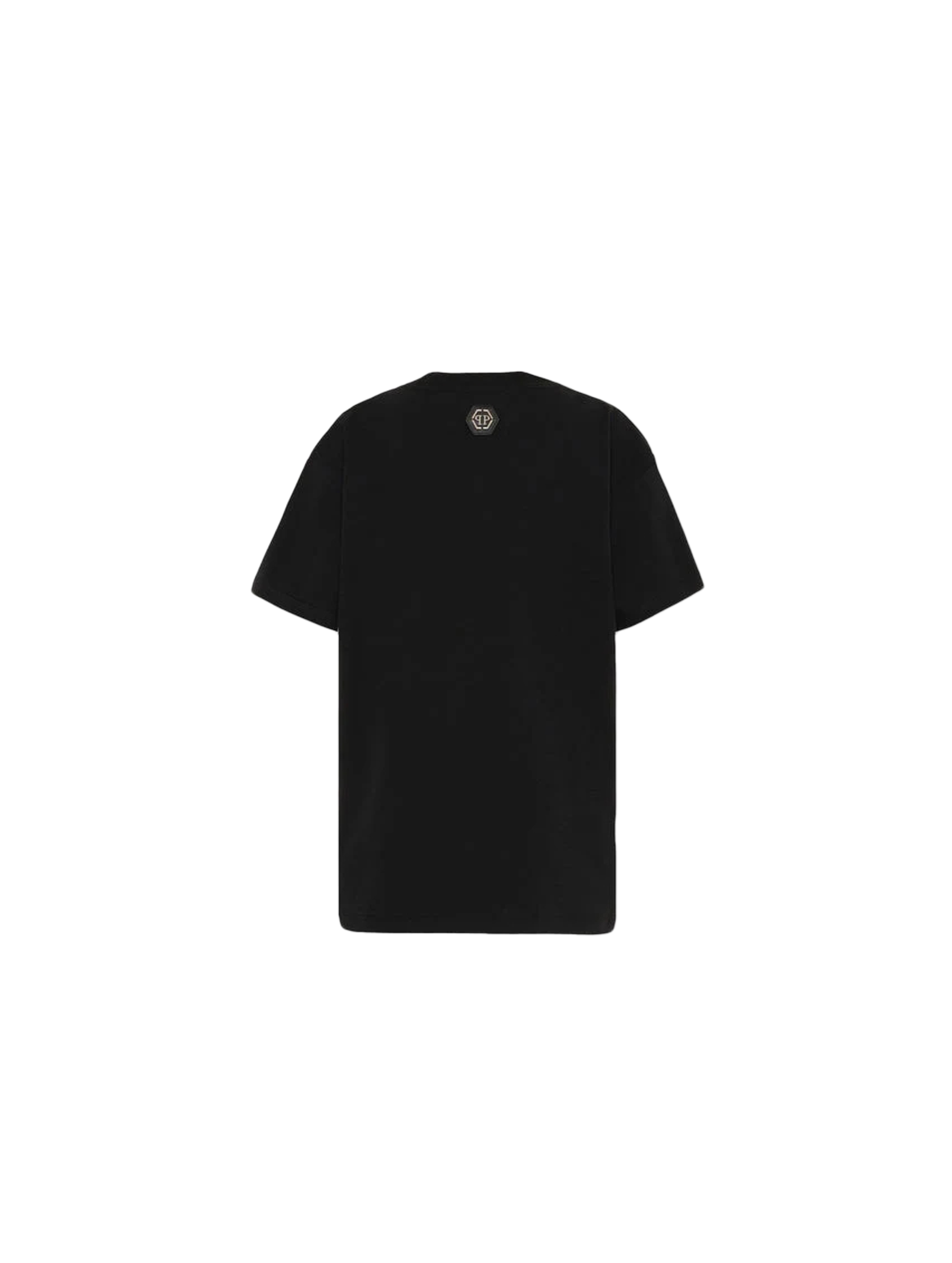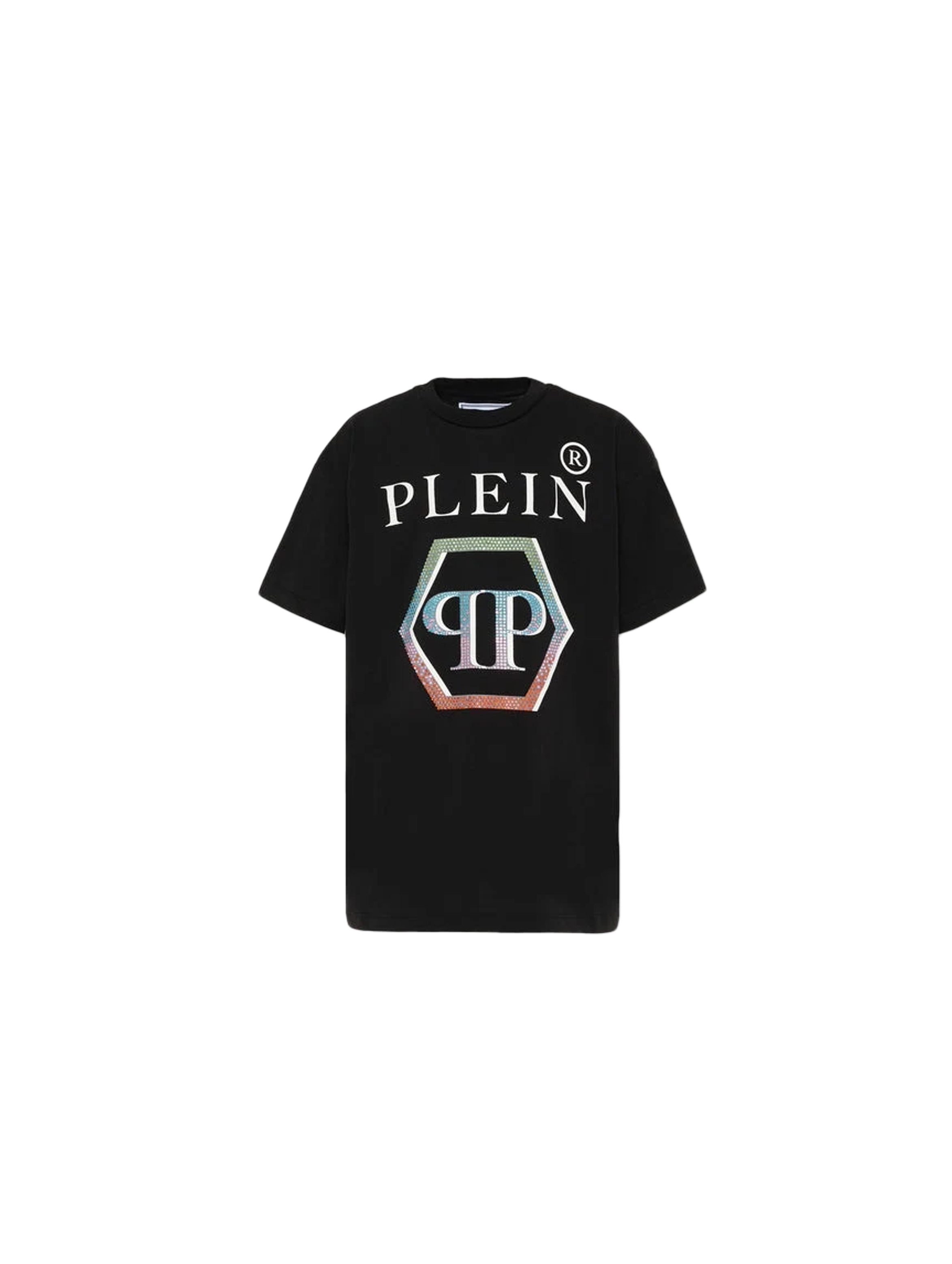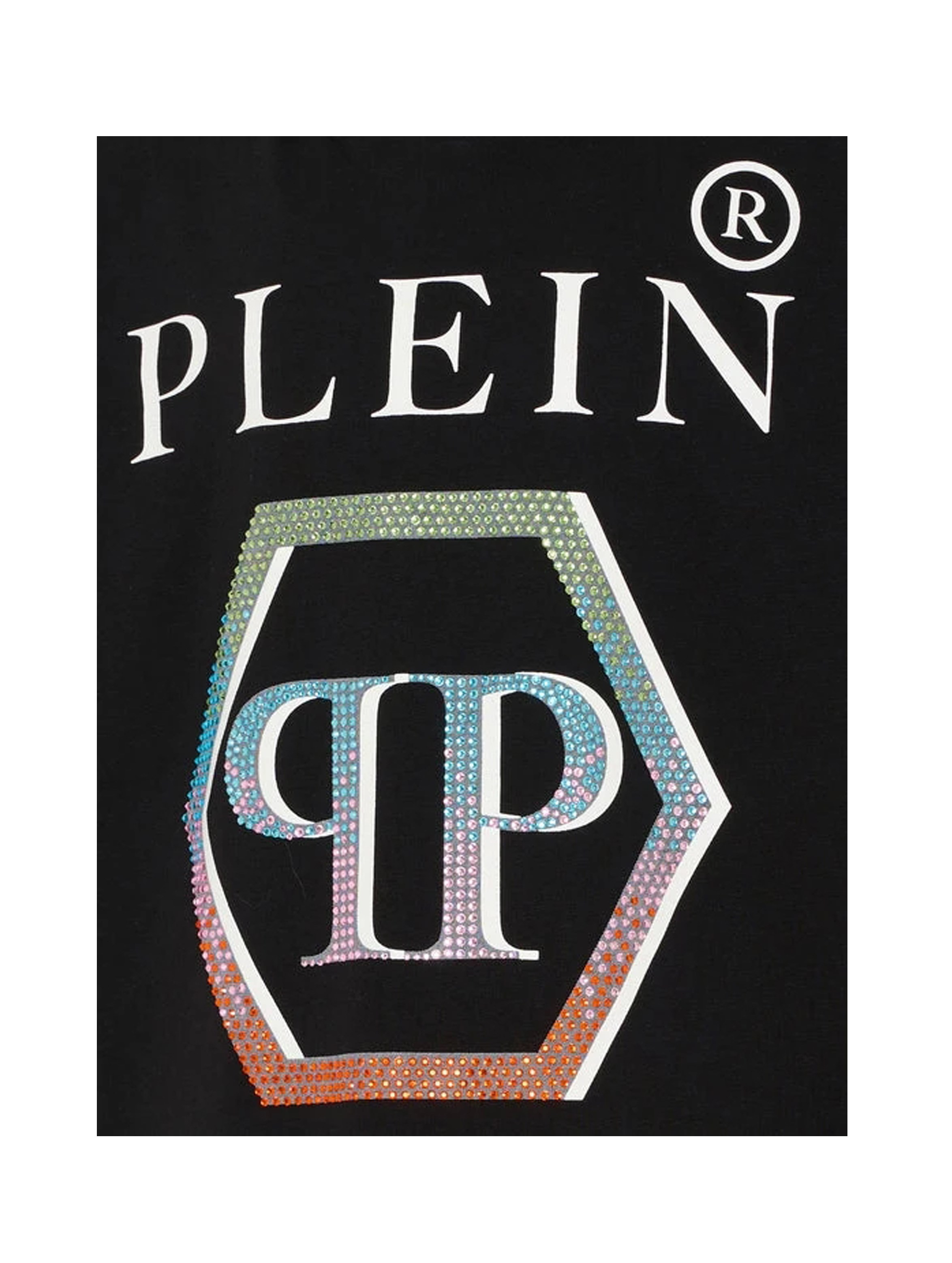 T-shirt a maniche corte in confortevole jersey, con scollo rotondo, a tinta unita, con flag logata sul fianco, piccolo logo PP esagonale sul retro, maxi logo lettering a contrasto sul fronte e maxi logo PP esagonale colorato rainbow con strass sul davanti. Per un look trendy e cool. PHILIPP PLEIN