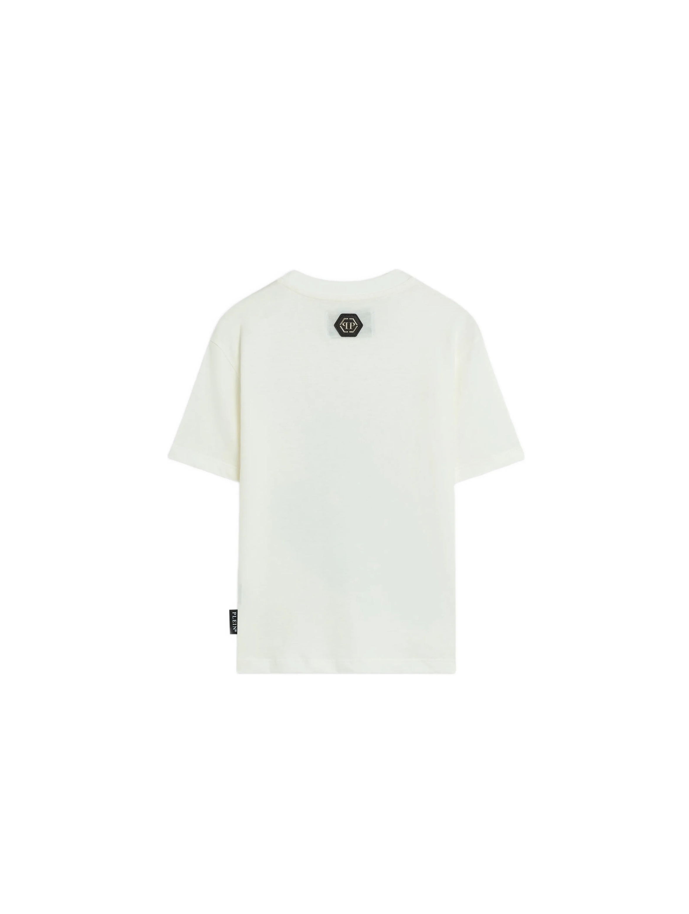 T-shirt a maniche corte in confortevole jersey, con scollo rotondo, a tinta unita, con flag logata sul fianco, piccolo logo PP esagonale sul retro, maxi logo lettering a contrasto sul fronte ricoperto di strass in tinta e maxi stampa grafica di iconico orsetto logato con fiamme e dettagli in strass sul davanti. Per un look fashion e cool. PHILIPP PLEIN