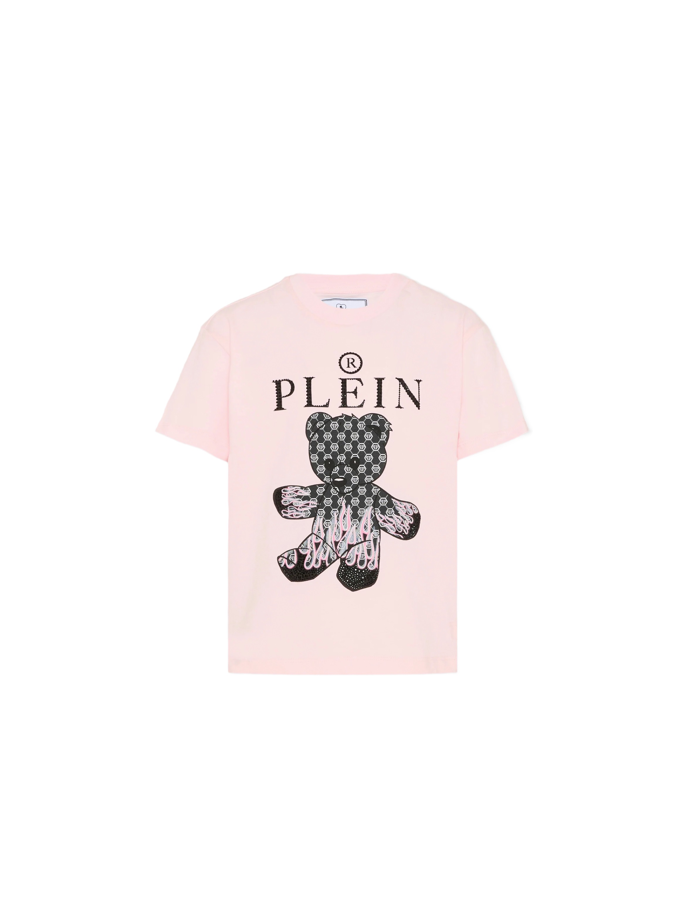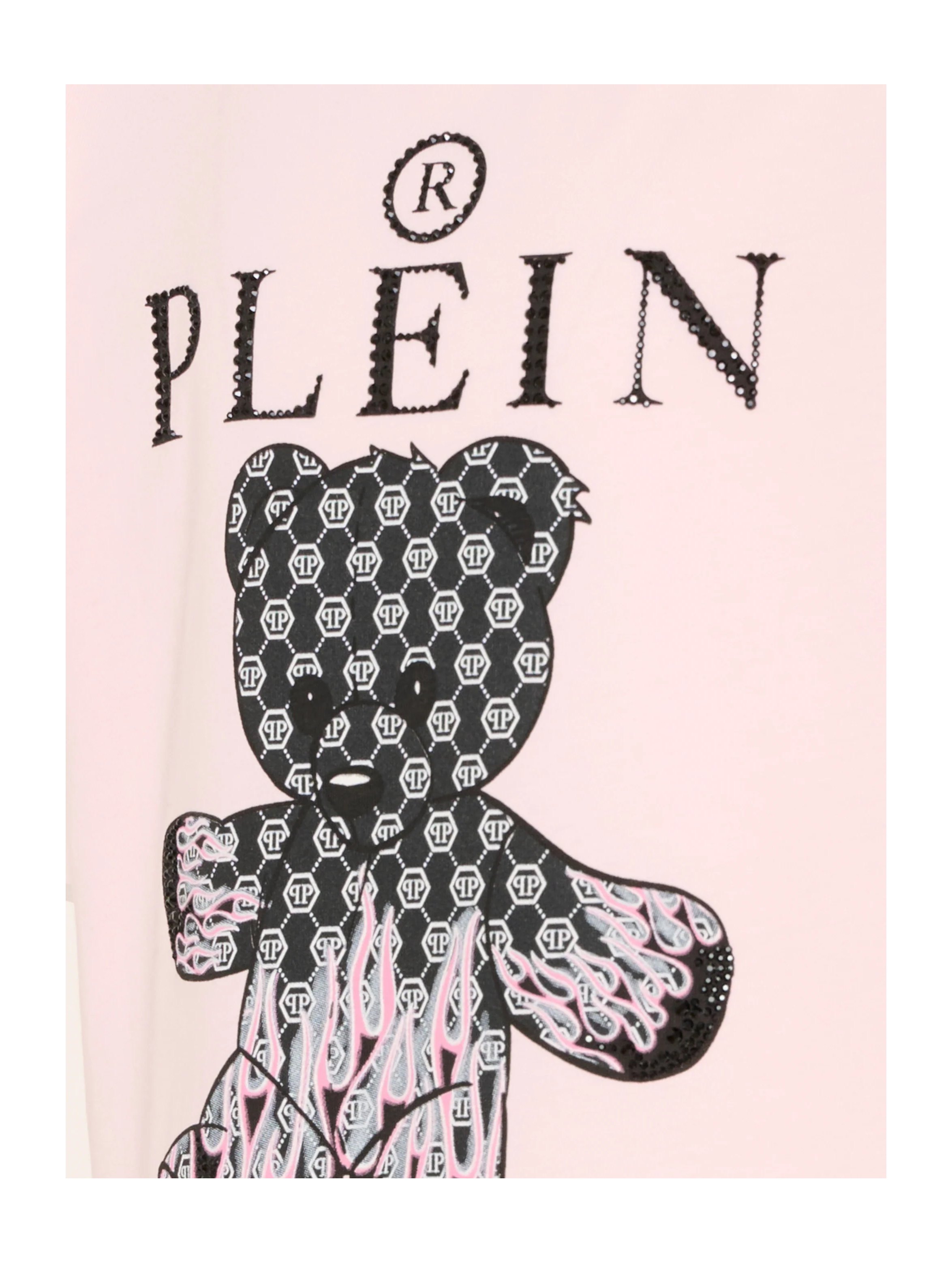 T-shirt a maniche corte in confortevole jersey, con scollo rotondo, a tinta unita, con flag logata sul fianco, piccolo logo PP esagonale sul retro, maxi logo lettering a contrasto sul fronte ricoperto di strass in tinta e maxi stampa grafica di iconico orsetto logato con fiamme e dettagli in strass sul davanti. Per un look fashion e cool. PHILIPP PLEIN