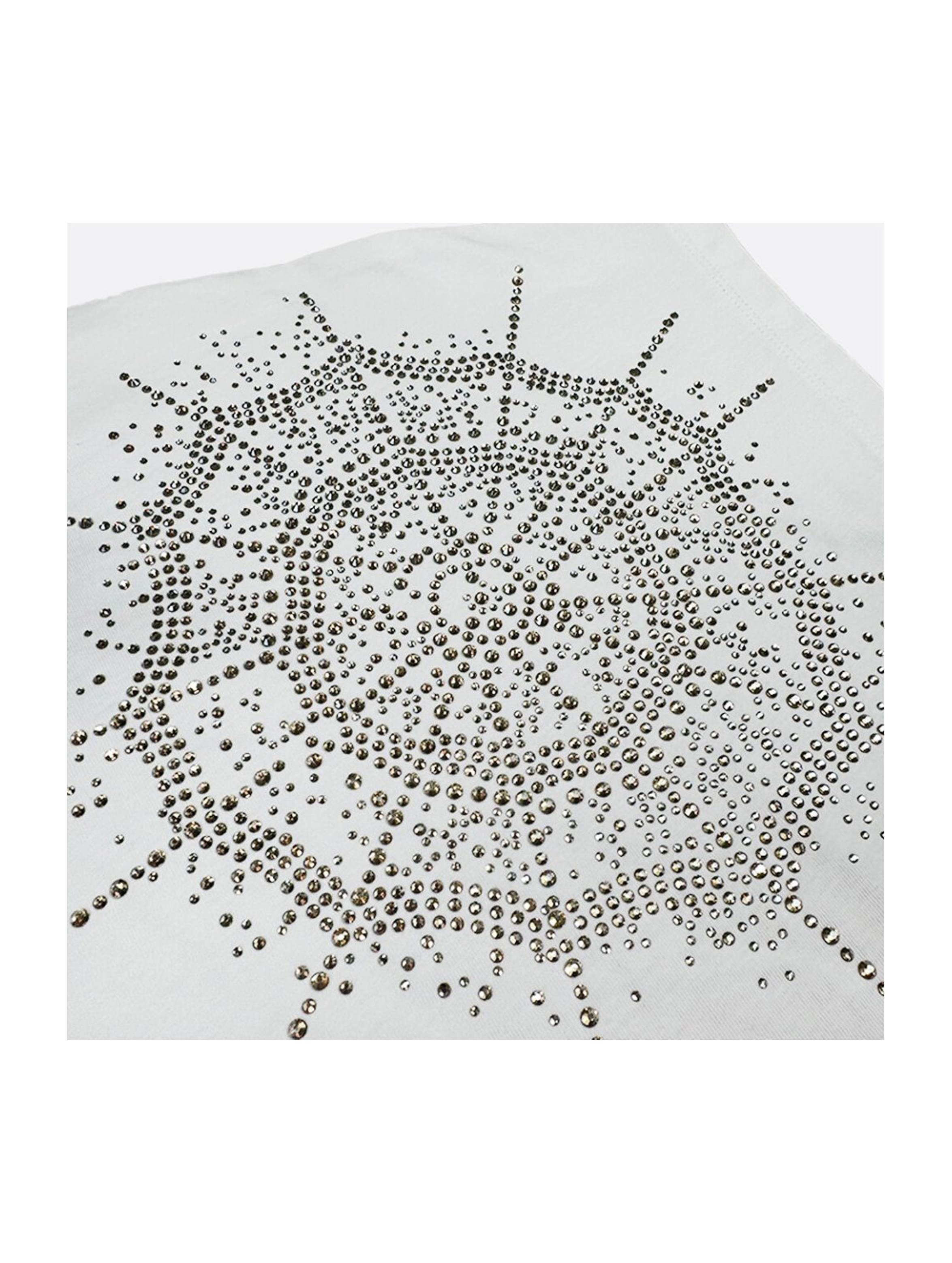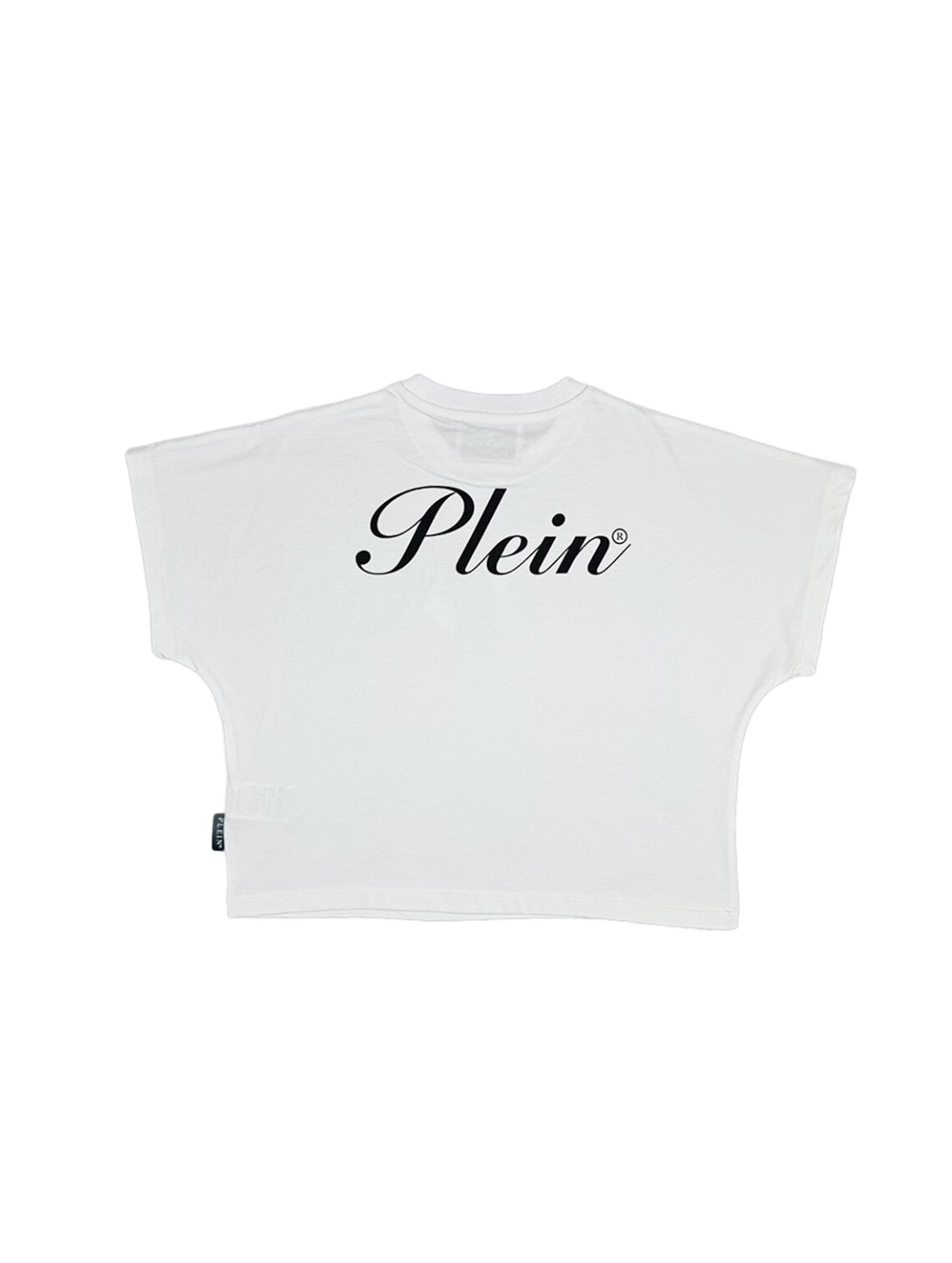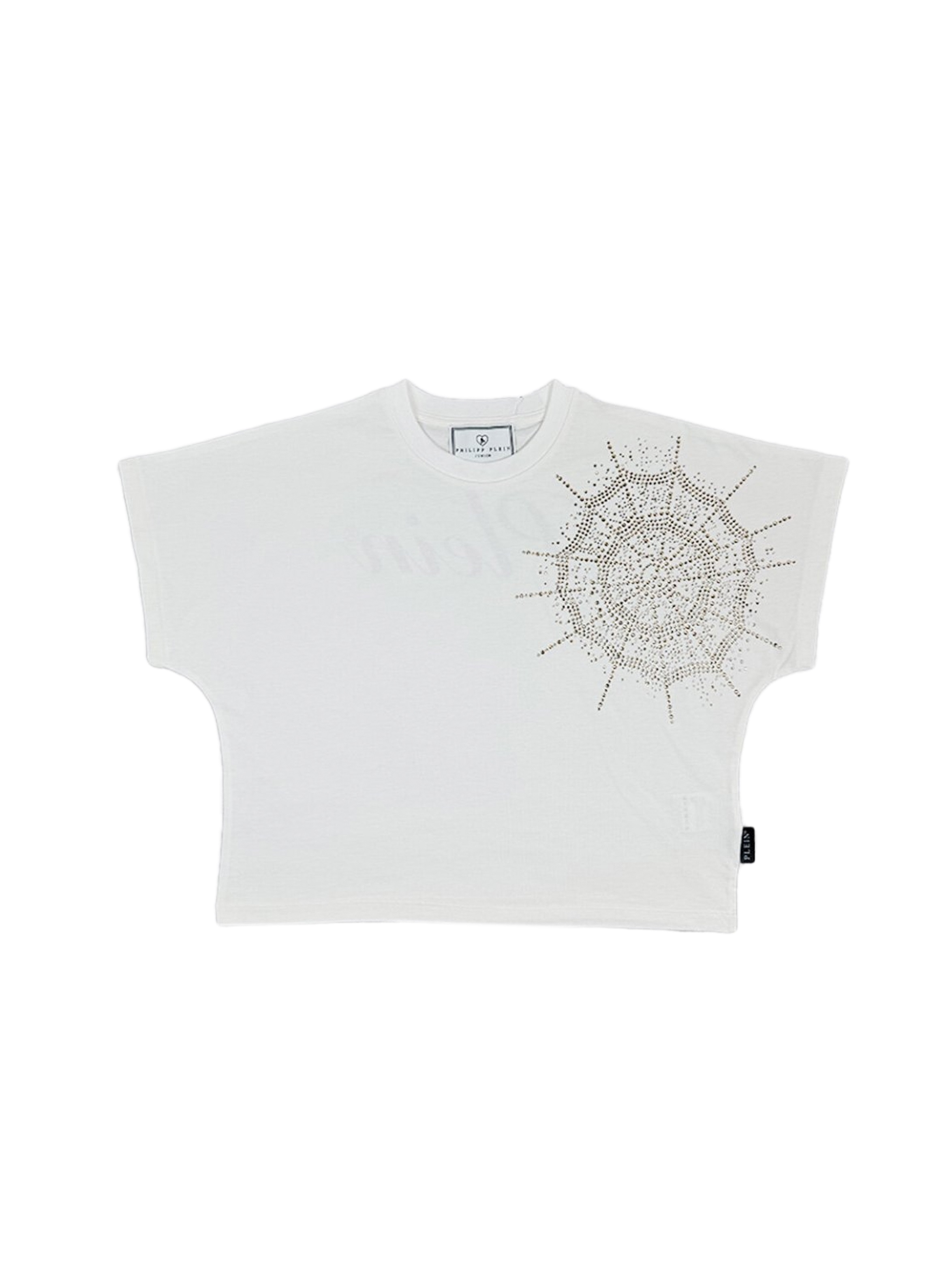 T-shirt a maniche corte in confortevole jersey, con scollo rotondo, a tinta unita, con flag logata sul fianco, maxi logo lettering a contrasto sul retro e particolare grafica ragnatela in strass sul lato superiore. Per un look fashion e cool. PHILIPP PLEIN