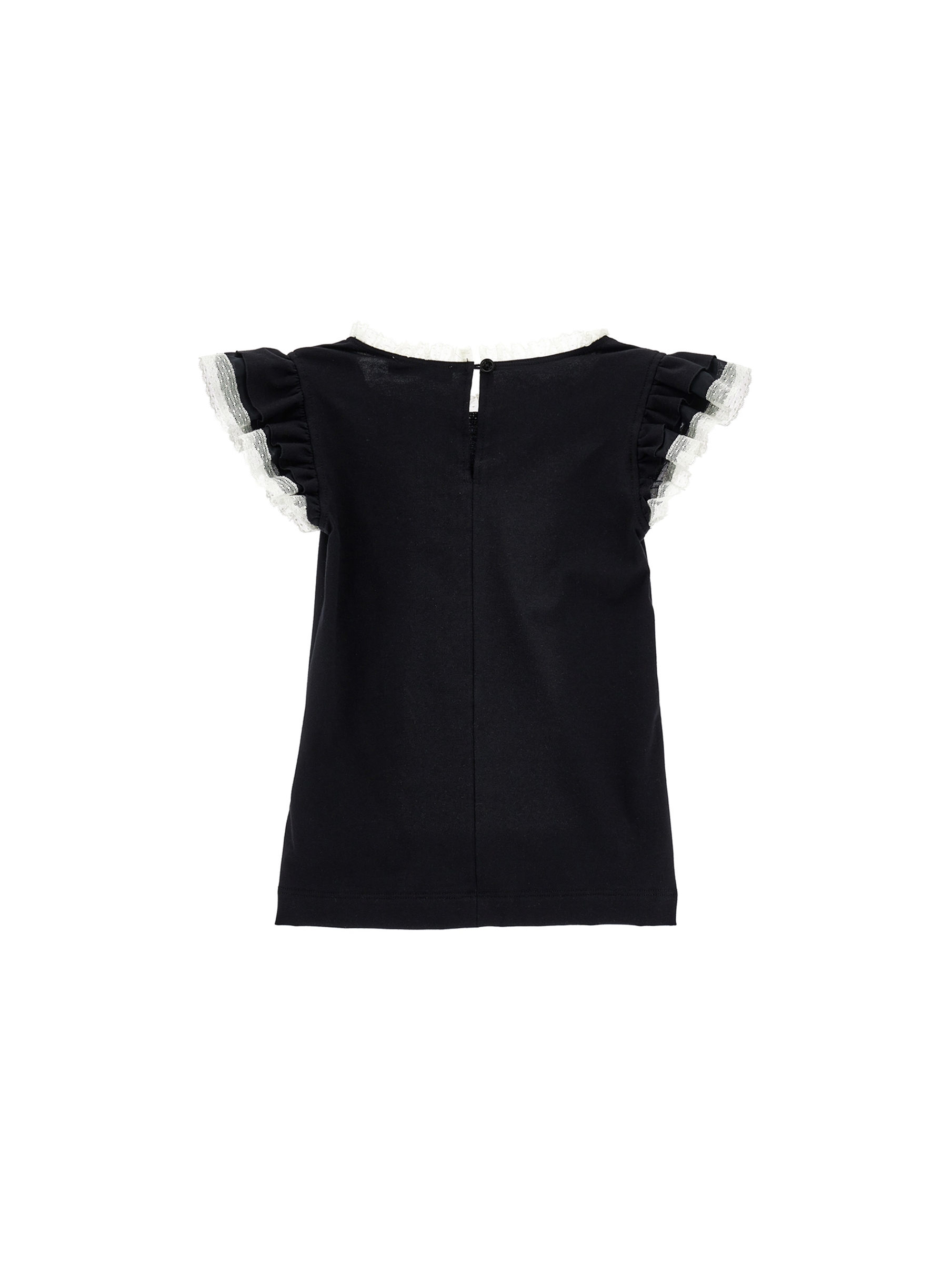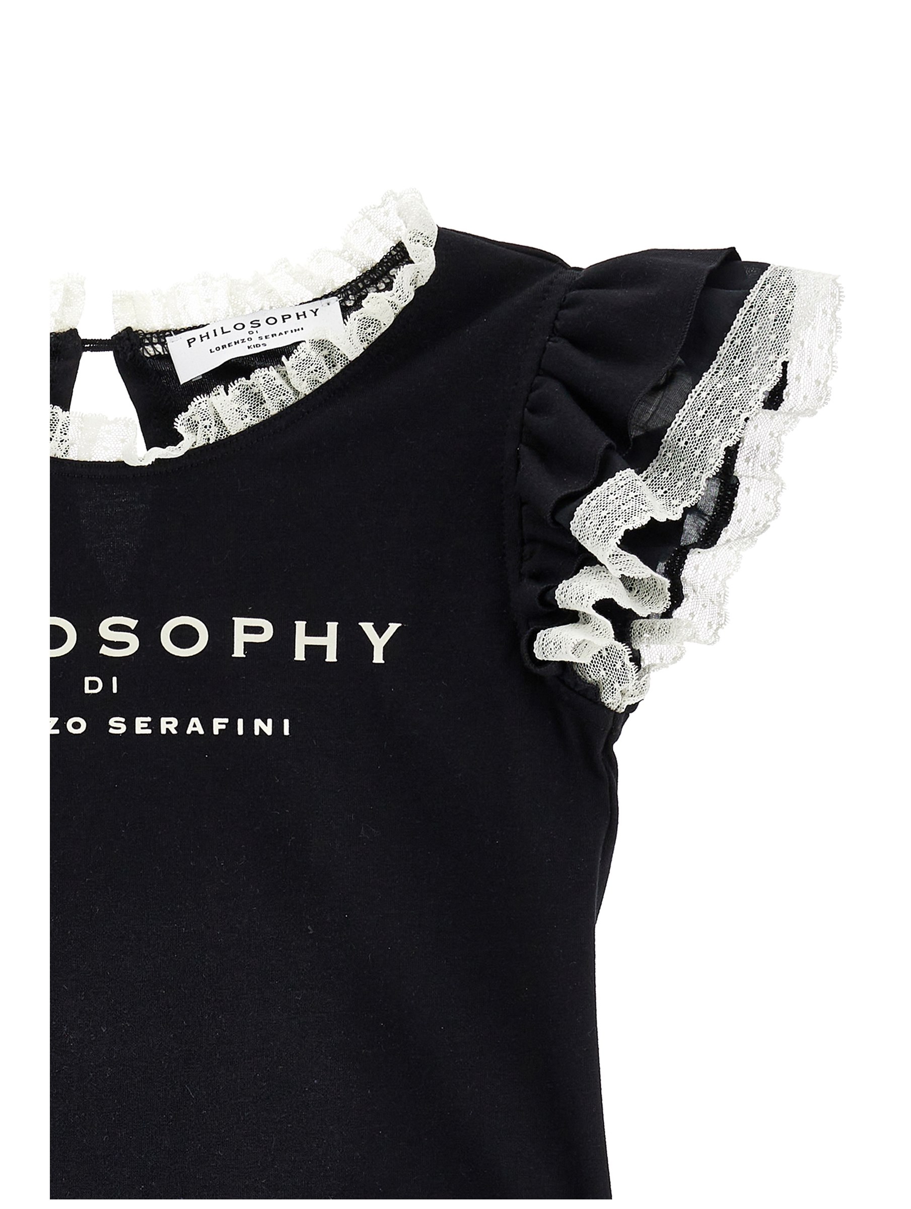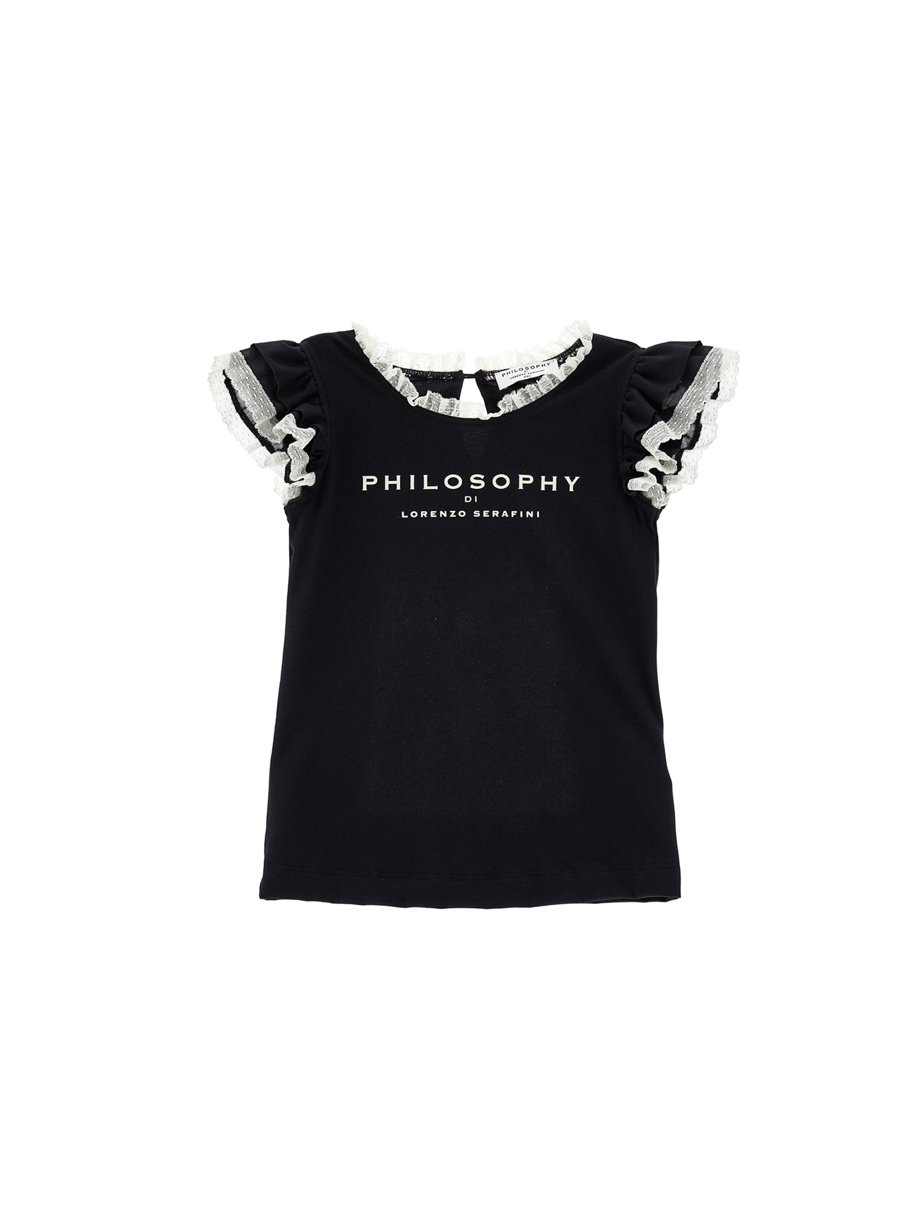 T-shirt in confortevole jersey di cotone, a tinta unita, con scollo rotondo bordato di rouches in pizzo a contrasto, maniche corte con volants in pizzo a contrasto, chiusura a goccia con bottoncino sul retro e logo lettering stampato a contraso sul davanti. Per un look casual e fashion. PHILOSOPHY