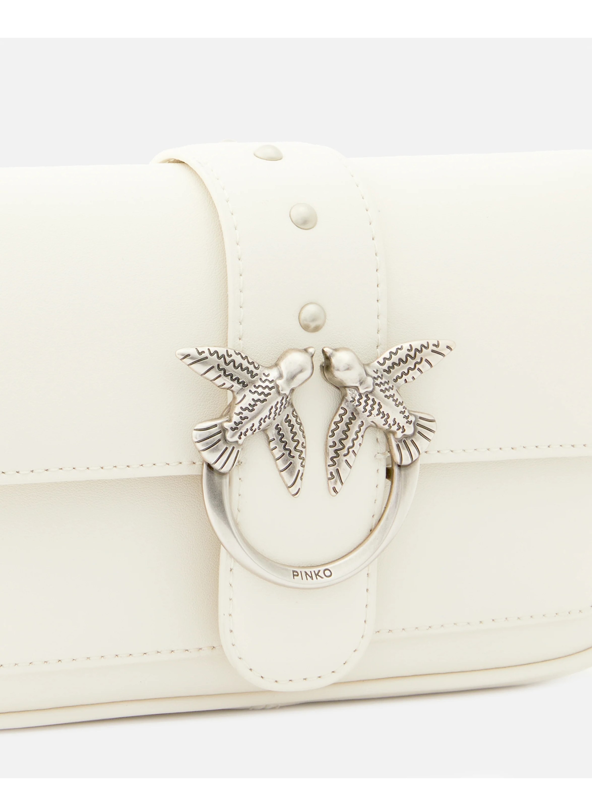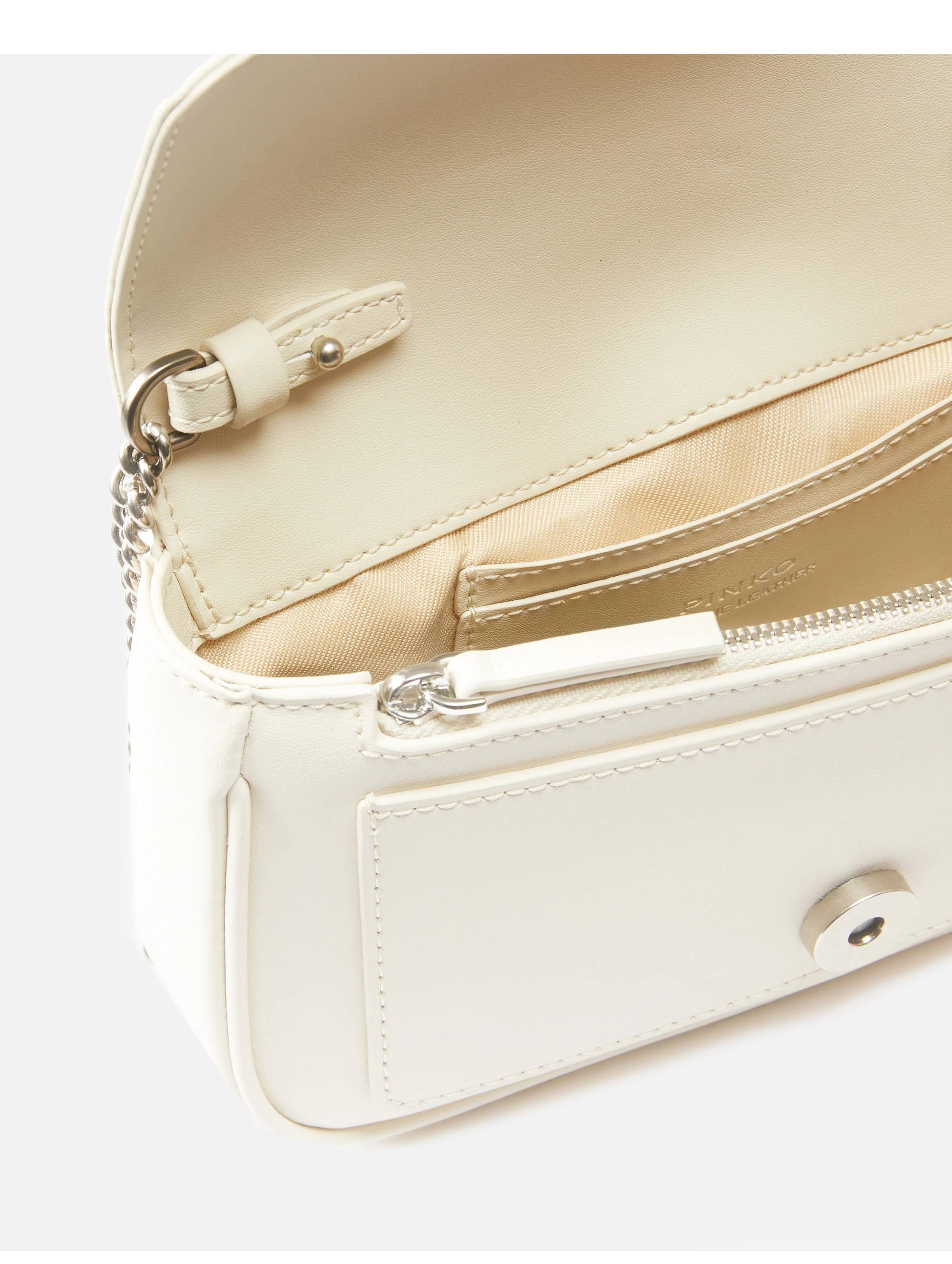 Borsa a tracolla piccola, realizzata in morbida pelle mano seta, con interno foderato, tasca interna con zip e spazi per carte di credito, tracolla removibile in catena sottile e completata da una chiusura con patta impreziosita da piccole borchie e dall'iconica fibbia in metallo Love Birds Diamond Cut. Per look trendy e chic. PINKO